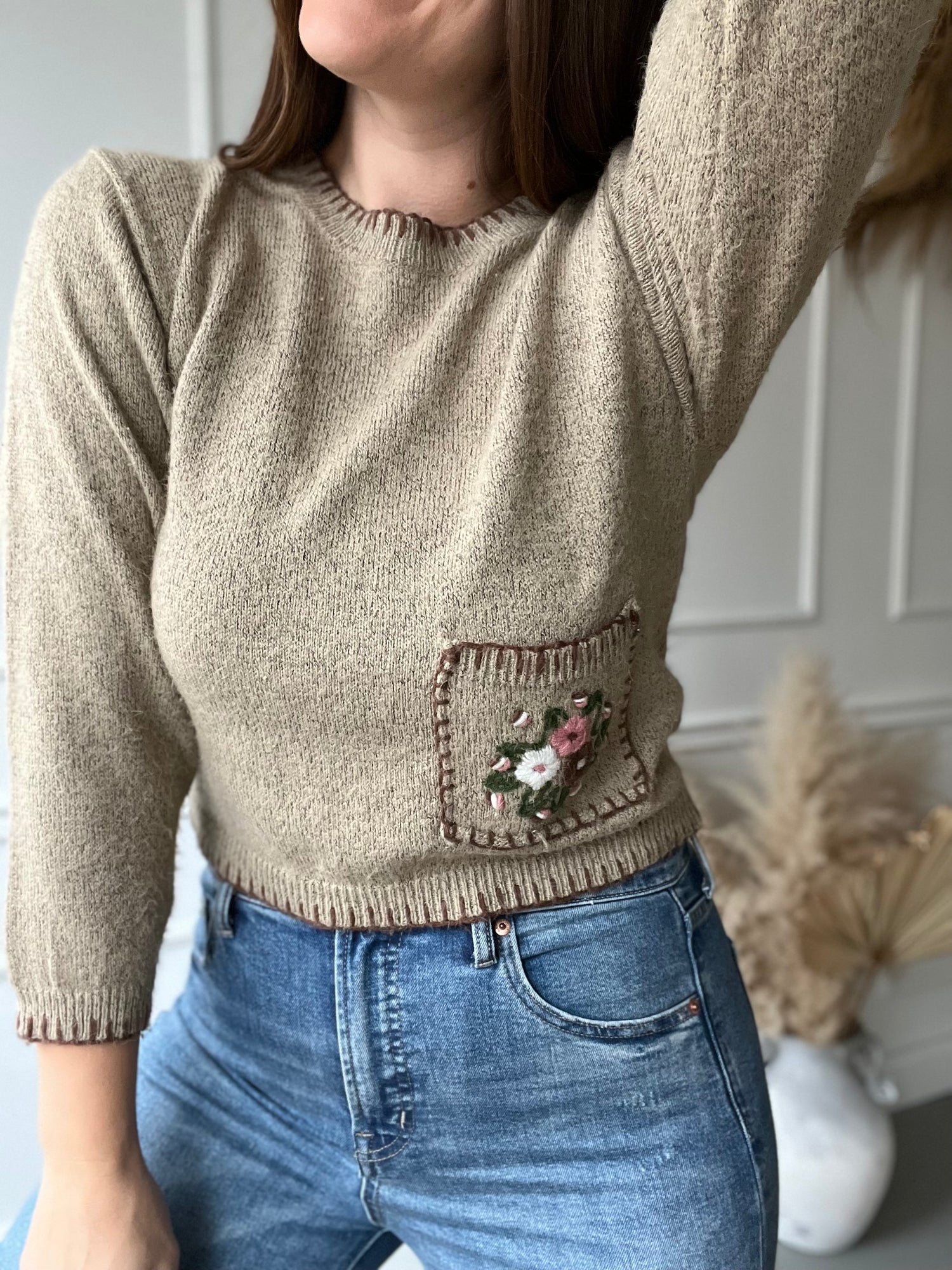 A neutral crop knit with a hand-embroidered floral front pocket. Chocolate brown trim, lightweight.