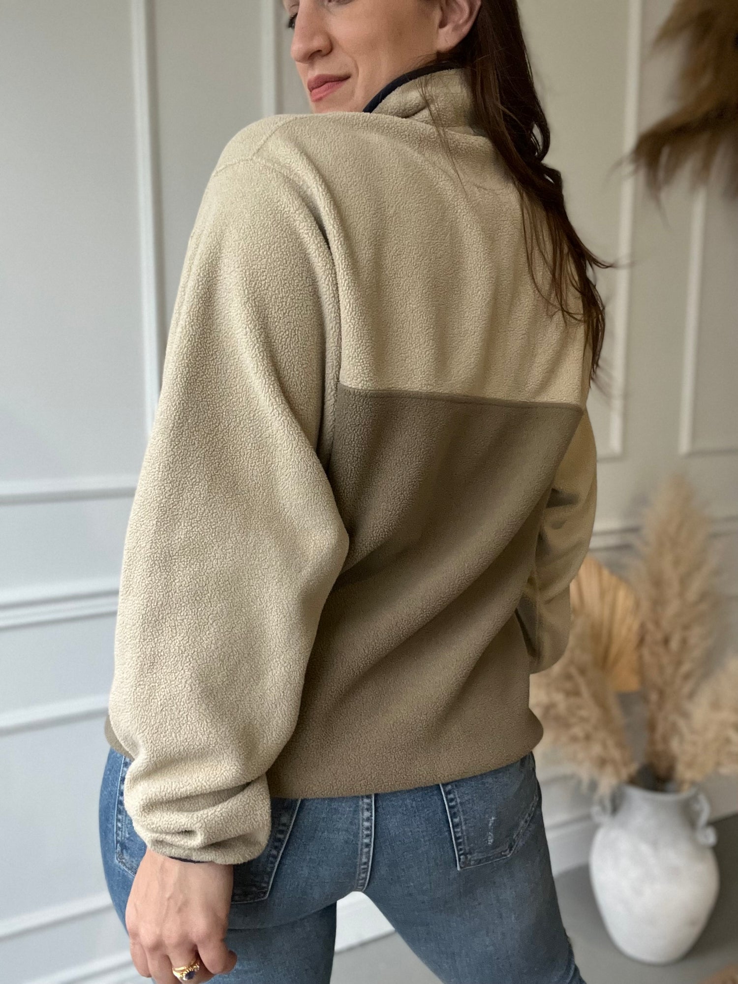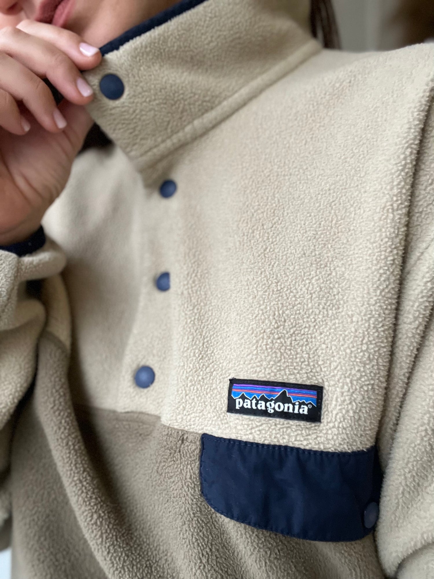 Warm and durable, the Patagonia Synchilla® recycled polyester pullover is what made fleece famous, with a classic Snap-T® pocket and placket. Fair Trade Certified™ sewn. Colours are oatmeal, dark beige and navy blue detailing.