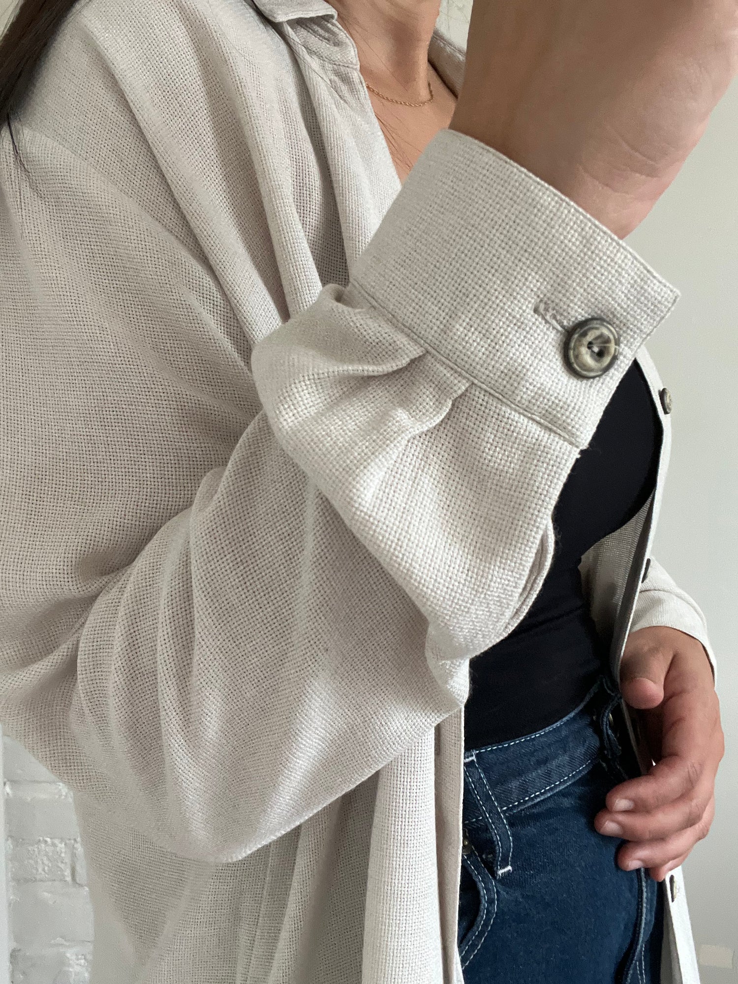 For the chilly mornings, the patio hangs, and the easy-breezy effortless moments - this shirt is for you. A beautiful, waffle beige button up with vintage wooden buttons, One front pocket, and small slit long the side. Wear buttoned up, or open with a shirt. It doesn't get more comfortable than this.