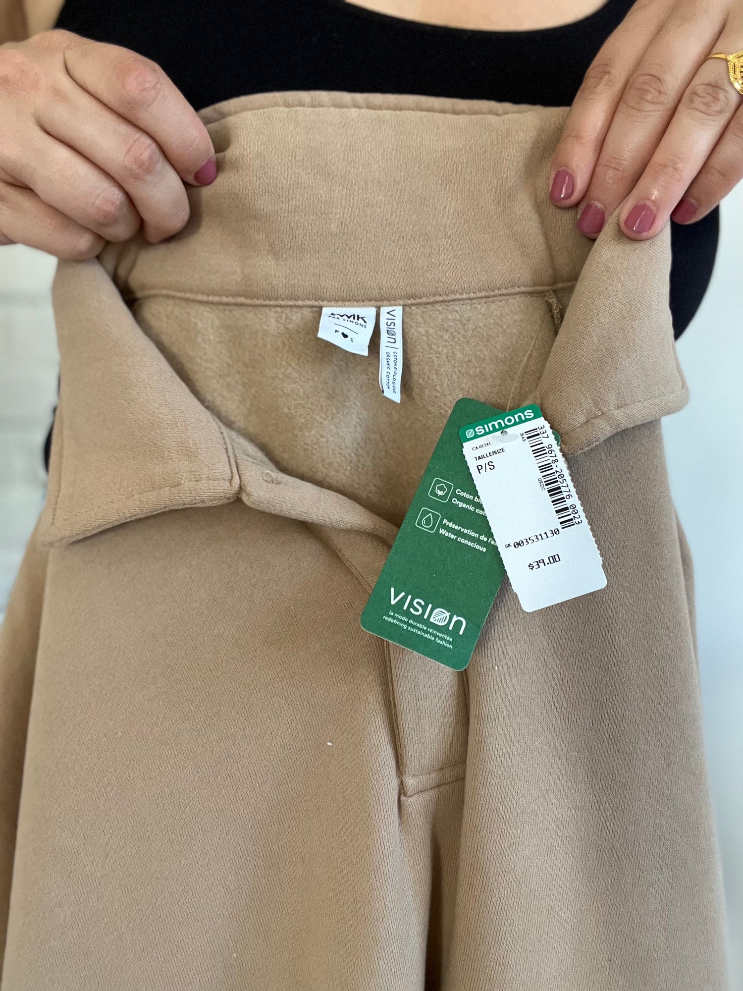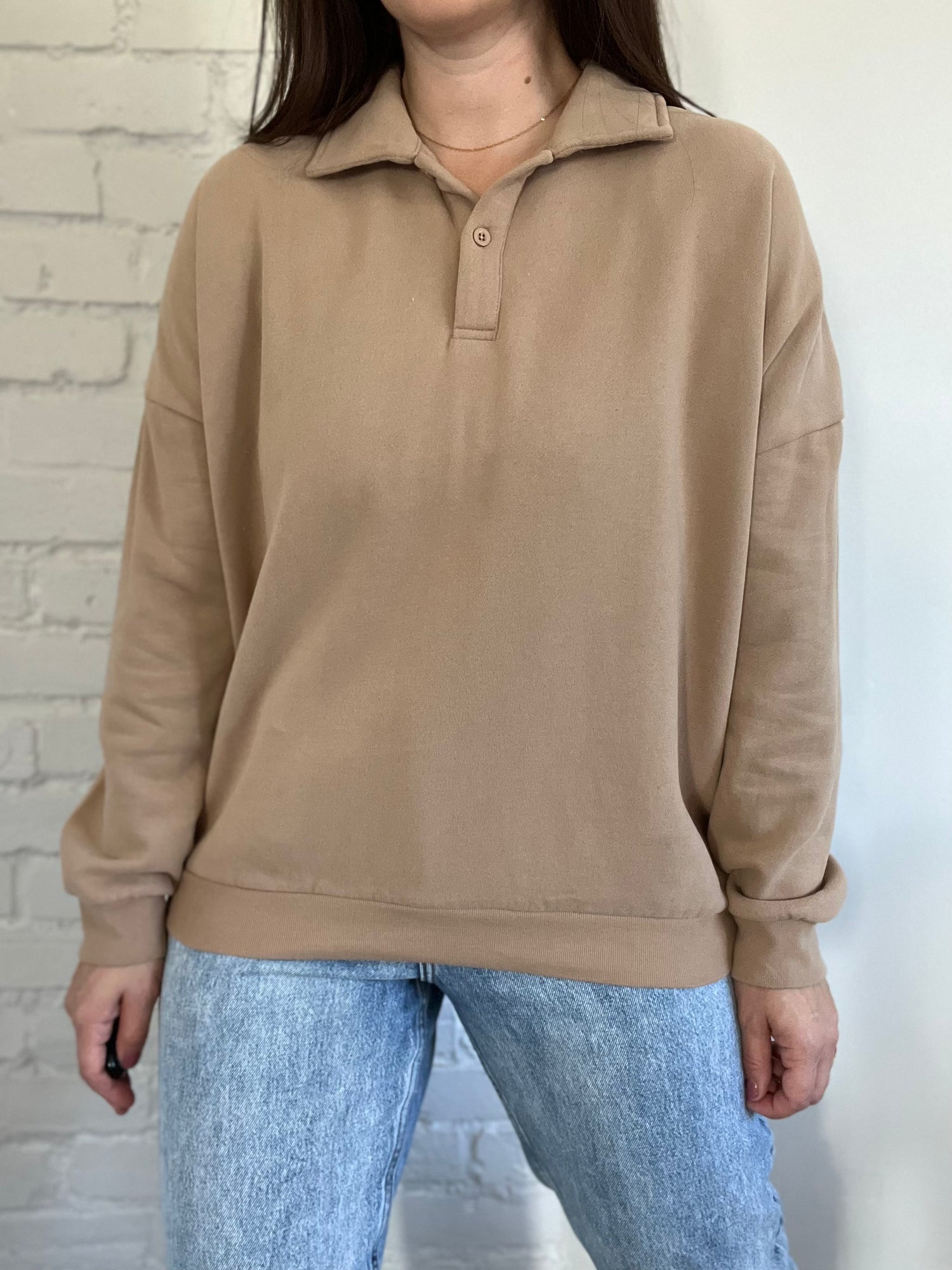 An brand new with tags, oversized, relaxed cotton quarter zip sweater. Dark beige in colour, with a one-button top of chest closure and collar. Super fuzzy and warm on the inside, this never-been-worn piece of clothing is an every-day fit. Tagged a size small, but is very oversized. I am a large, and it fits me with lots of room.