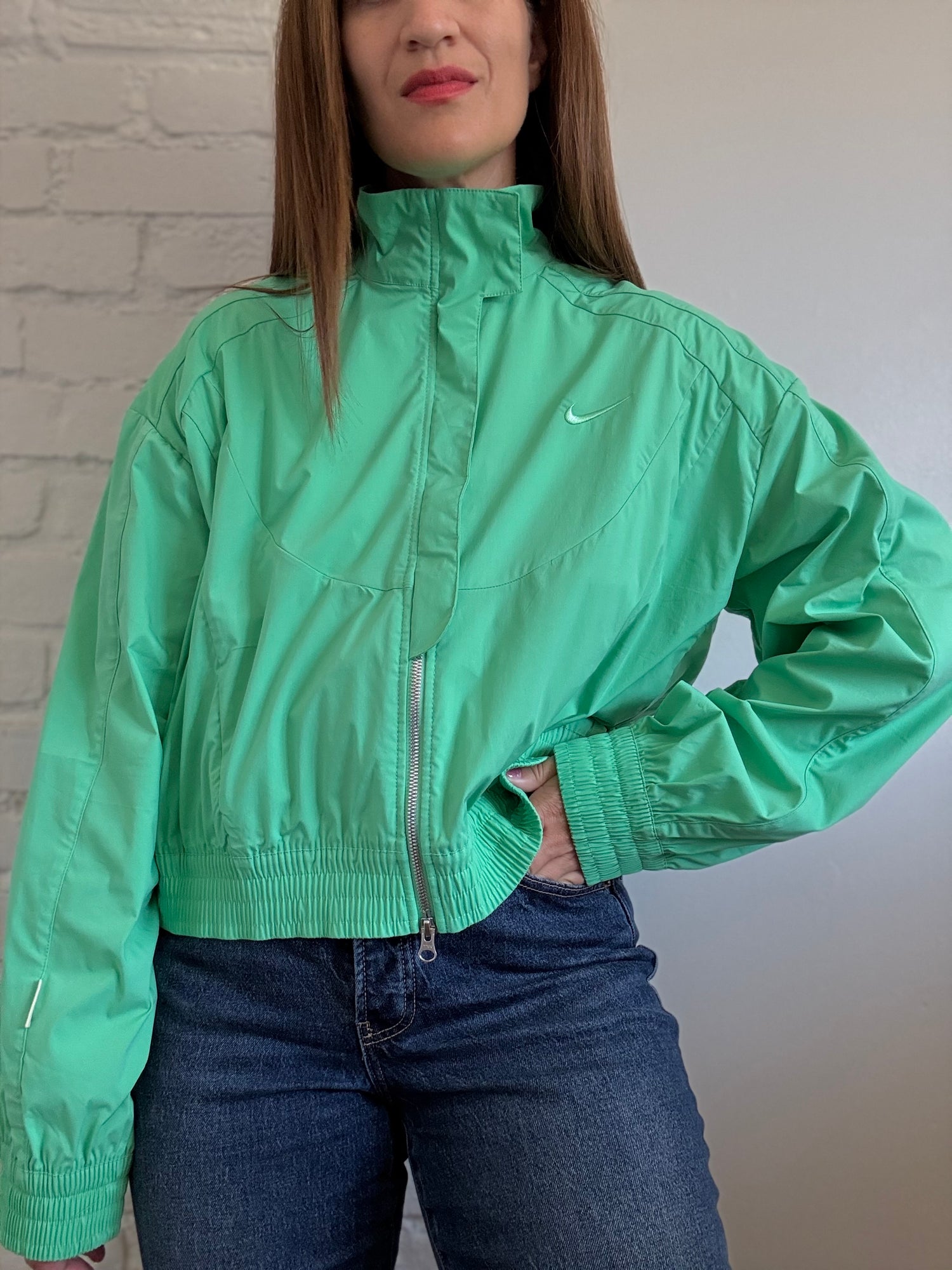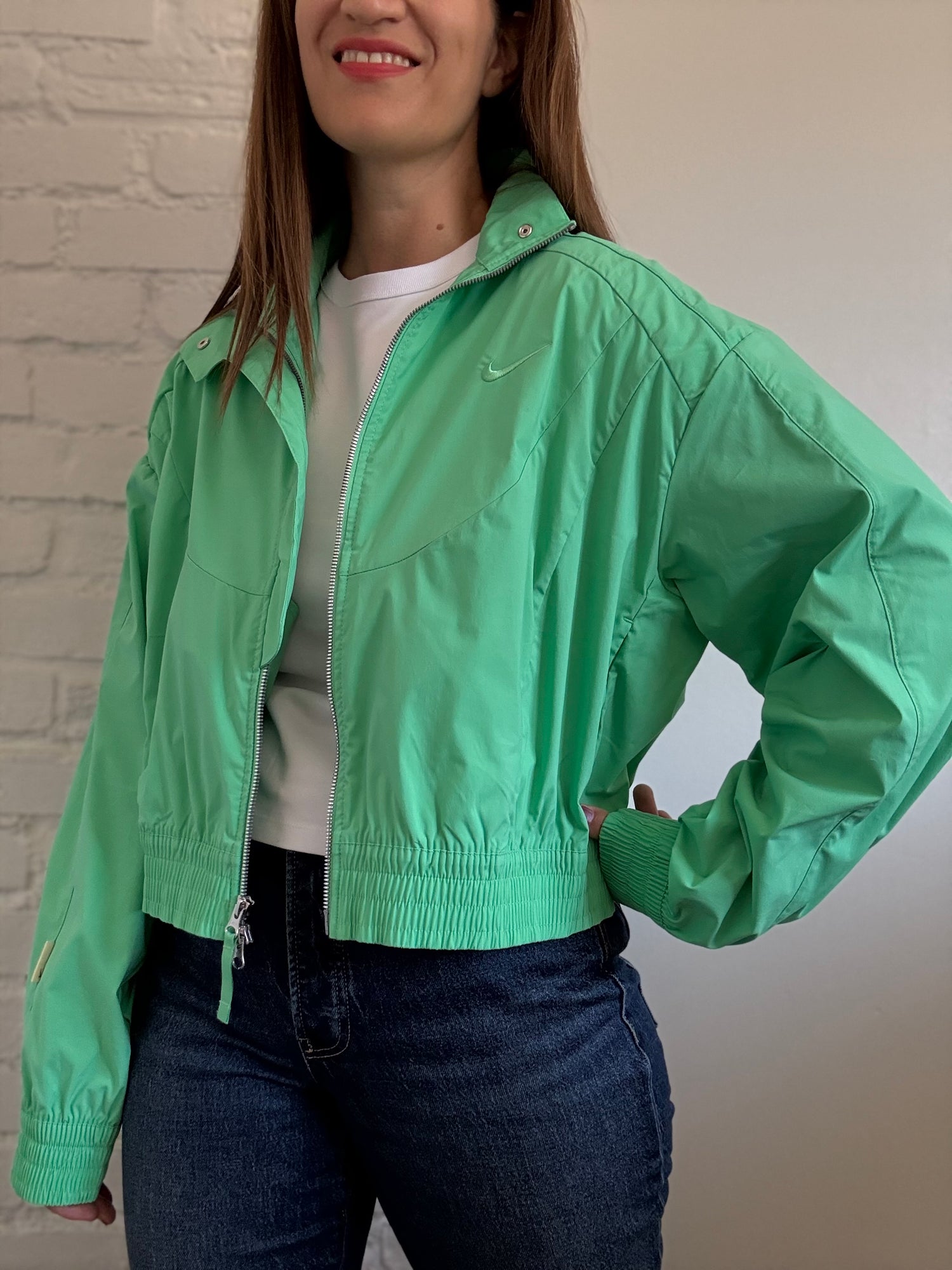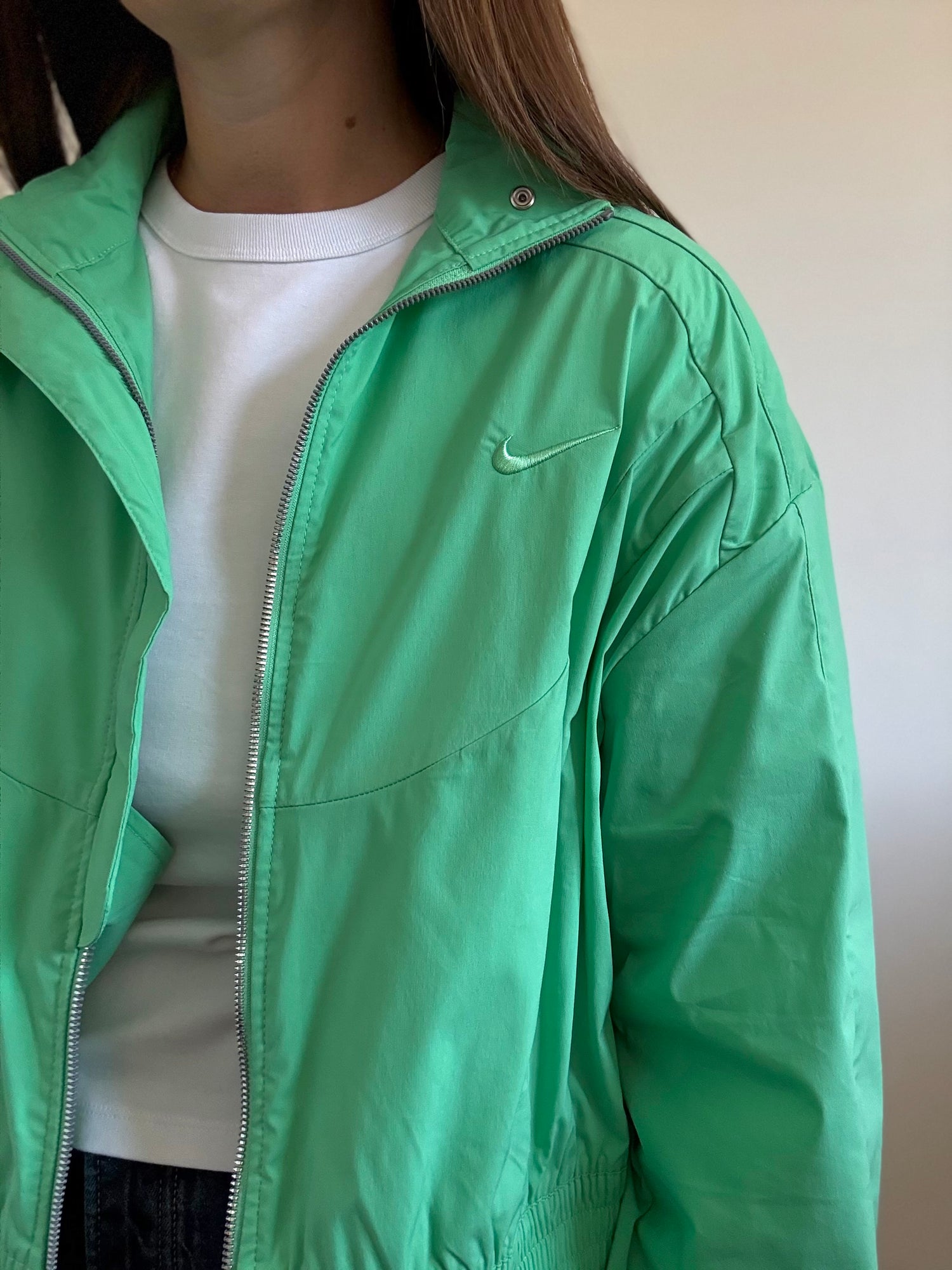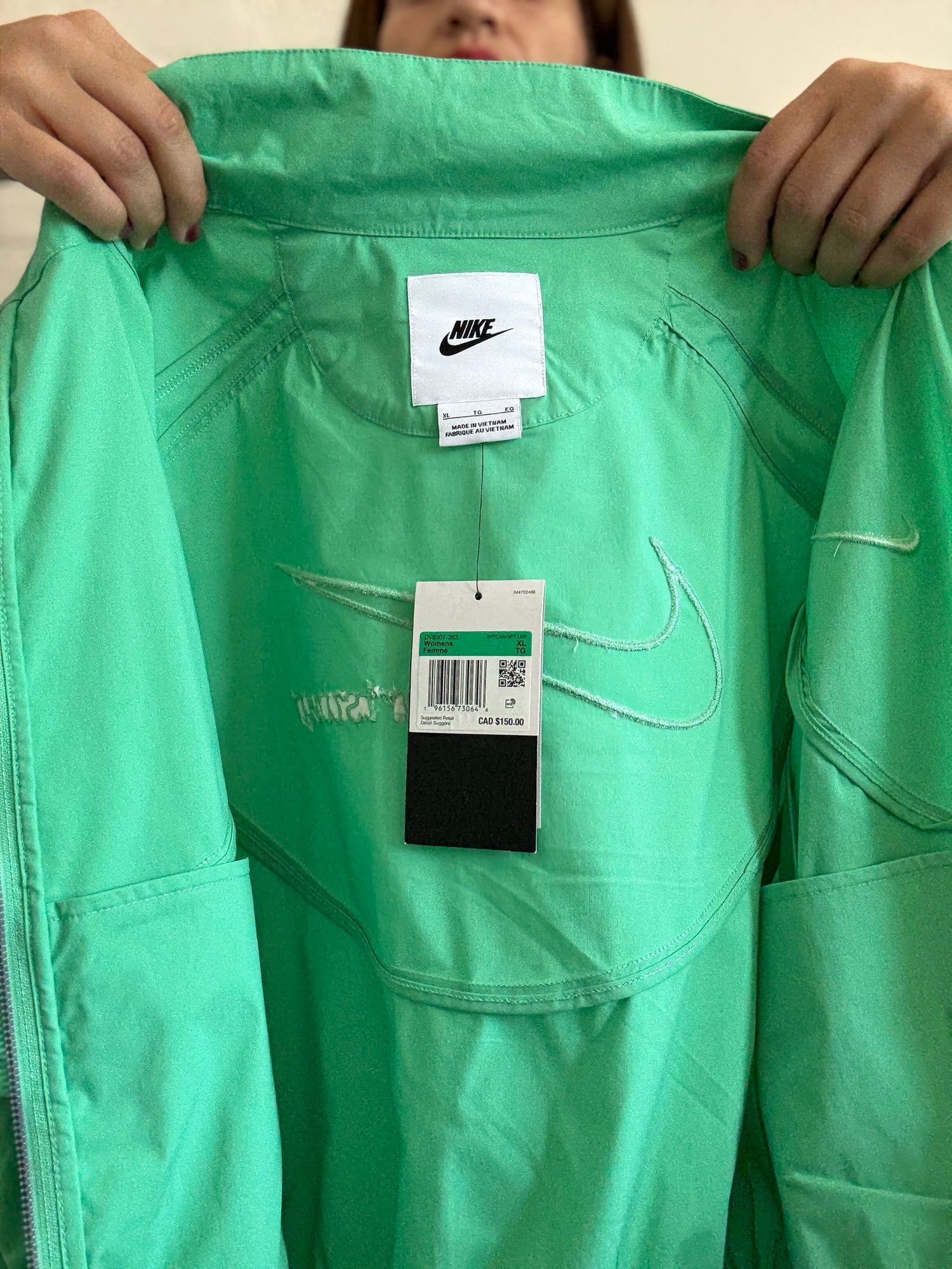Brand new with tags, this Nike Sportwear woven jacket in a light emerald green is ready to shine. Layer up, and get out there in this oversized lightweight woven jacket. Inspired by the Nike heritage Sportswear its design refreshes a staple with panel details that help reshape your sporty wardrobe. 2-way zipper lets you style with ease. Elastic hem and sleeve cuffs, keeping this jacket in place. Unlined, and pockets for small essentials. Retails for $150 CDN.
