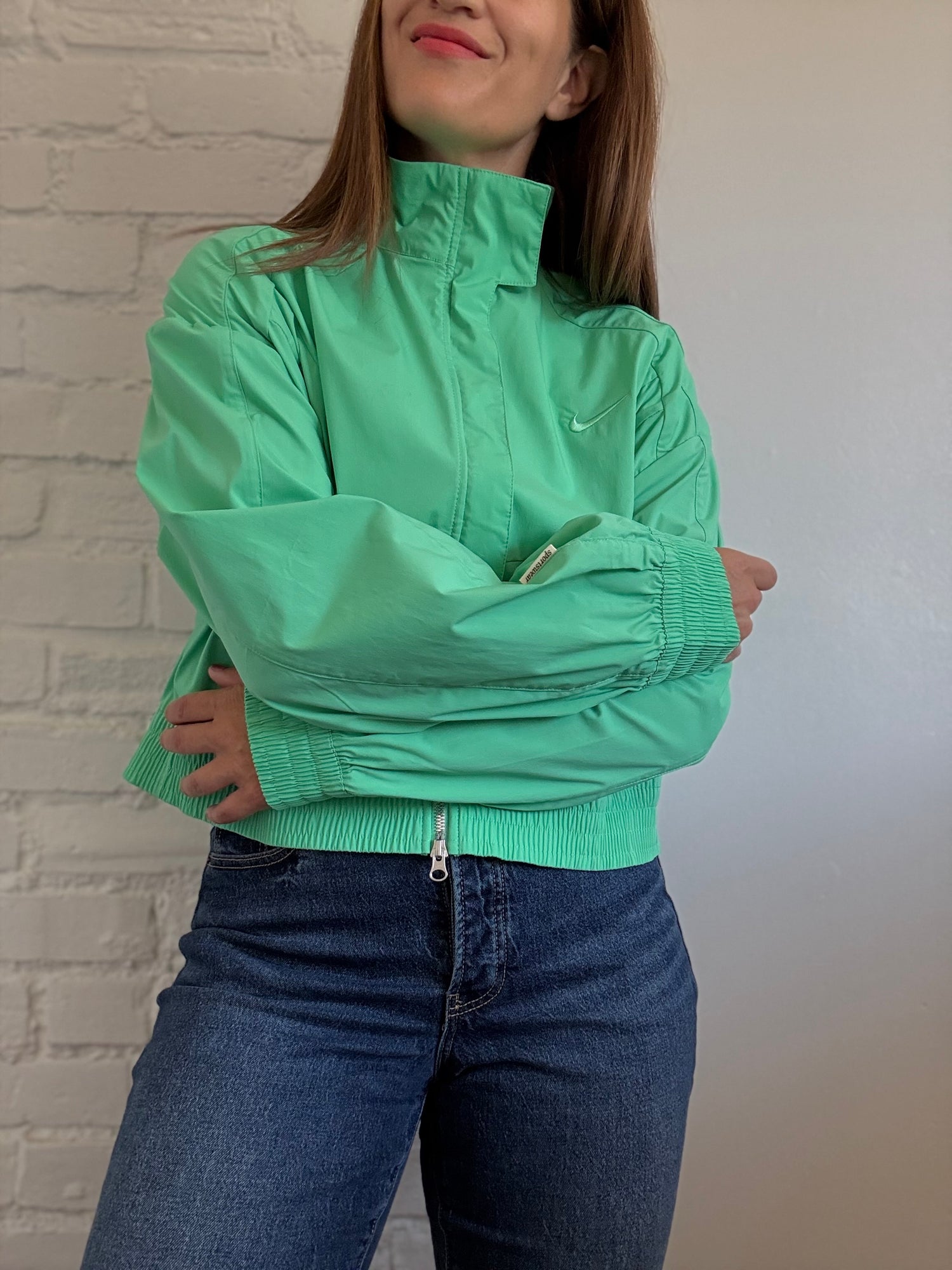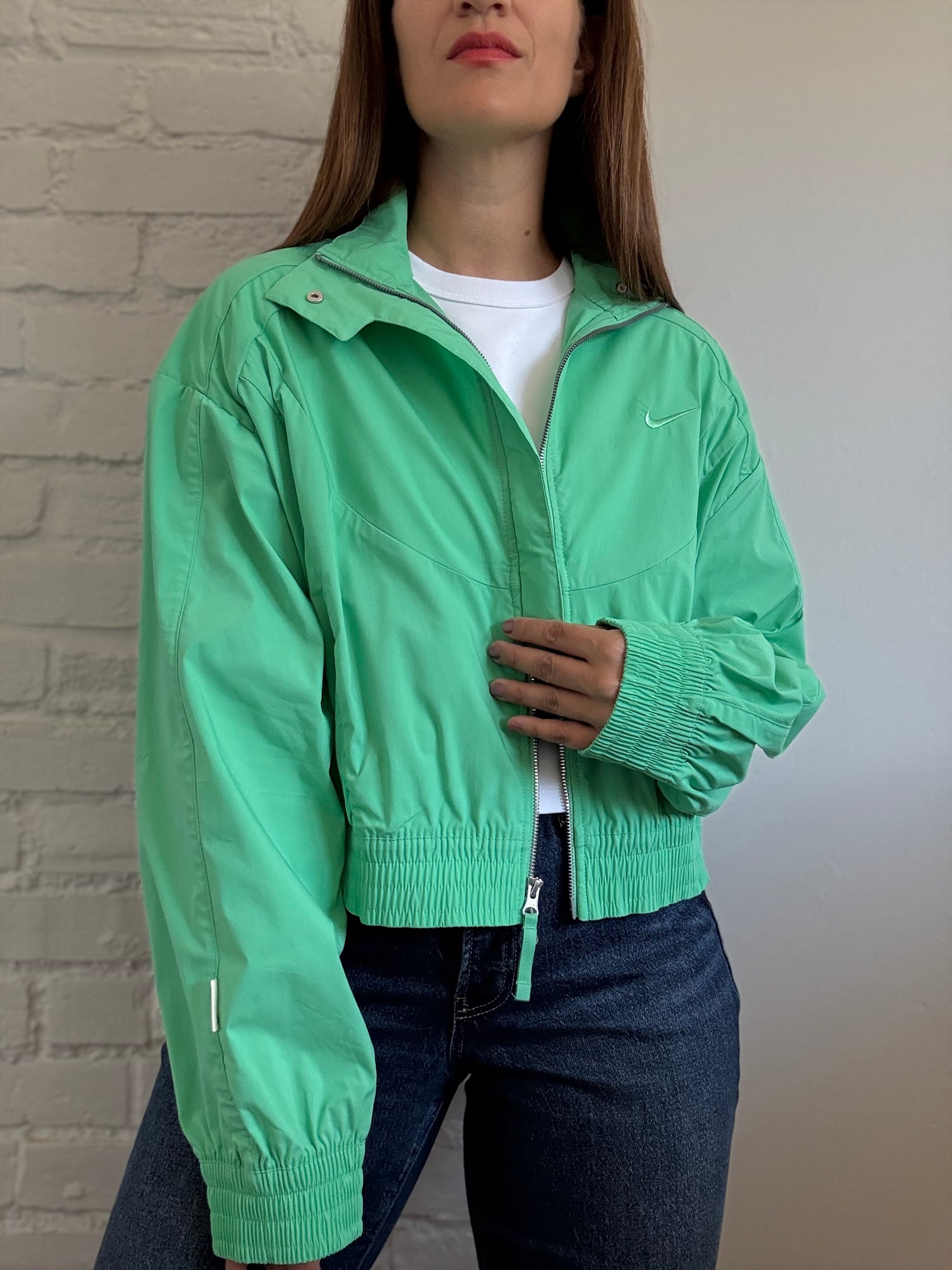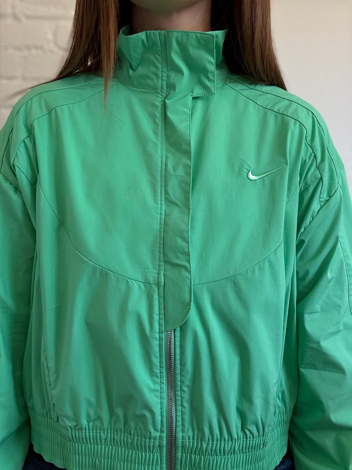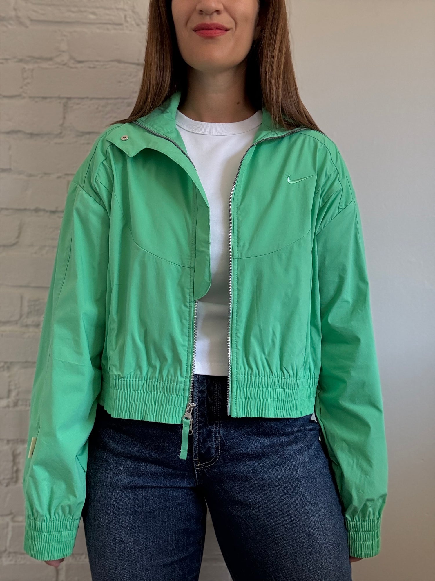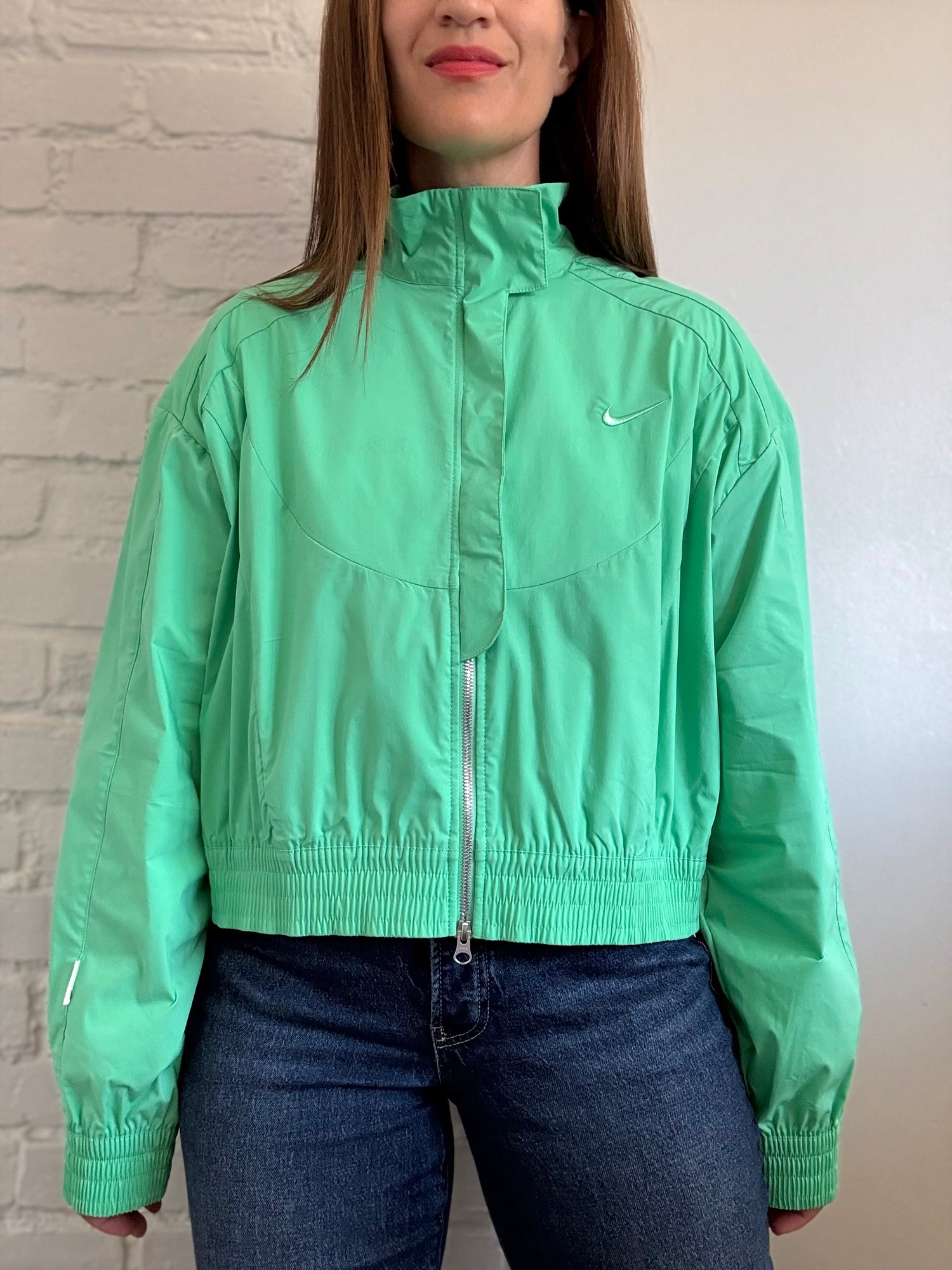 Brand new with tags, this Nike Sportwear woven jacket in a light emerald green is ready to shine. Layer up, and get out there in this oversized lightweight woven jacket. Inspired by the Nike heritage Sportswear its design refreshes a staple with panel details that help reshape your sporty wardrobe. 2-way zipper lets you style with ease. Elastic hem and sleeve cuffs, keeping this jacket in place. Unlined, and pockets for small essentials. Retails for $150 CDN.