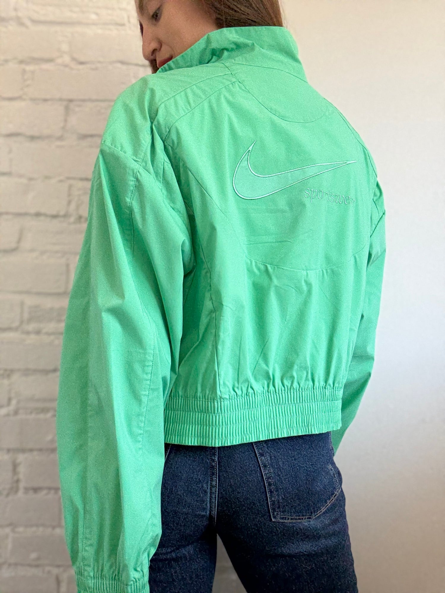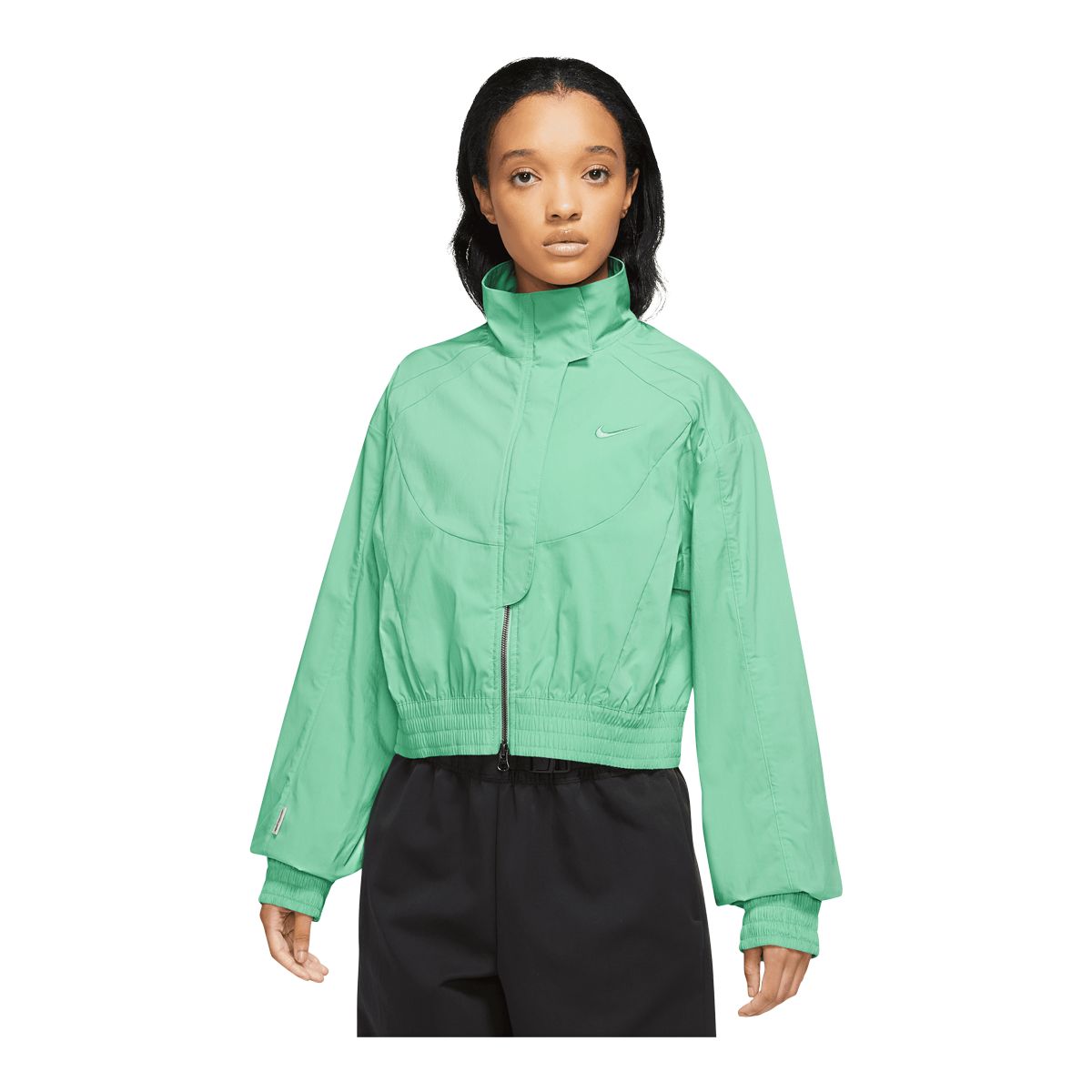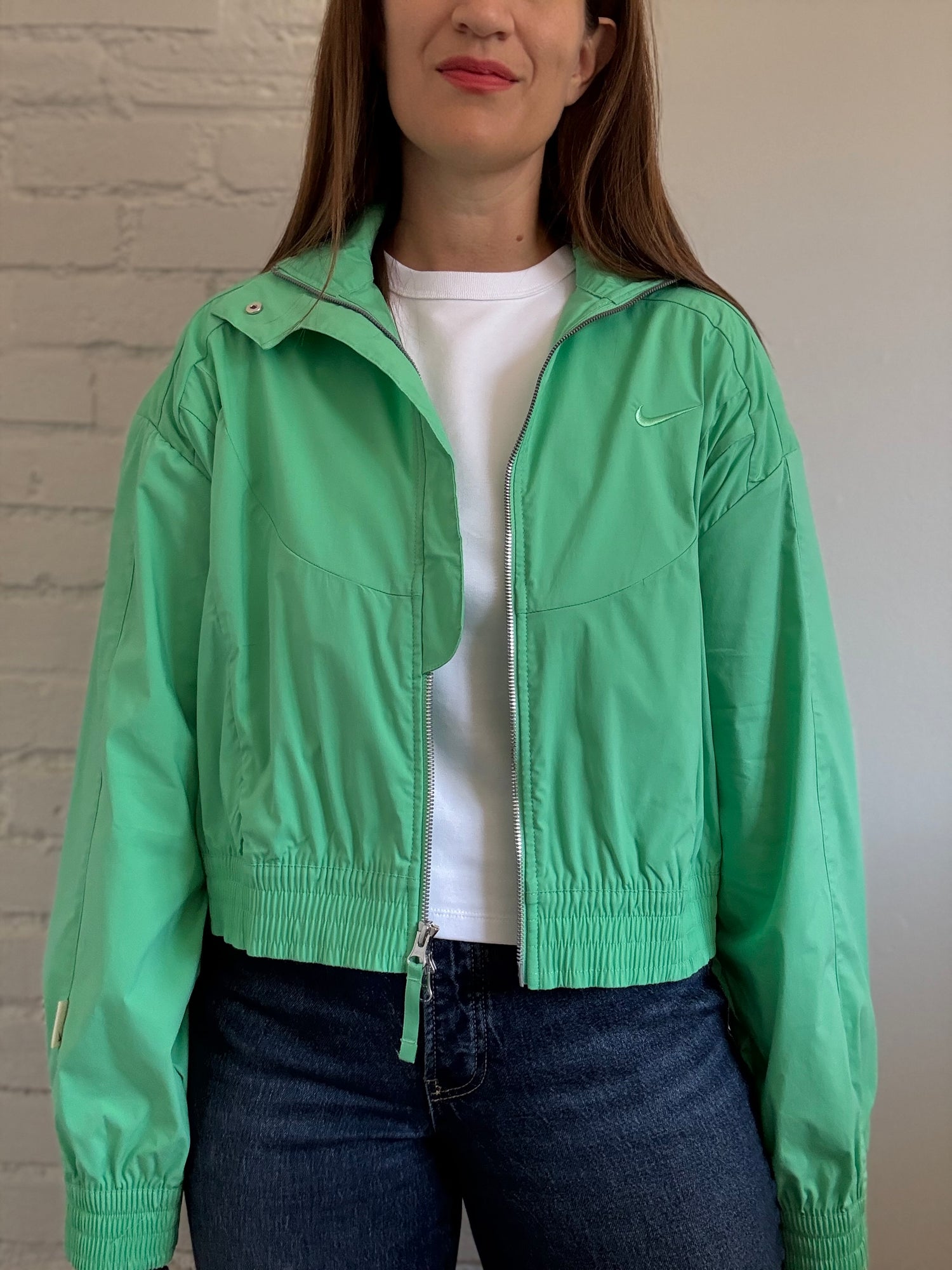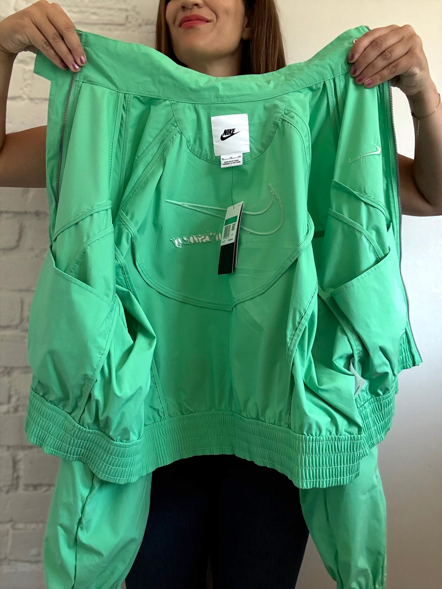 Brand new with tags, this Nike Sportwear woven jacket in a light emerald green is ready to shine. Layer up, and get out there in this oversized lightweight woven jacket. Inspired by the Nike heritage Sportswear its design refreshes a staple with panel details that help reshape your sporty wardrobe. 2-way zipper lets you style with ease. Elastic hem and sleeve cuffs, keeping this jacket in place. Unlined, and pockets for small essentials. Retails for $150 CDN.