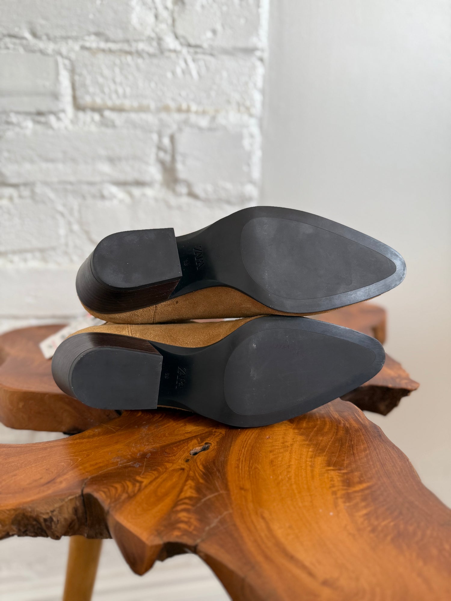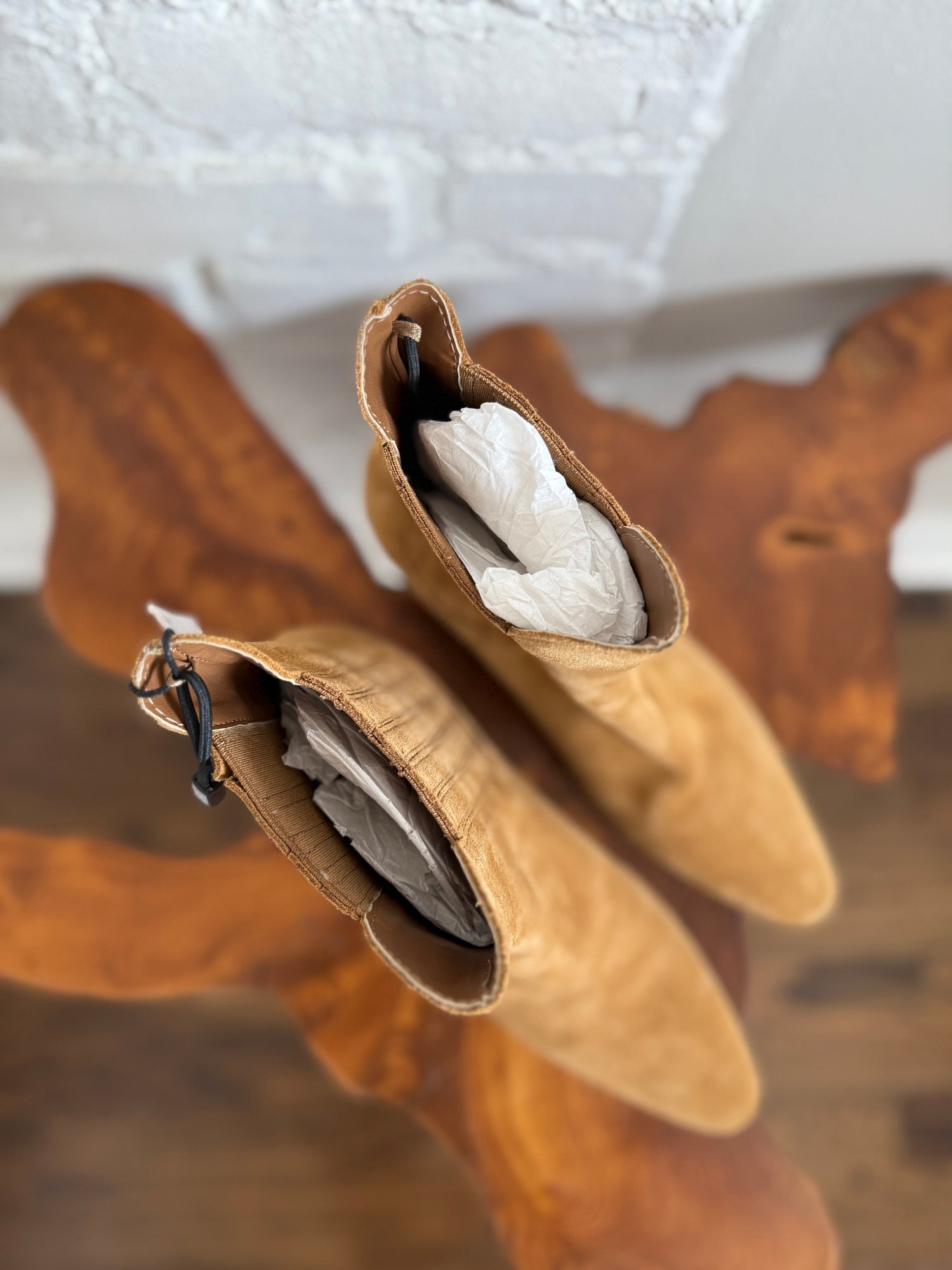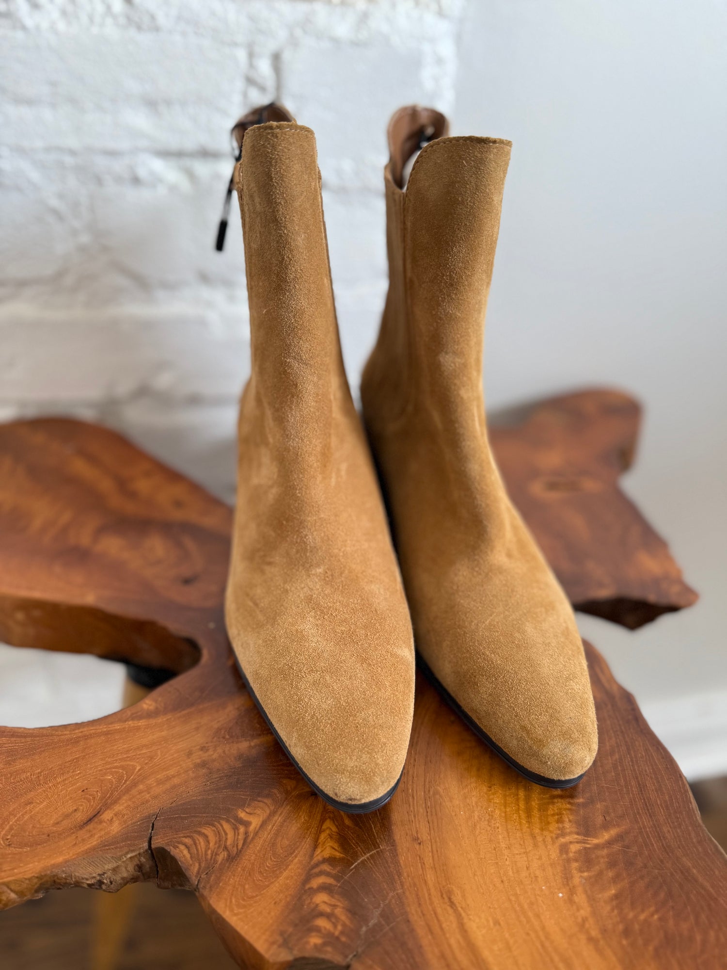 Brand new with tags, a pair of caramel 100% suede leather high ankle boots, with a cowboy-style heel. Slip on style, with expandable material on the side. Retails for $99 CDN or $60 Euro.