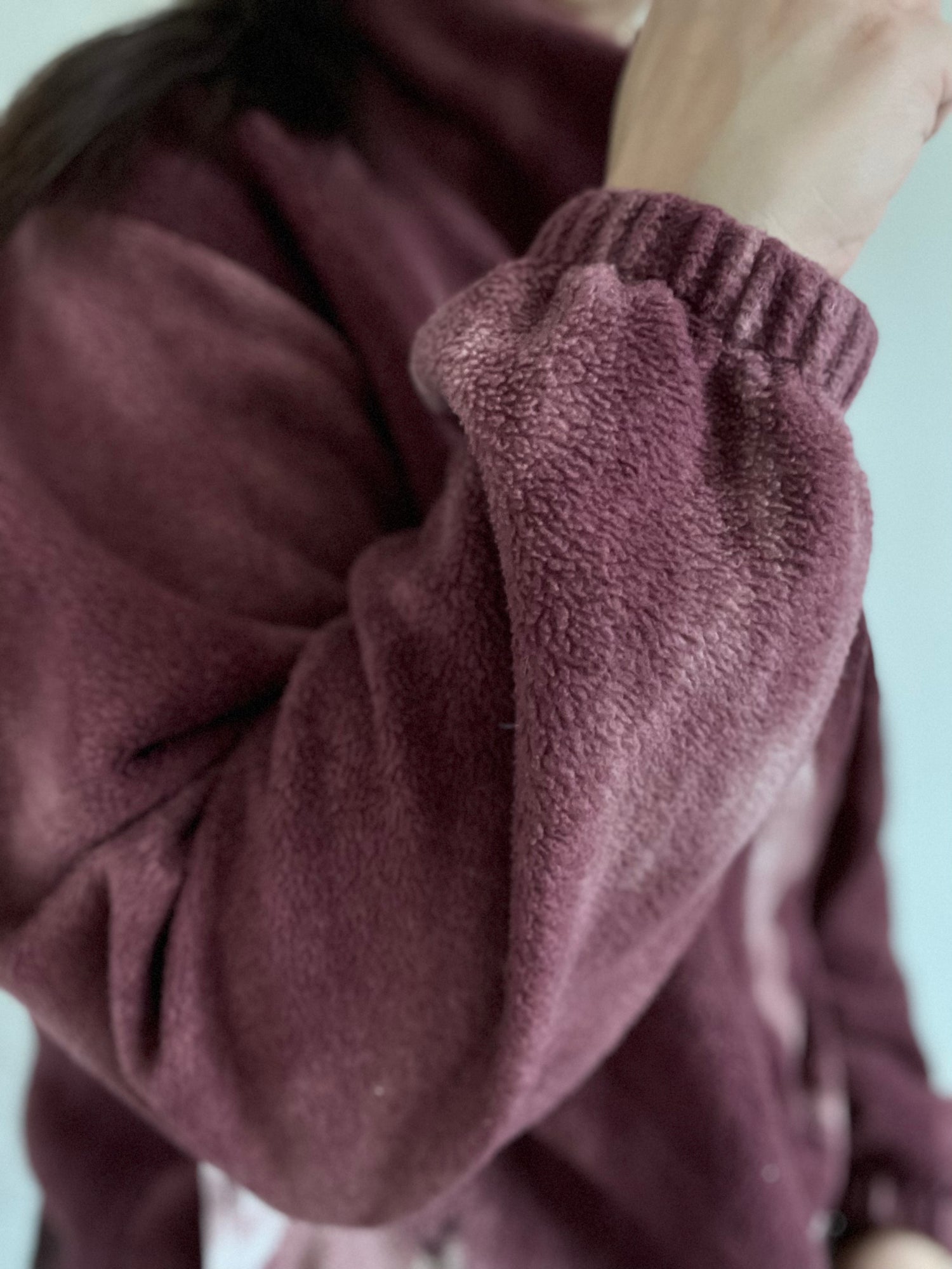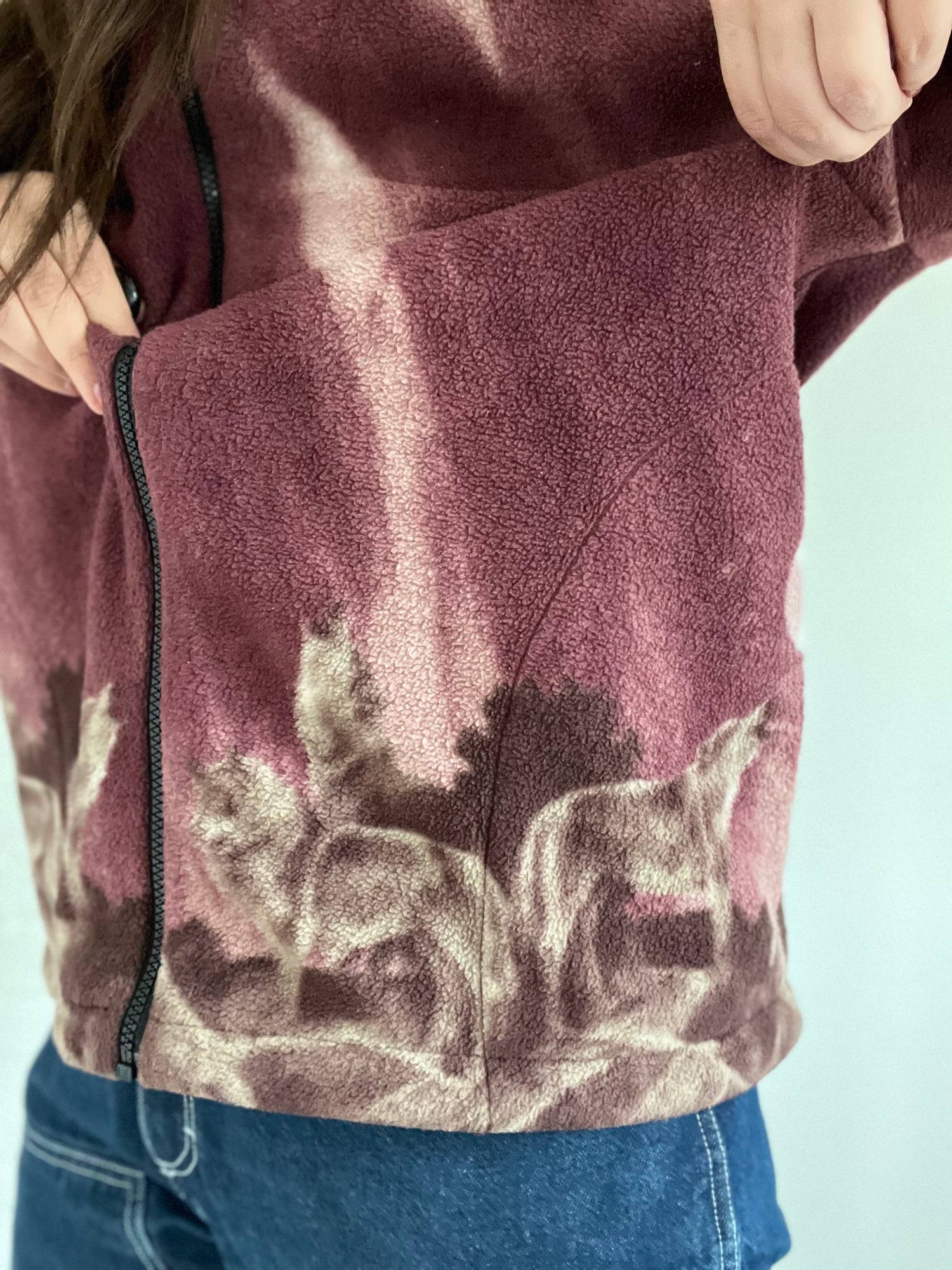 A unique, light burgundy fleece jacket with a wrap-around wolf design. At the hem showcases several wolves crying out to the moon and sky, reflected on the upper half of the fleece. A striking and unique piece to add to the collection. Great condition!