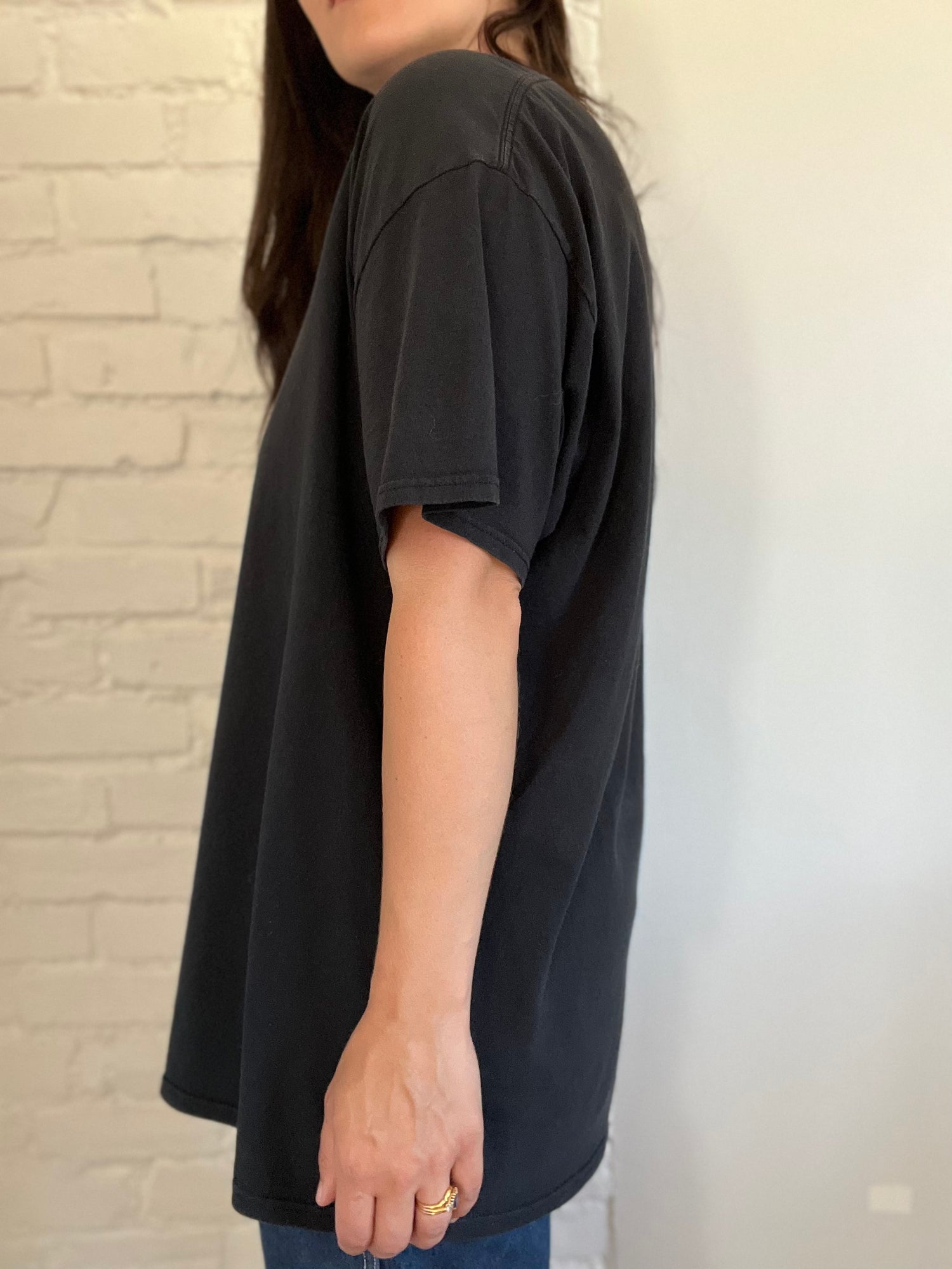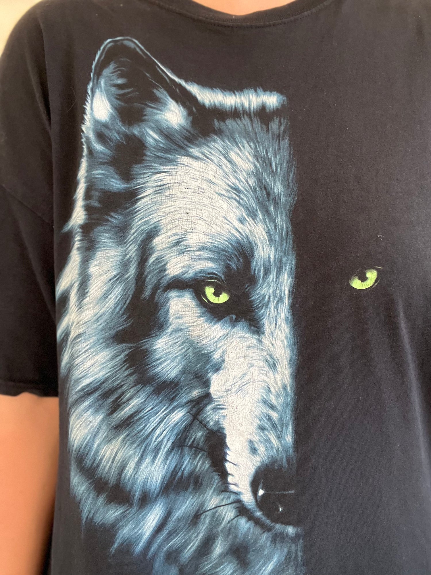 Dark as night, this half-face wolf portrait is a striking oversized t-shirt. The striking green eyes are piercing, and the juxtaposition between left to right is so unique. Relaxed fit, and beautifully worn in without flaws.