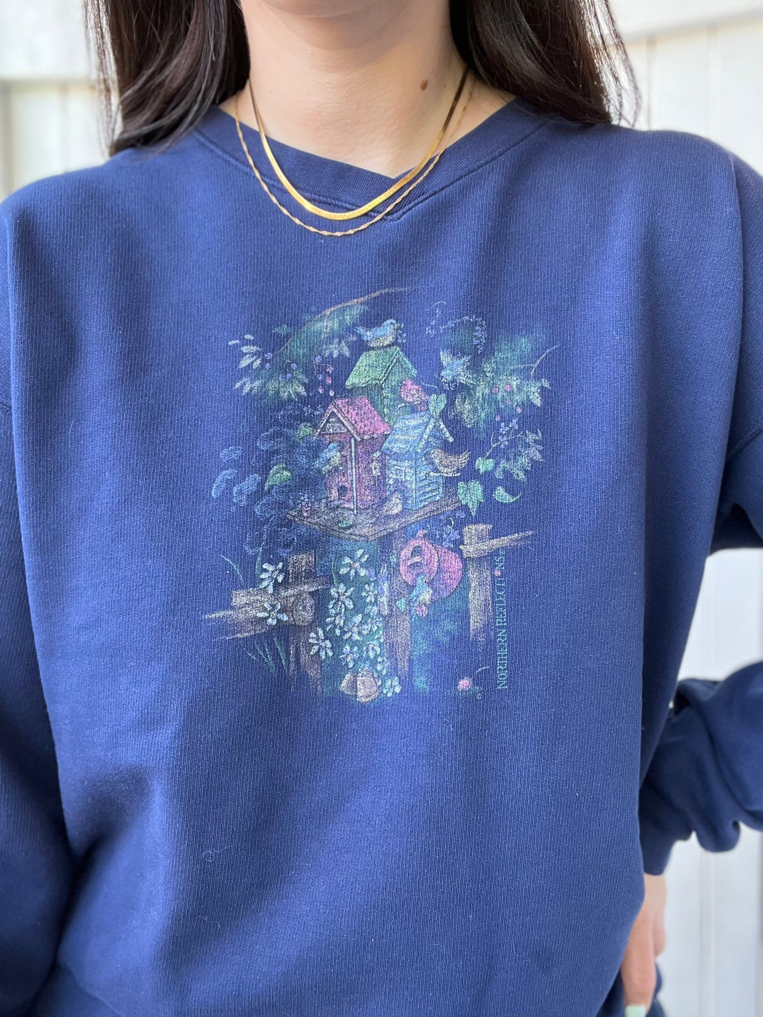 A navy blue, cottagecore vintage Northern Reflections sweater. Featuring a birdhouse trio surrounded by nature, this nostalgic piece will keep you cozy year round. Mini v-neck detailing, and a Northern Reflections stamp on the back of the neck. Bird lovers, unite.