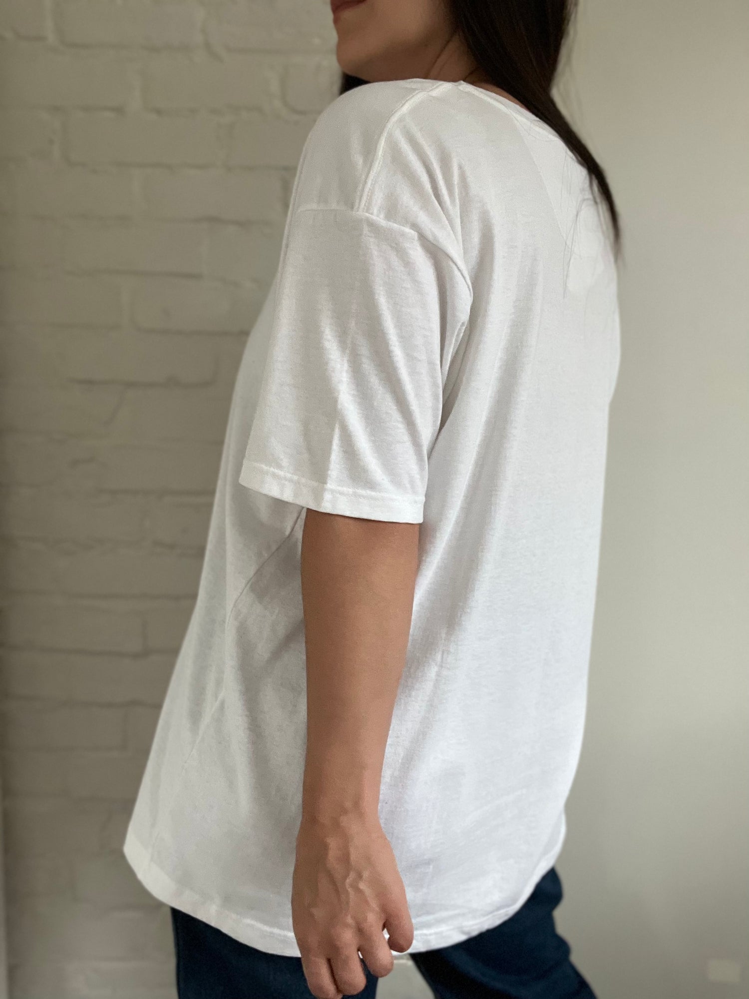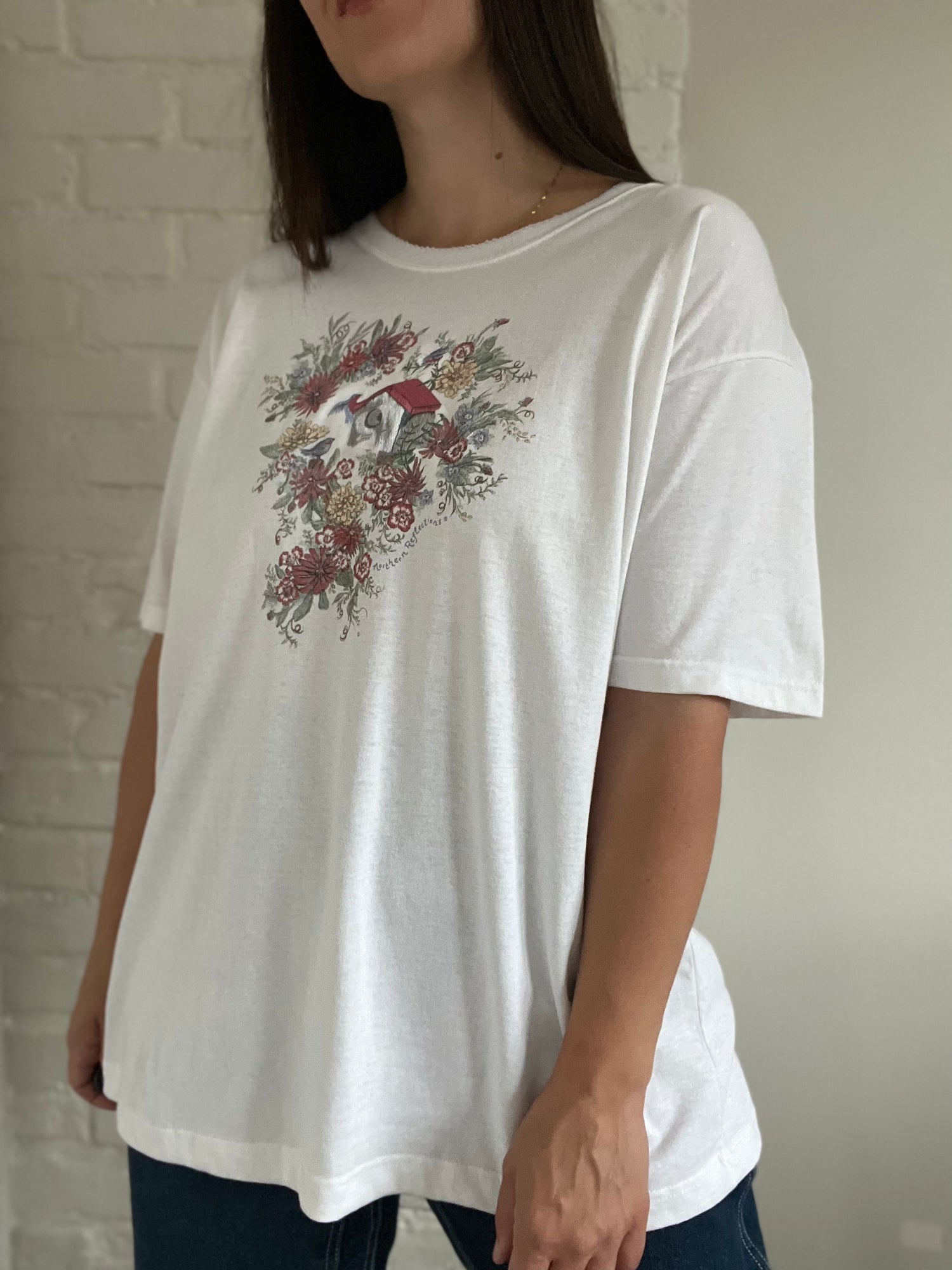 An oversized, white Northern Reflections t-shirt with a floral design and stitched birdhouse front and centre. This t-shirt still has the original tags attached from the 90s. Scalloped neckline, soft relaxed cotton fit.