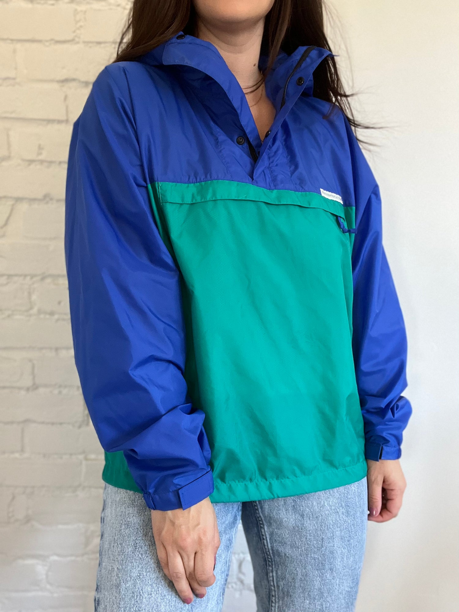 A retro vintage Northern Reflections waterproof pullover jacket with snap button closure and front pouch zip. Royal blue on the top with a punchy turquoise on the bottom, and black accent buttons. The Northern Reflections tag sits across the upper left chest. Hoodie in the back, and adjustable at the hem.
