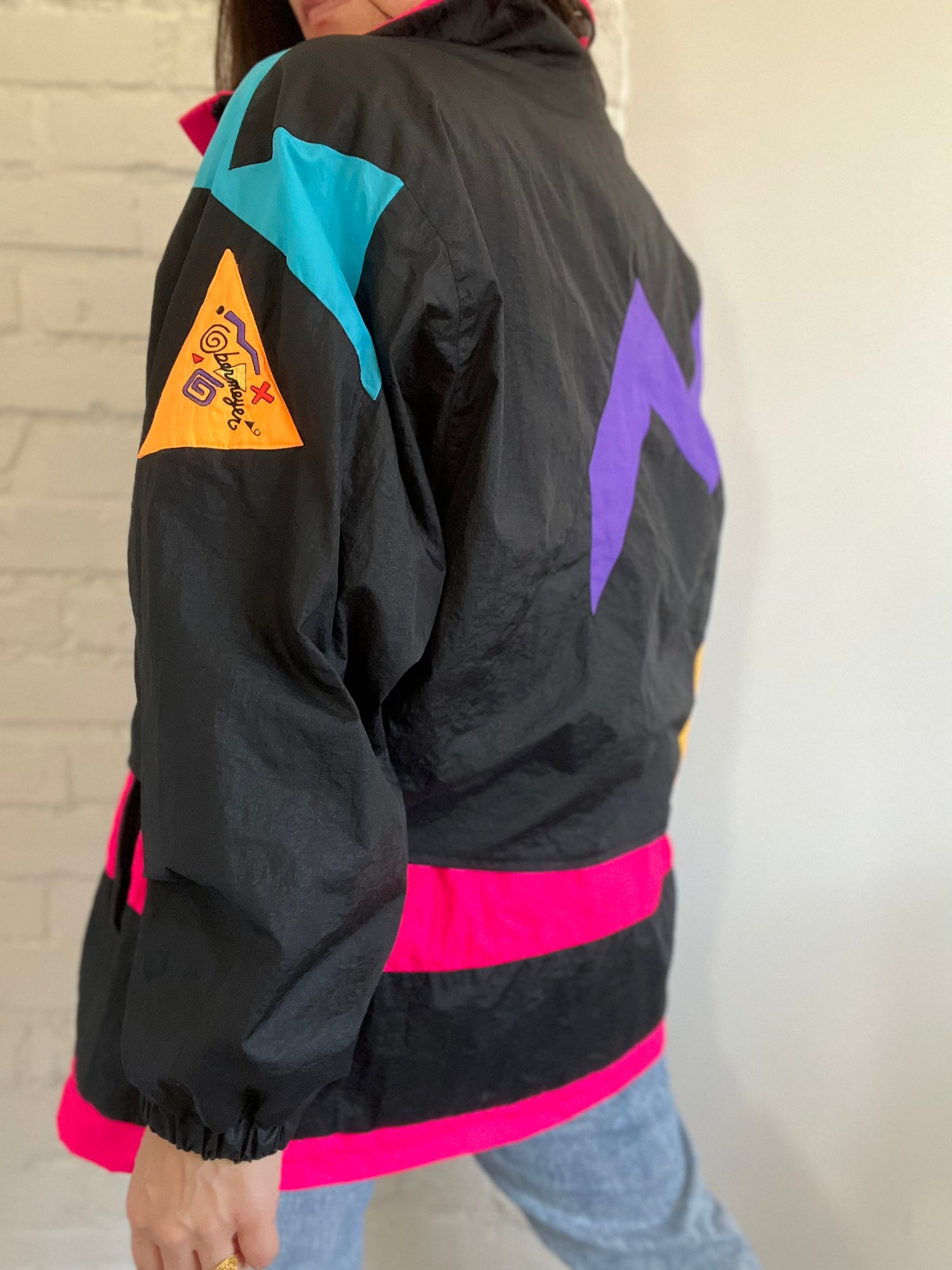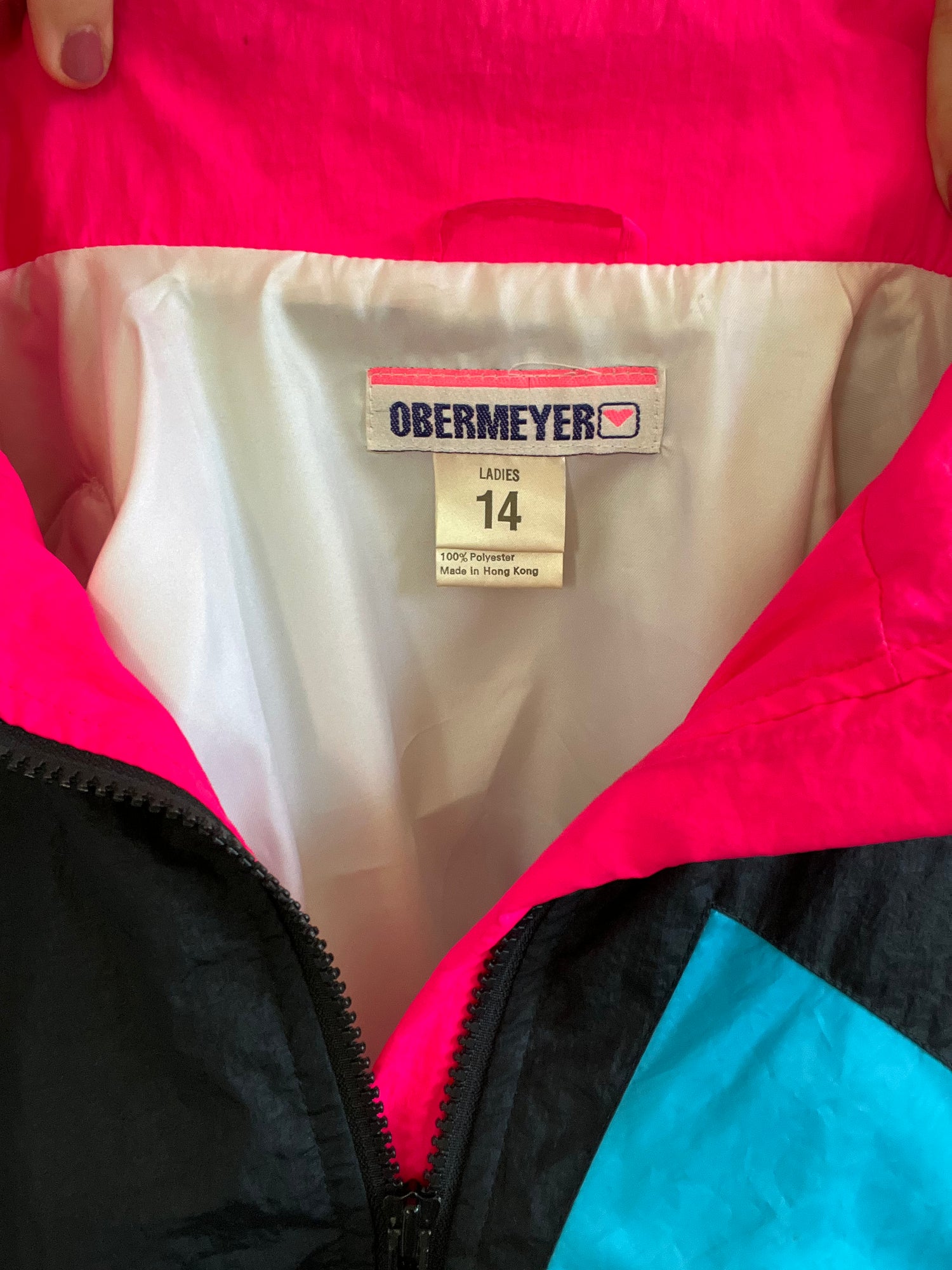 Authentic 80s Obermeyer ski jacket in abstract, beautiful colours. A black backdrop with neon purple, orange, pink, purple and more. This is a pullover style with centre zipper. Side arm patch with gold stitch. Perfect, mint condition. Two tier layers with hot pink popping out of the bottom. These beauties go for $150 online (just check!), so now is your chance to live your best 80s Nebraska Apres Ski life.