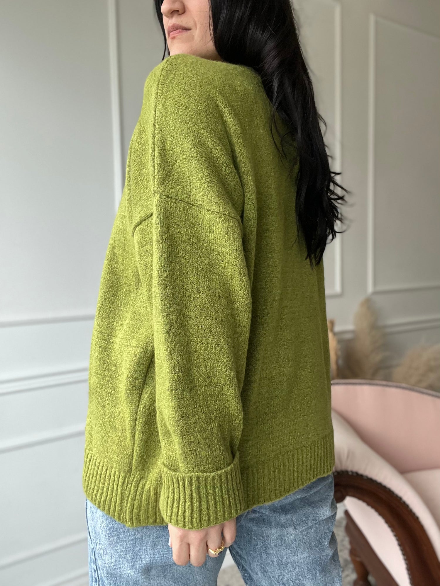 An incredibly soft, oversized moss green sweater with a high neck, wrap cuffs and 5-button detail along the upper back. Small hints of forest green throughout the base. Stretchy, and perfectly oversized.