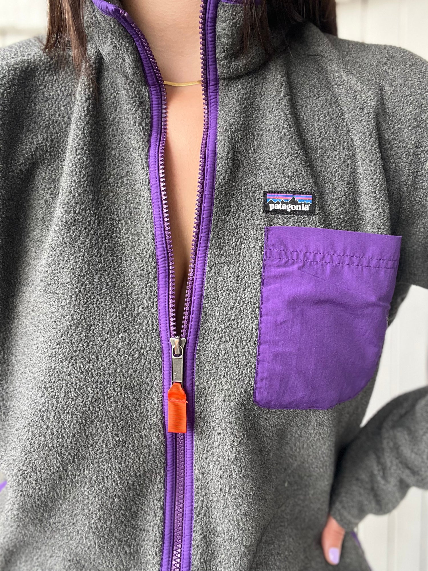 A vintage colour-way, this striking Patagonia fleecer mixes oldschool and modern design. The bright purple contrasts with the bright orange trim against a light charcoal backdrop. Two front pockets with round seam detailing.