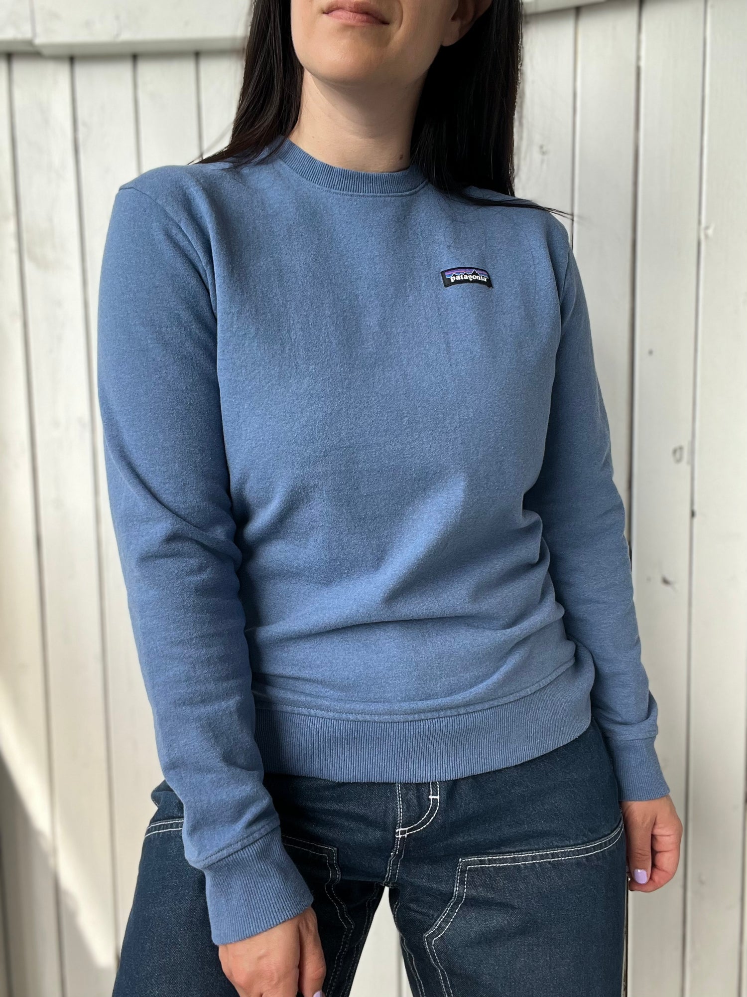 Heavier-weighted cotton recycled spandex sweater with a brushed back provides cozy wrmth and next to skin comfort. This 95% recycled crew sweatshirt is made using 10.8 plastic bottles and 0.6 lbs. of cotton scrap, saving 143 gallons of water versus a conventional cotton sweatshirt. Classic crewneck pullover styling with a regular fit and a touch of stretch. Woven label logo features original Patagonia artwork.