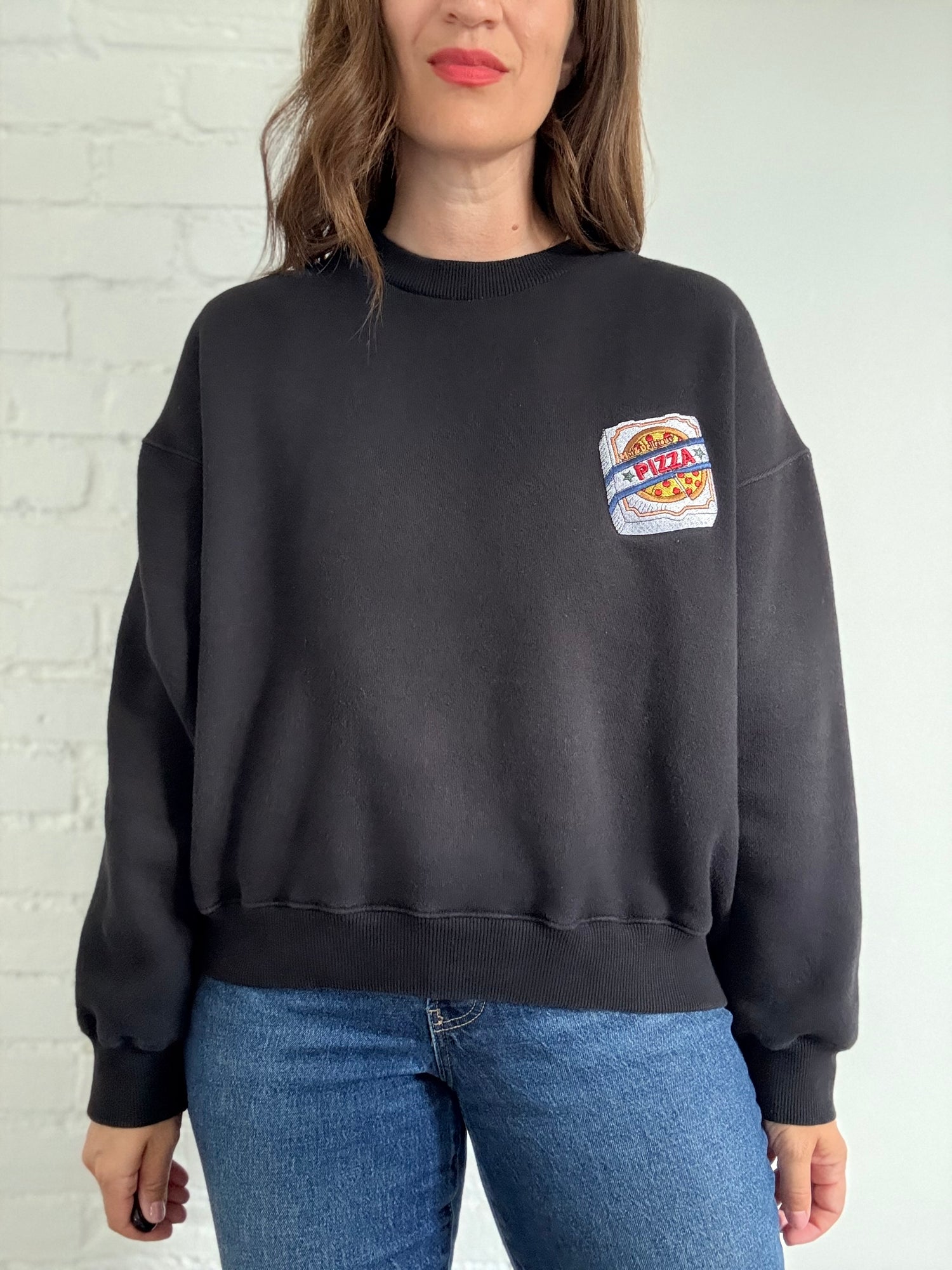 A plain black crewneck sweater, with a highly detailed Hot & Delicious Pizza patch across the chest. The brand is X, a luxurious - high-end streetwear brand in Korea. While the sweater has no size label, it could be an oversized small or regular large. Ribbed neckline, dropped shoulders, plushy interior and ribbed hem. Flawless, in mint condition.