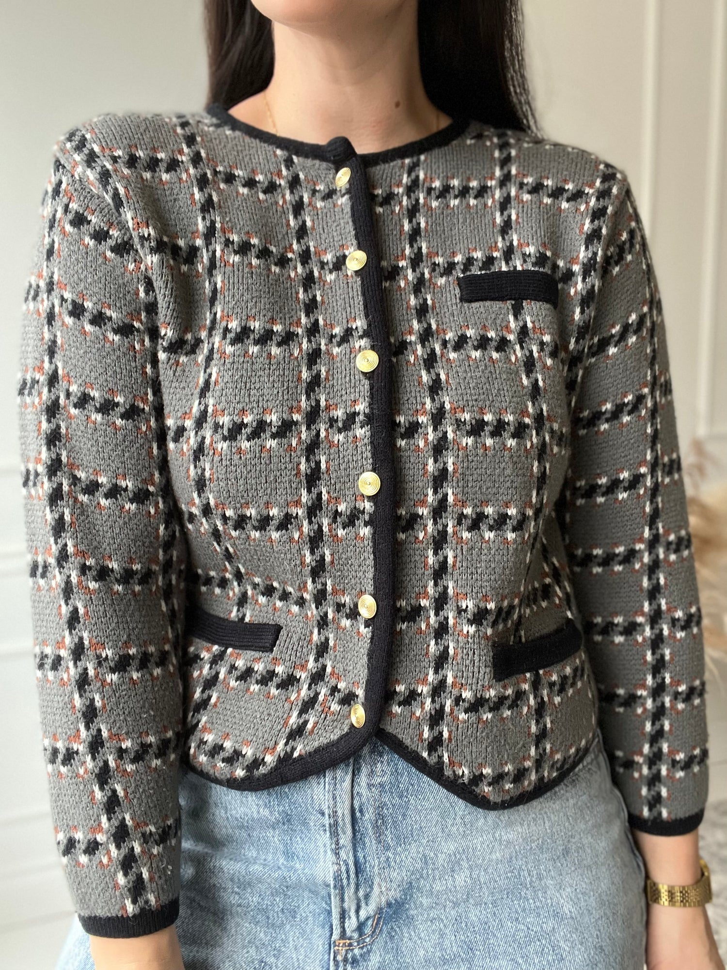 A charcoal grey plaid sweater with copper brown, white and black detailing. Gorgeous vintage gold buttons up the front. I love the heart shaped hemline, making this knit super cute. Sits just below waist.