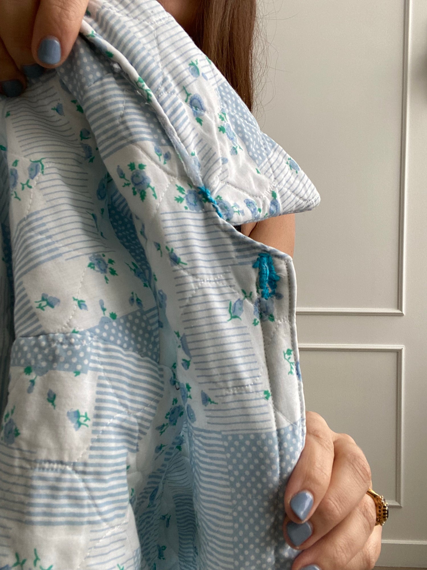 One of a kind, handmade half and half quilt, denim jacket. Only the top button does up and fits boxy. Could fit a size small - large, depending on desired fit. The denim was an original "Traditions" denim shirt, the iconic vintage brand that has given the world so many casual treasures.
