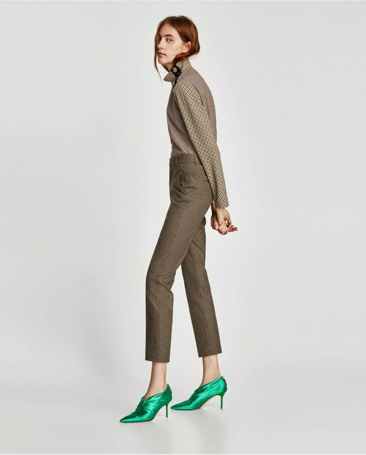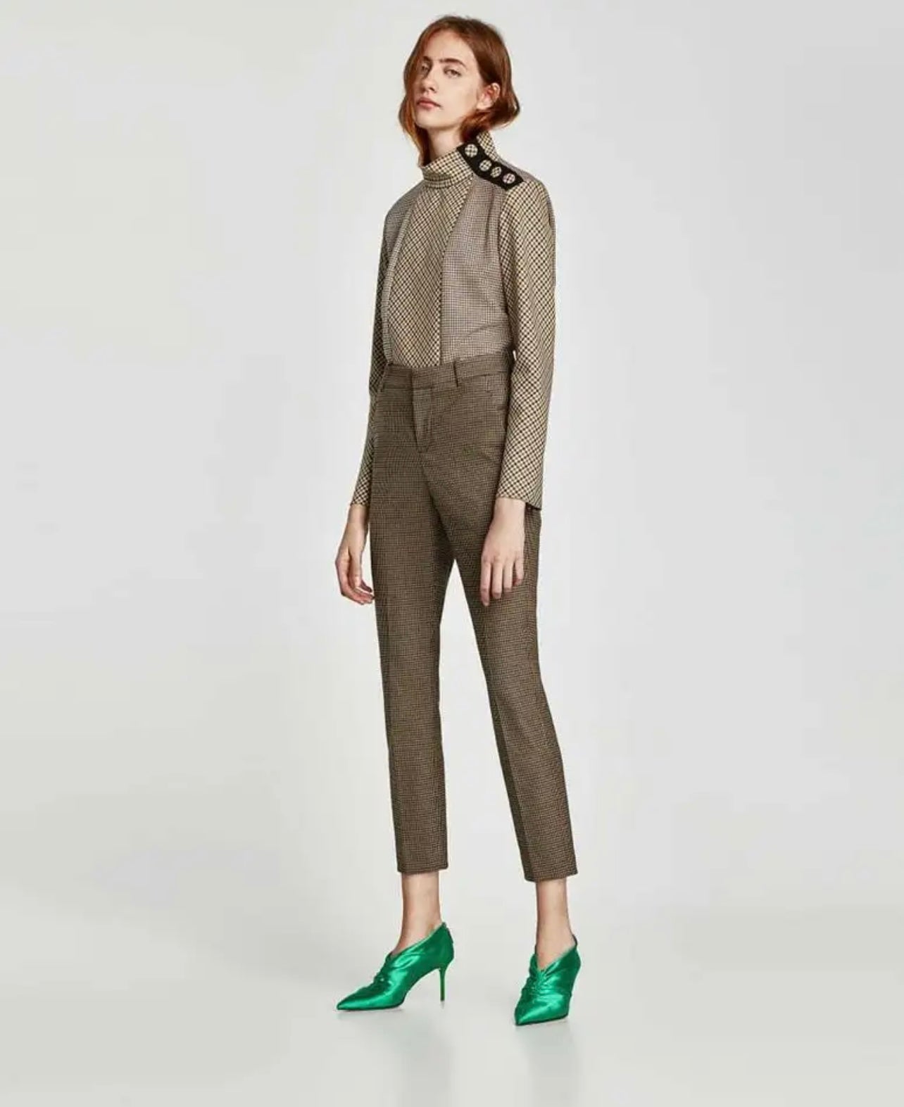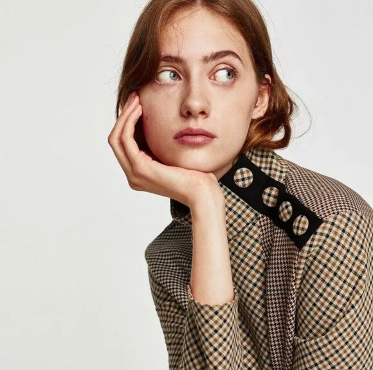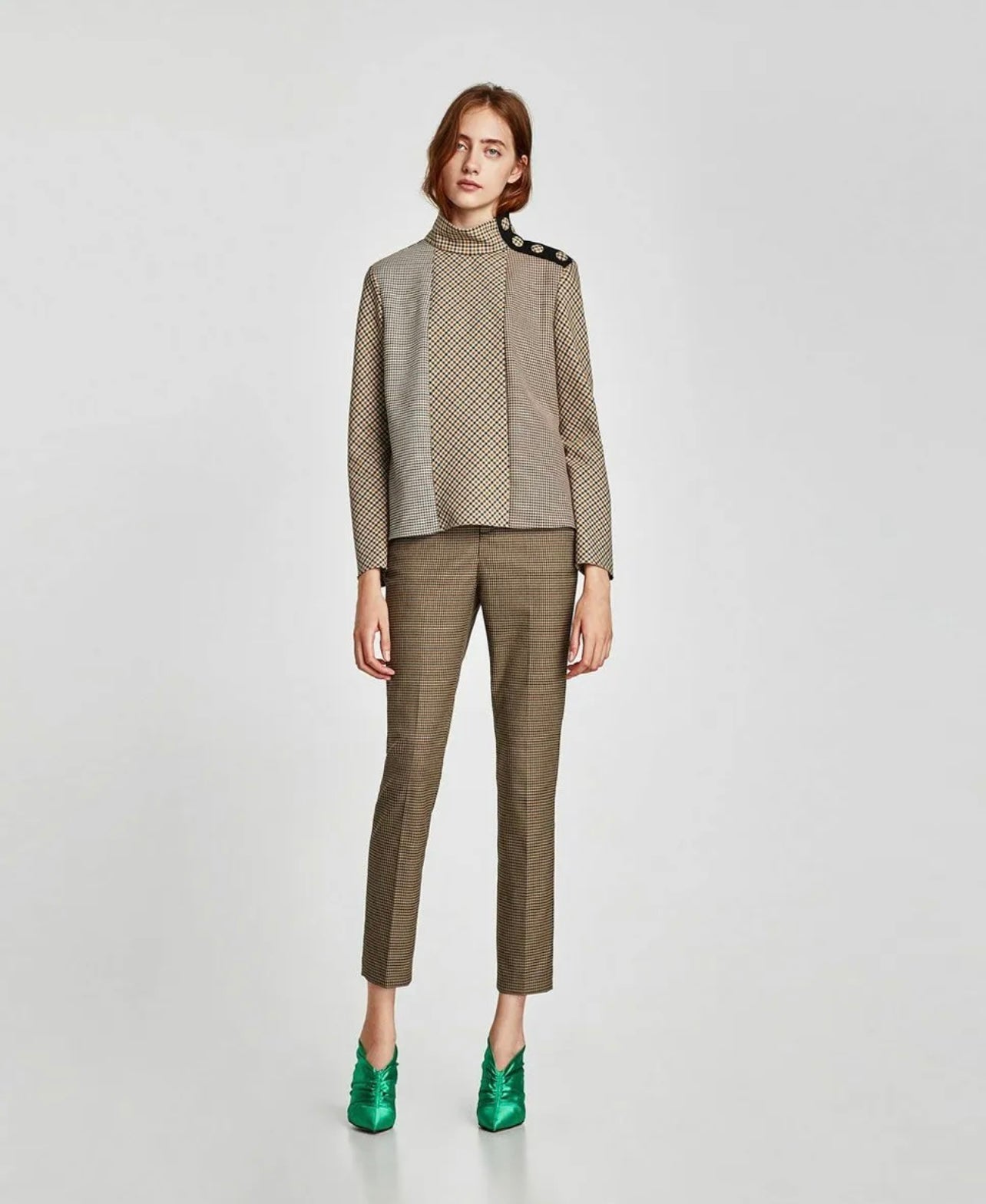 A striking panelled shirt, showcasing multiple plaid designs. A loose, high-neck collar with snap button closure - although it looks like large buttons. A high quality, go-to plaid shirt for the season of the changing leaves.