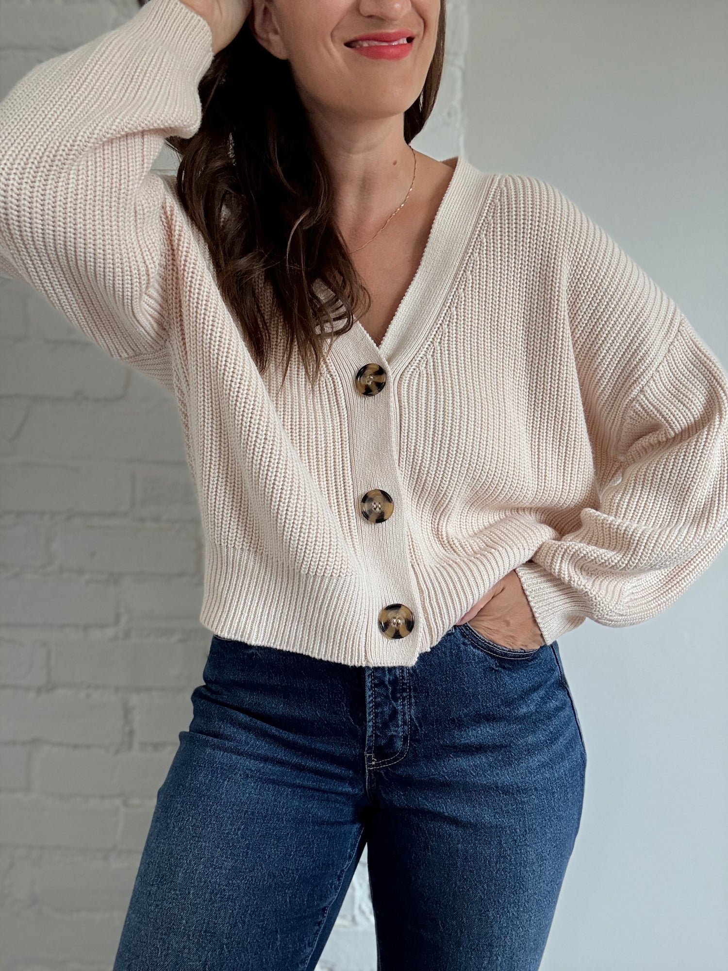 The perfect cardigan does exist! This one hits all the items on the checklist, from its super-soft exterior to its perfectly relaxed bodice. Beige in colour, with brown marble buttons up the centre. Ribbed v-neck and a loose ribbed hem. Mint condition.