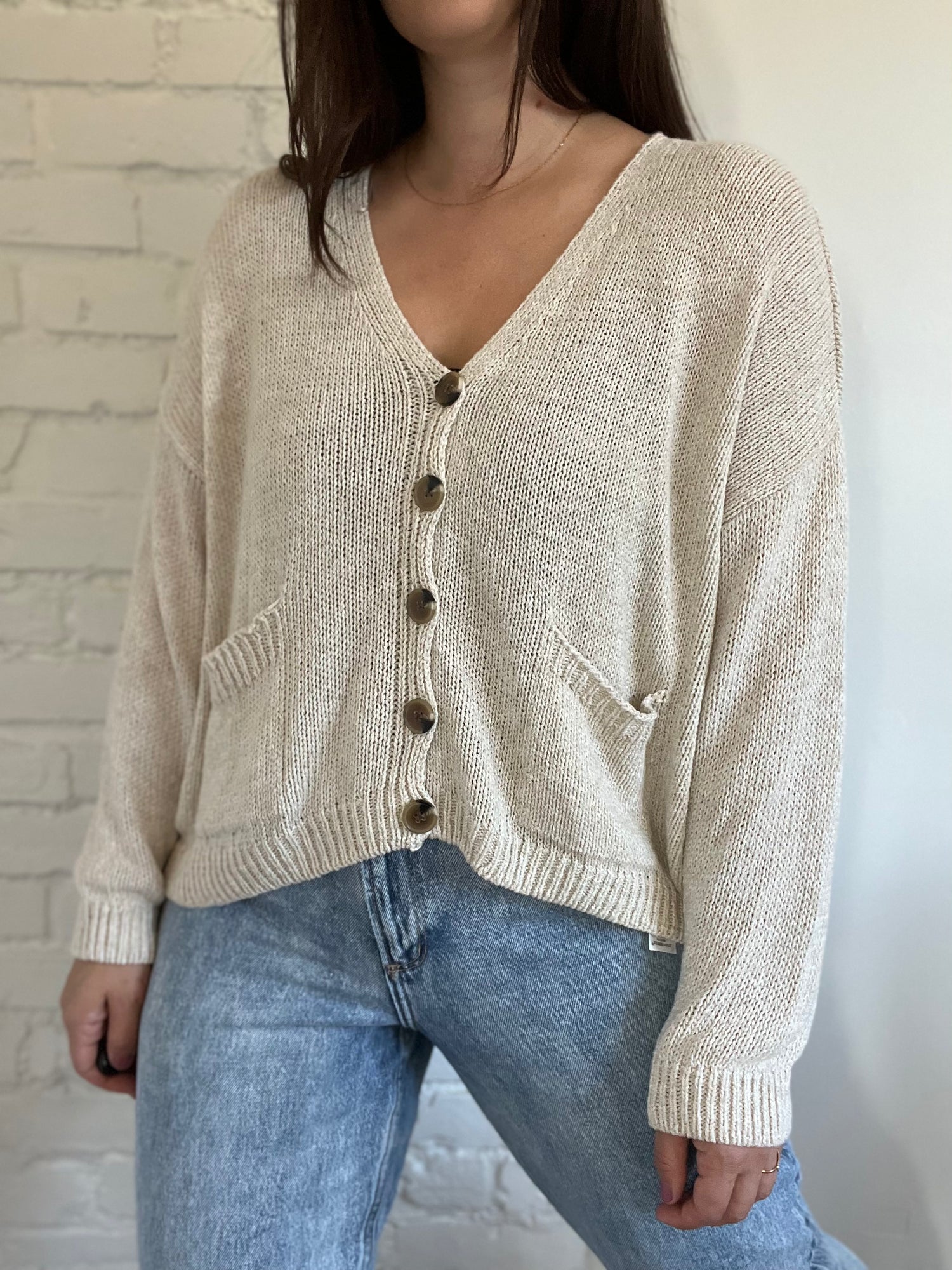 A relaxed fit, lightweight knit cardigan in oatmeal beige. 5-button marble closure in the front, with two small front pockets. Deep v-neck, accentuating the neckline. This lightweight cardigan is chic and comfortable - paired with a tank or worn by itself.