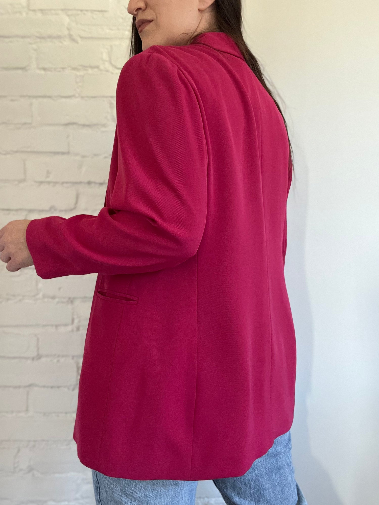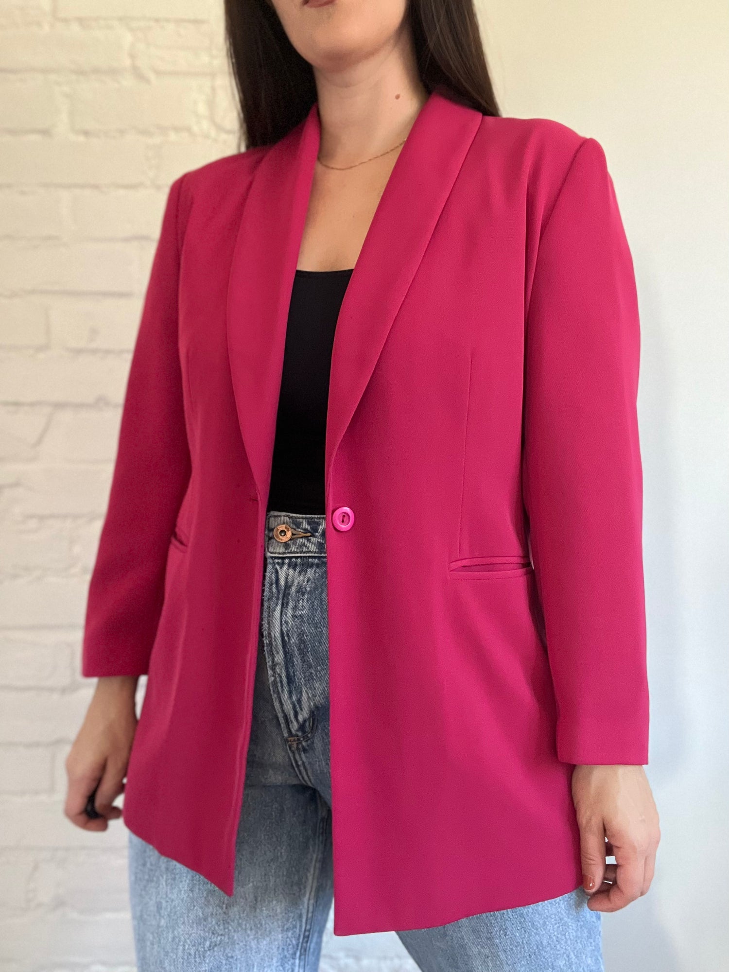 A gorgeous, lightweight, dark hot pink blazer. This piece is lightweight making it a great blazer for year-round wear, and has a relaxed fit that looks great styled both open and closed. Two front pockets, and lined.