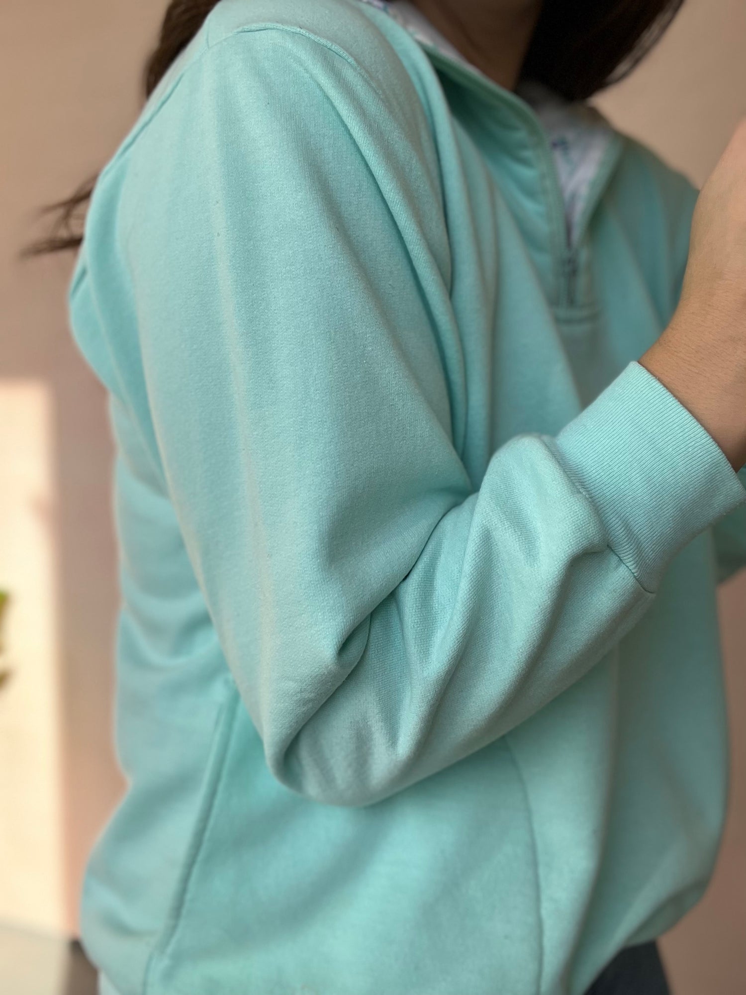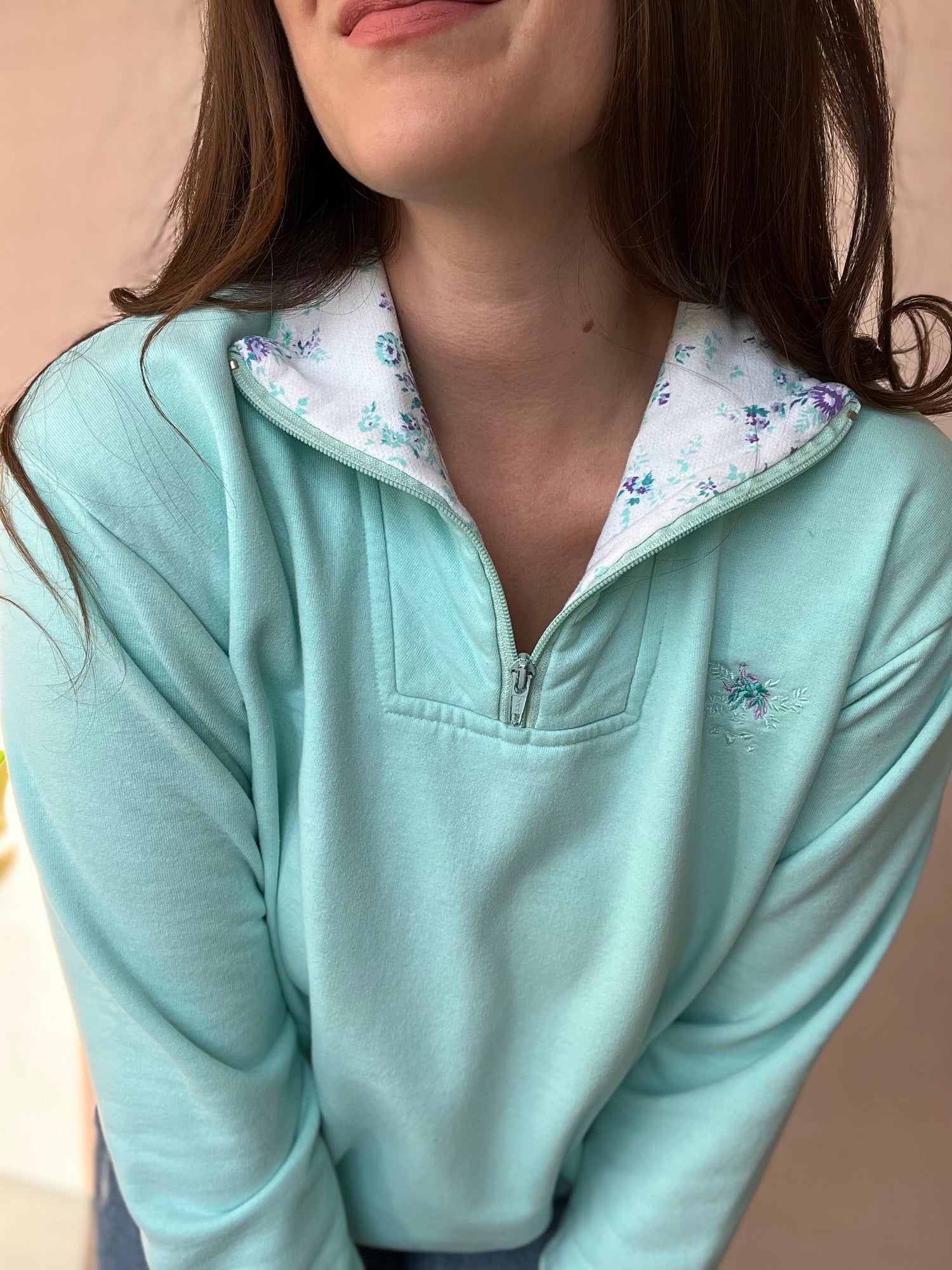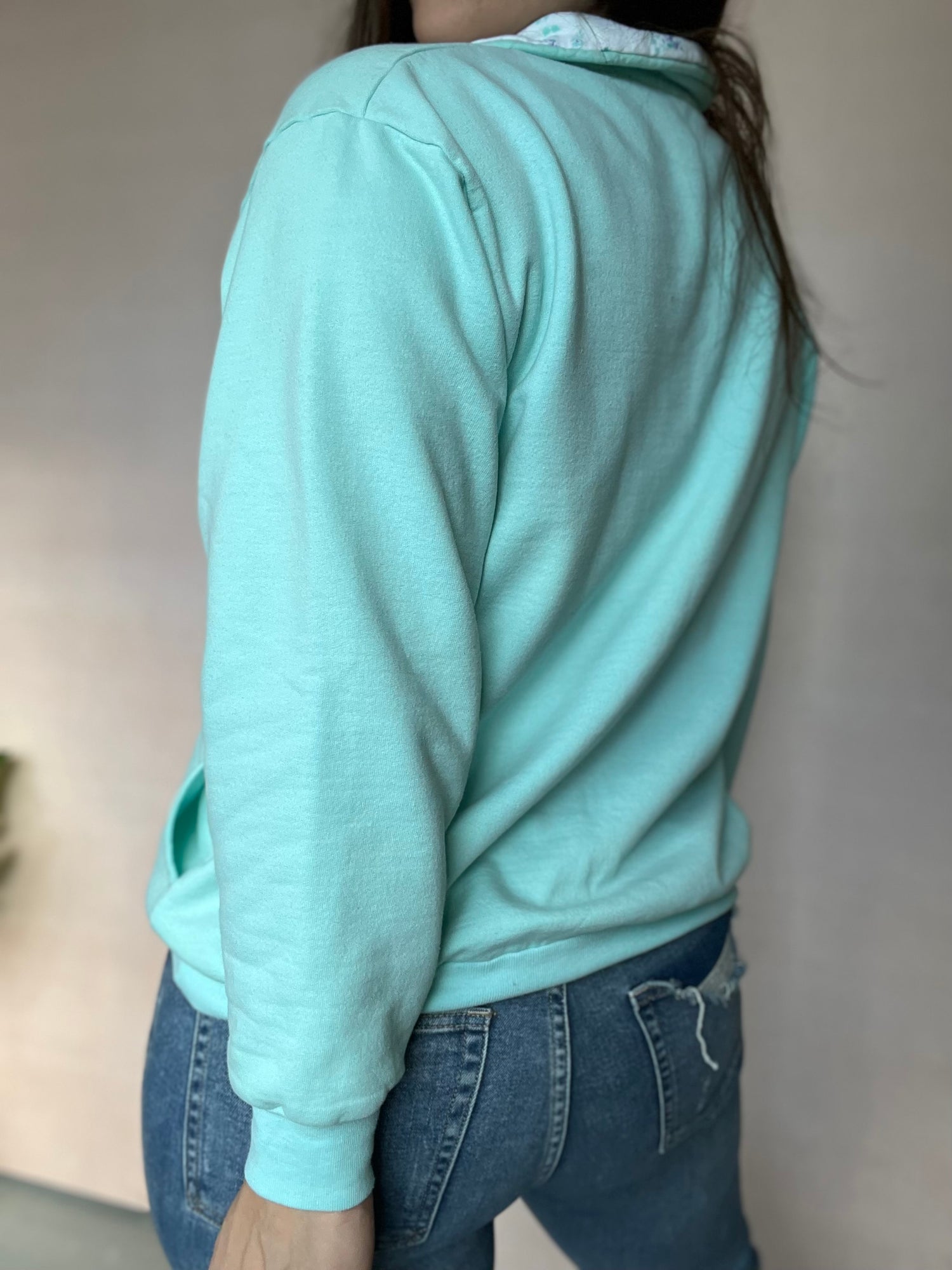 A retro mint green athletic sweater with plush interior and floral collar. Cute floral embroidery across upper left chest, and purple floral lined collar for a pop of colour. Tagged a M but fits a L (me) wonderful too.