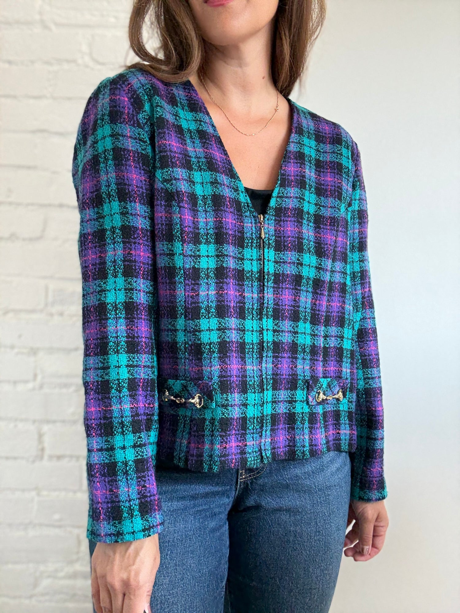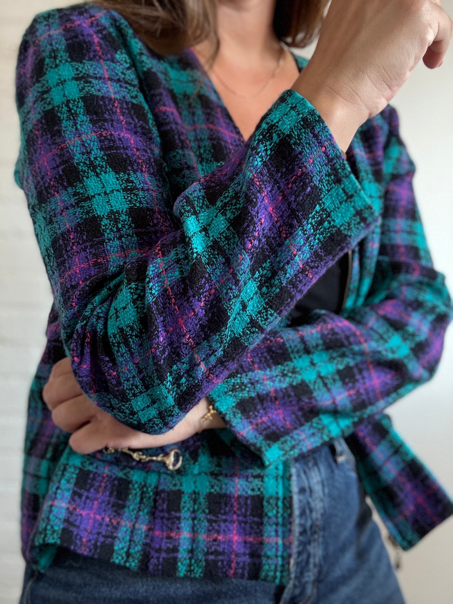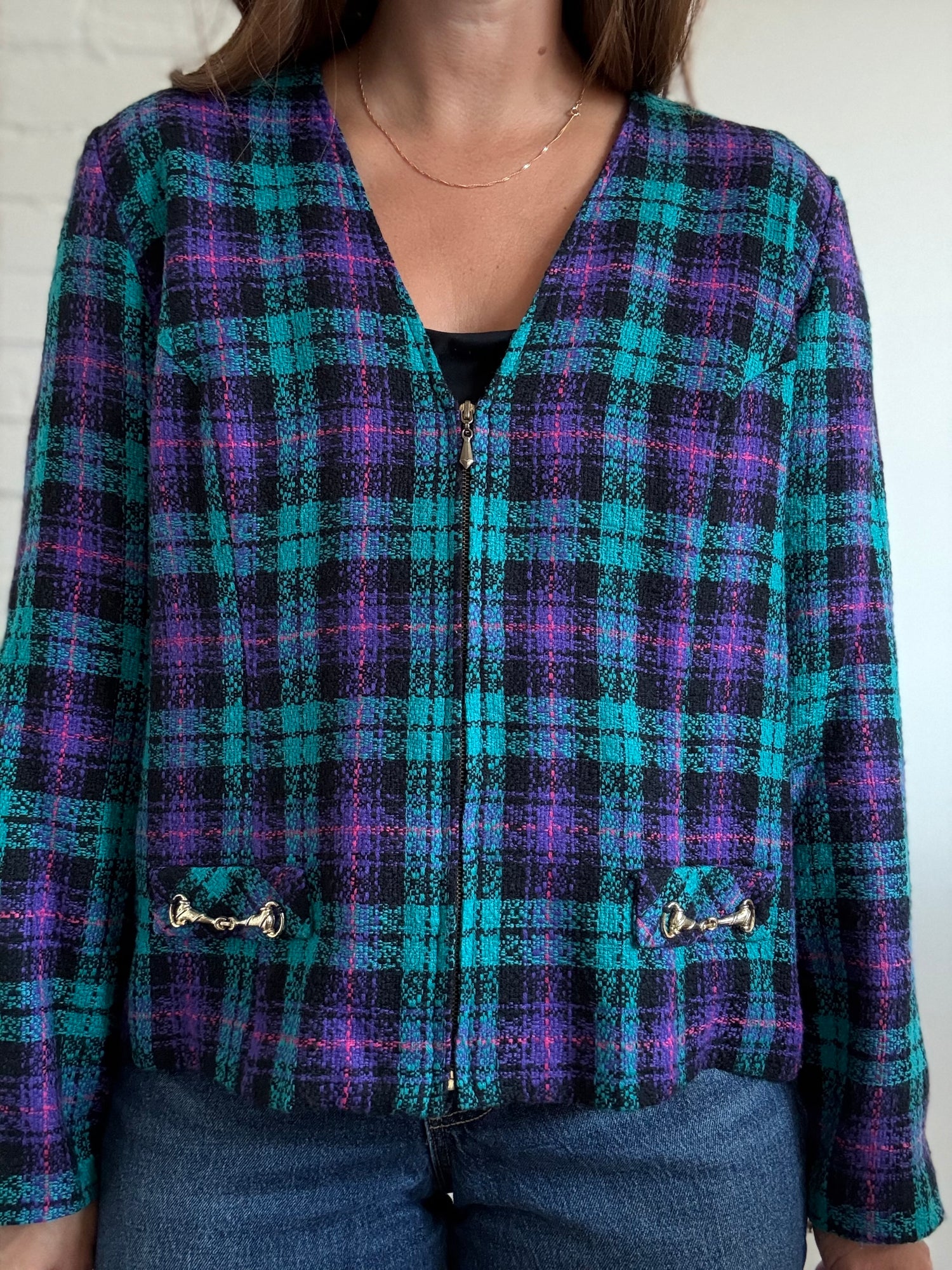 Get ready to turn heads at the office, or jazz up your plain white t-shirt. A retro blazer with a spectacular colour combination - showcasing bright teal, purple and hot pink lines - all with a black undertone. Gold detailing on the front pockets, and a front zip closure with no collar. Unlined, lightweight - and pure perfection. Mint condition.