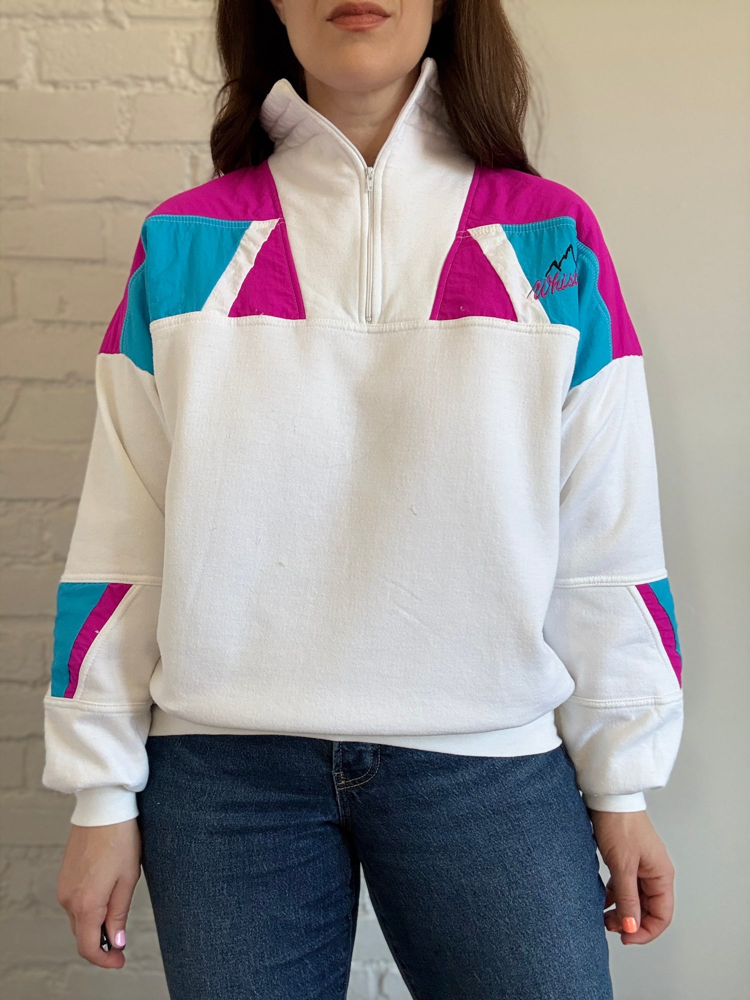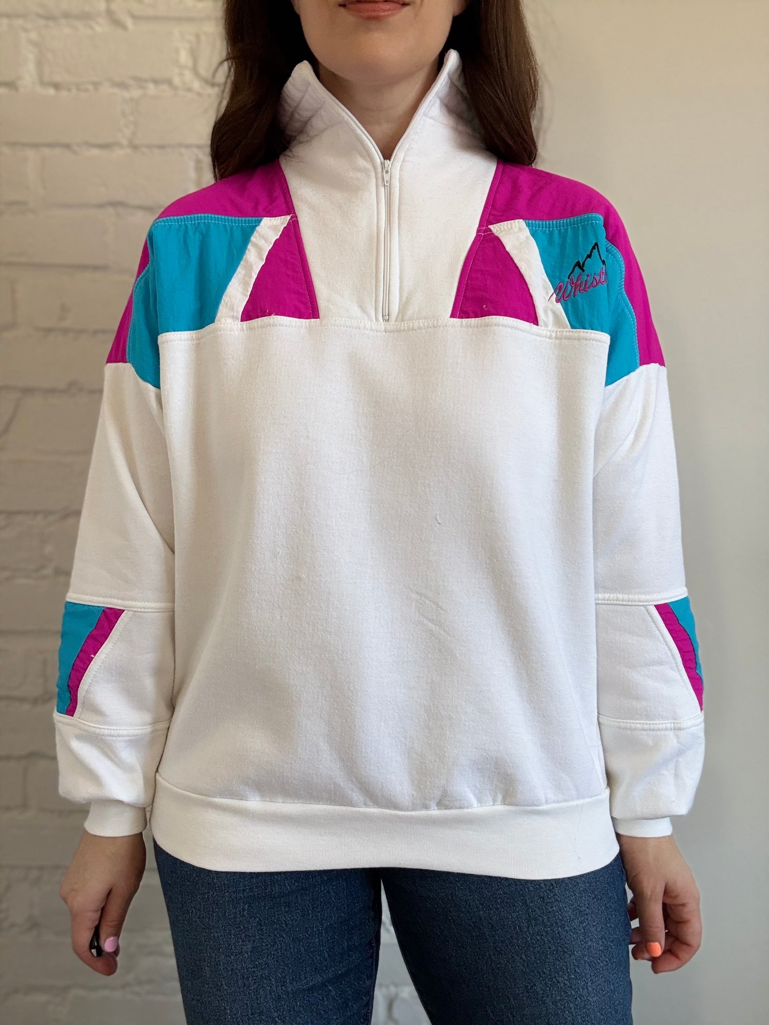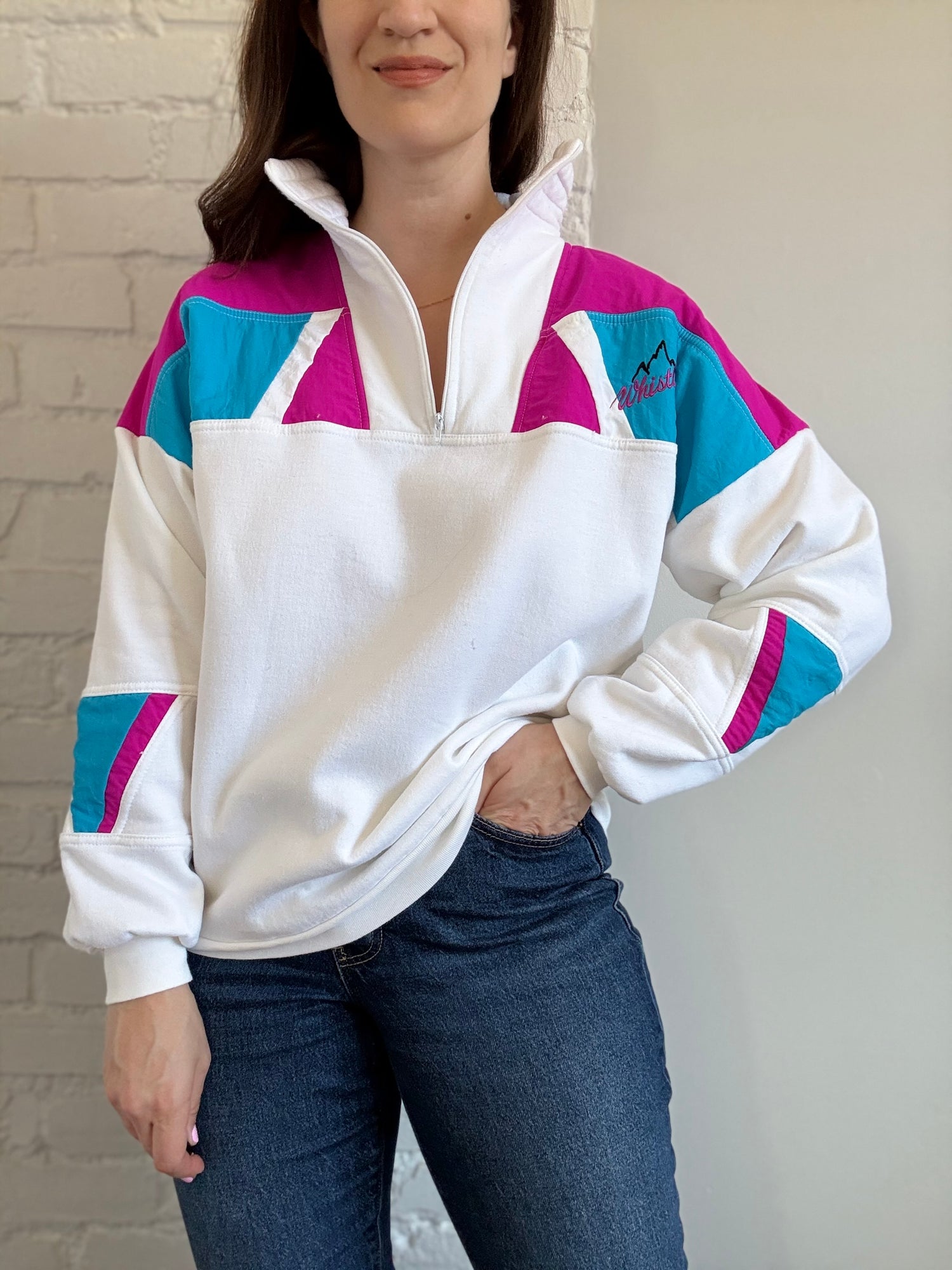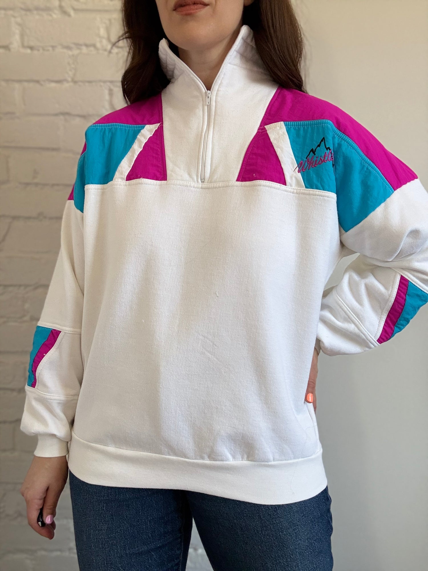 The 90s called, and they're ready for the slopes. A retro vintage Whistler pullover sweater, with track-suit nylon in bright purple and ocean blue across the upper chest and lover arms. "Whistler" embroidered across the upper left chest, and a quarter zip for your cool/hot comfort. Mint condition - no marks or stains.