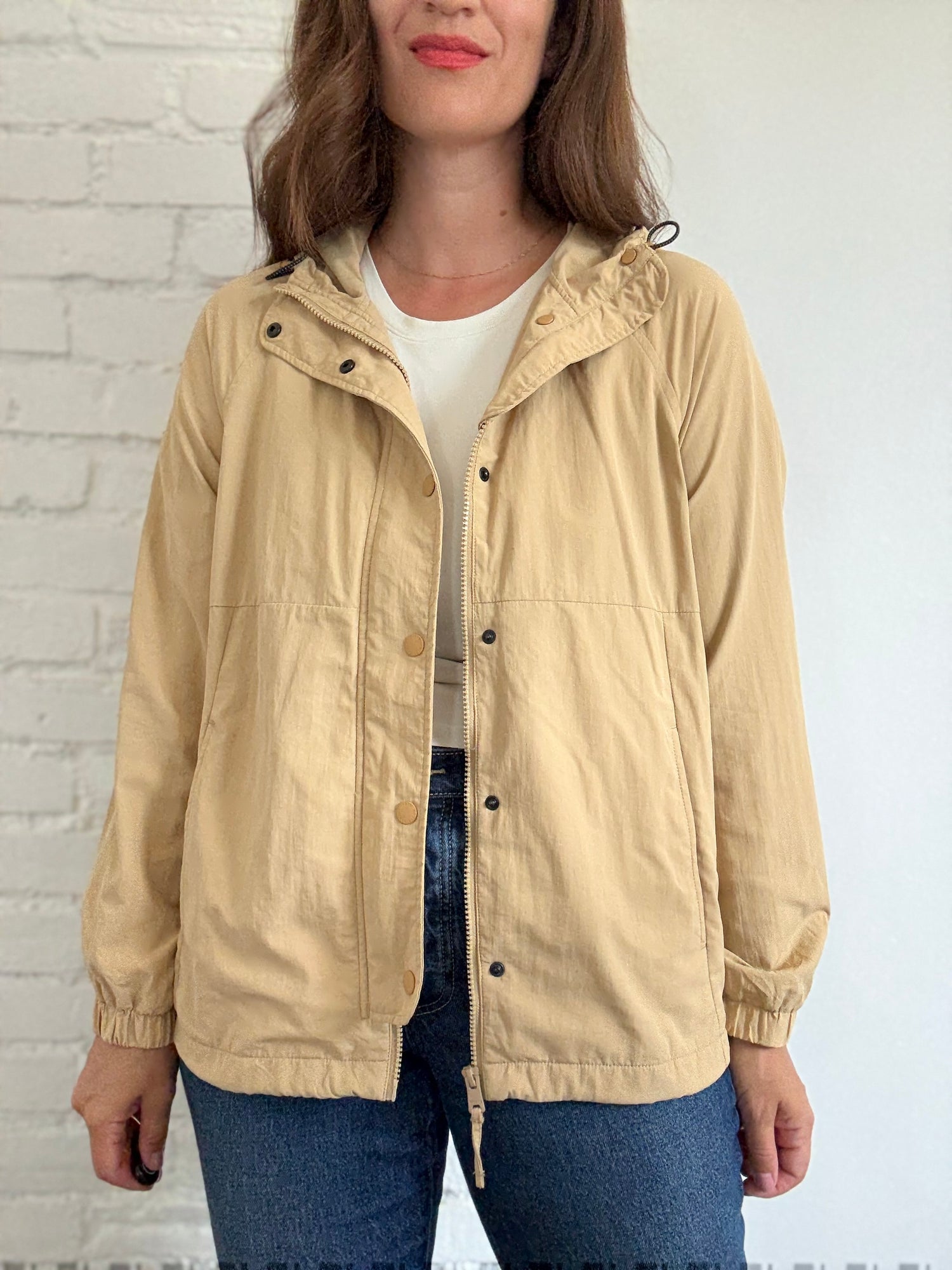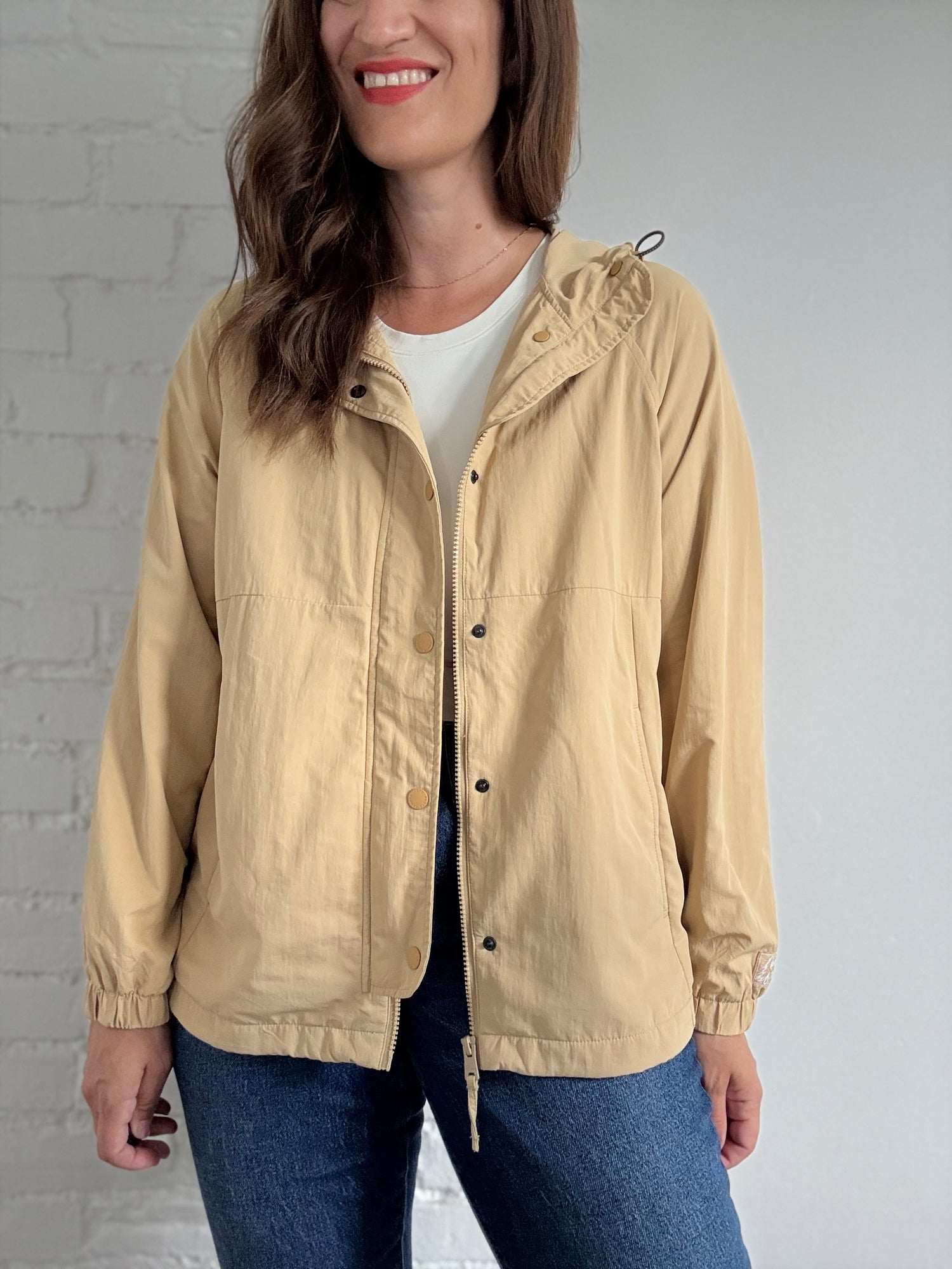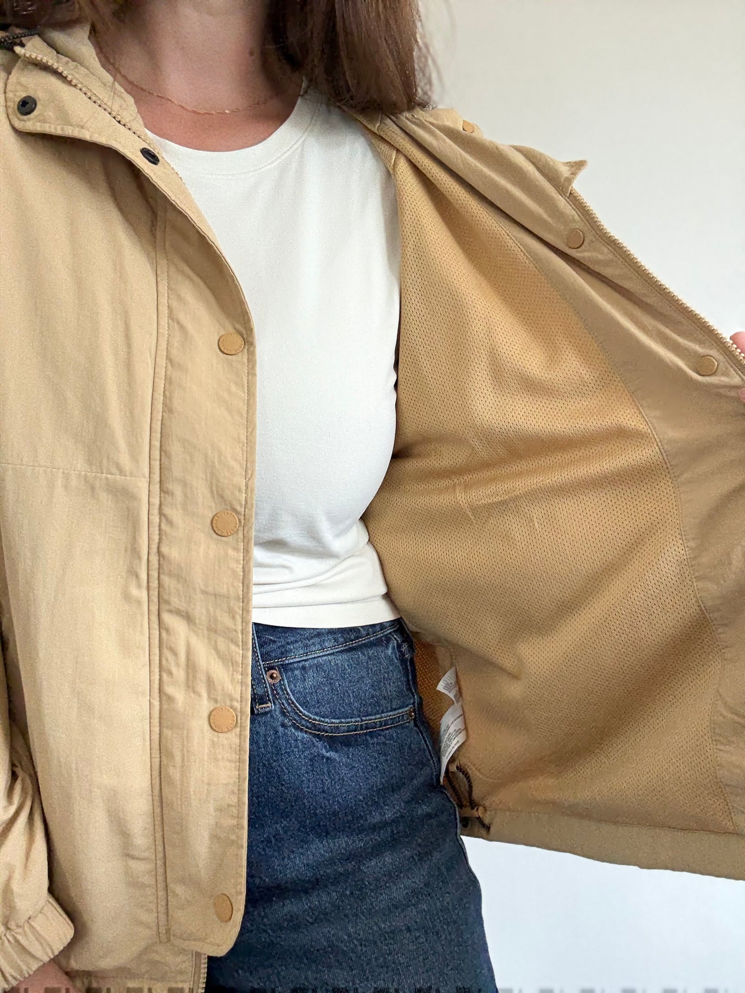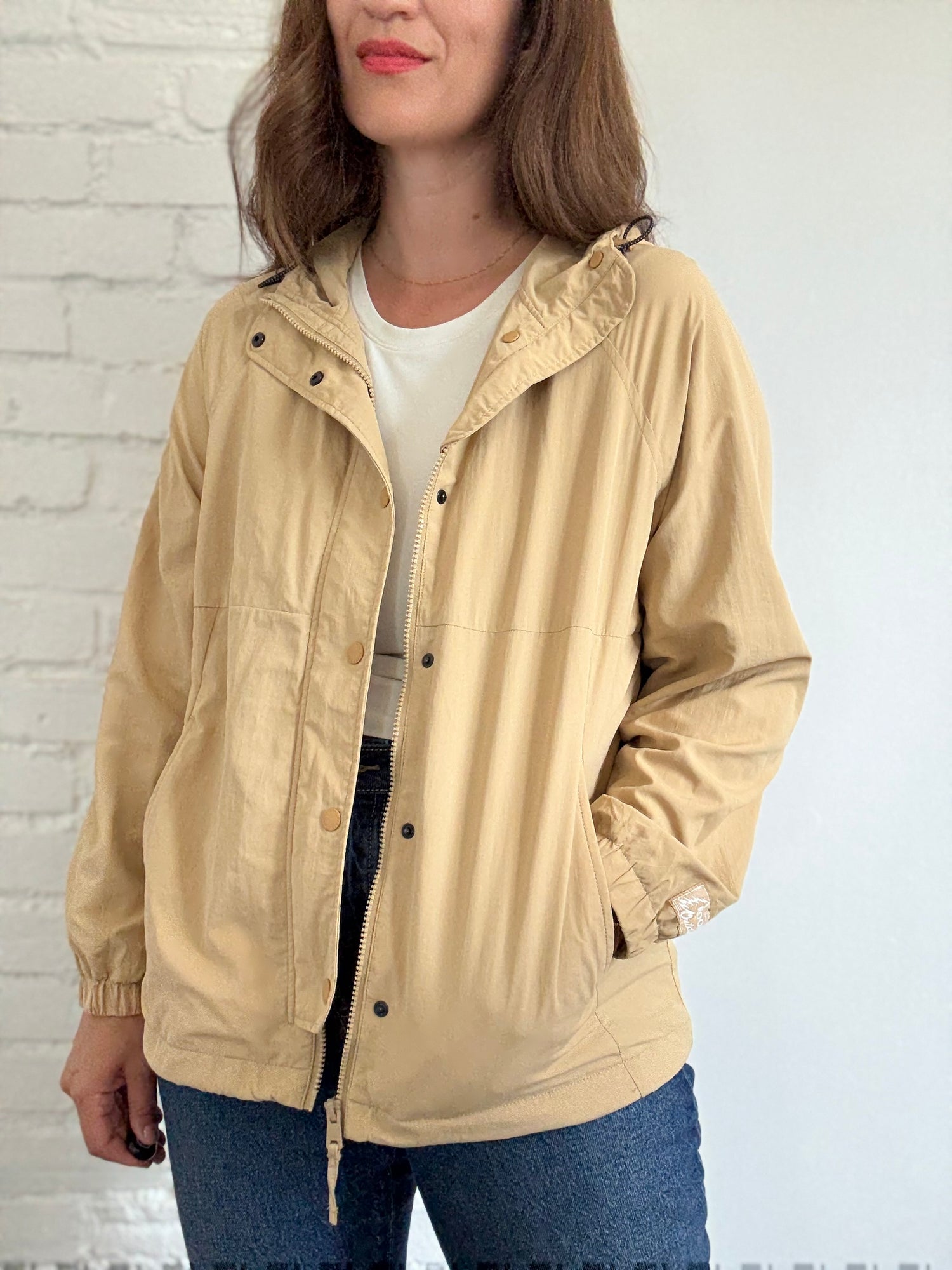 A high-quality outdoor nylon jacket, in a luxurious tan colour. This jackets is designed for both style and functionality, with features like water resistance, breathability, and convenient pockets.A zipper and snap-button closure infront, front pockets, hood with adjustable string and vent in the back. Interior has a mesh lining, adding to its breathability. Mint condition, like brand new. Retails for $148 CDN.
