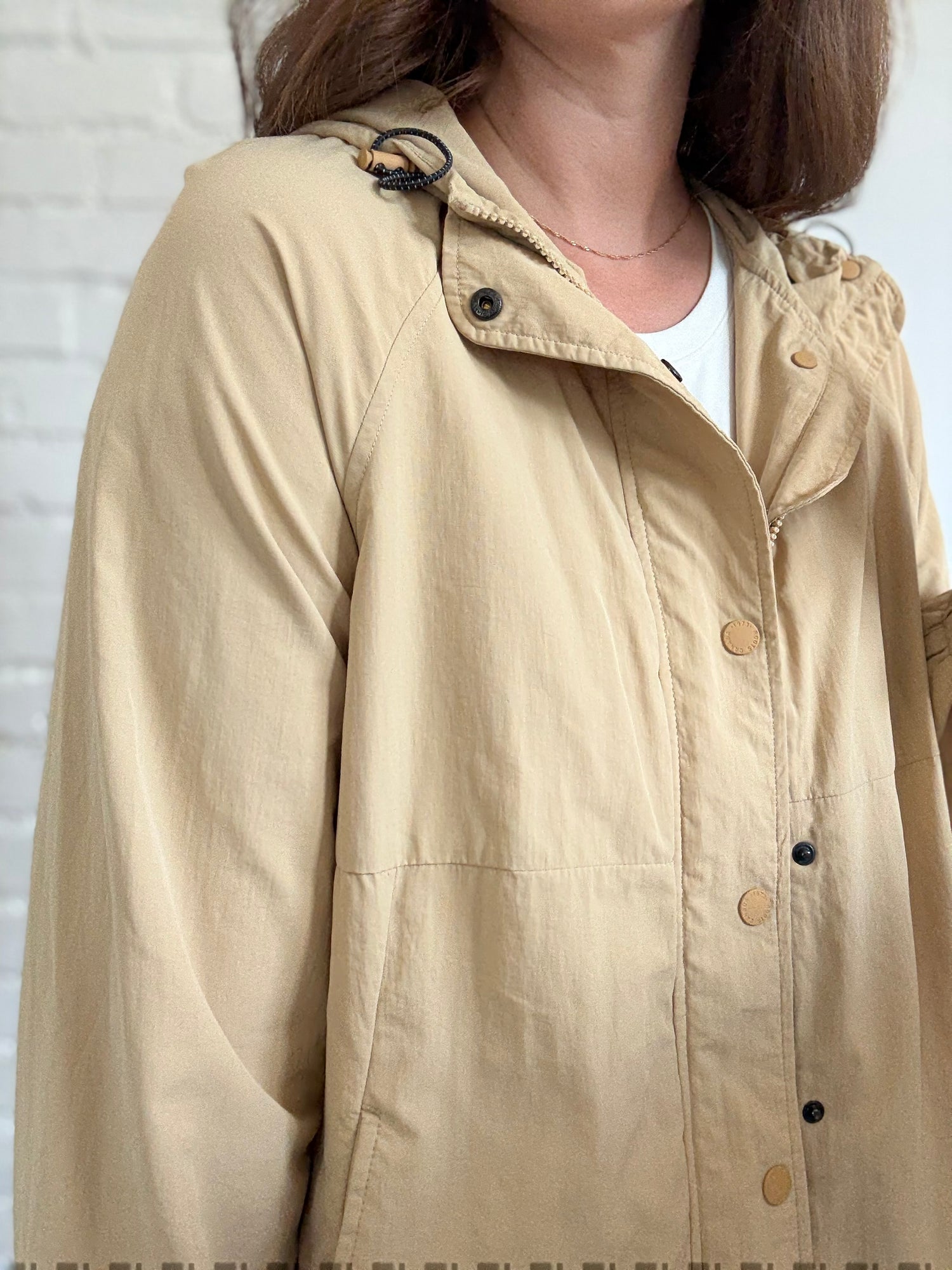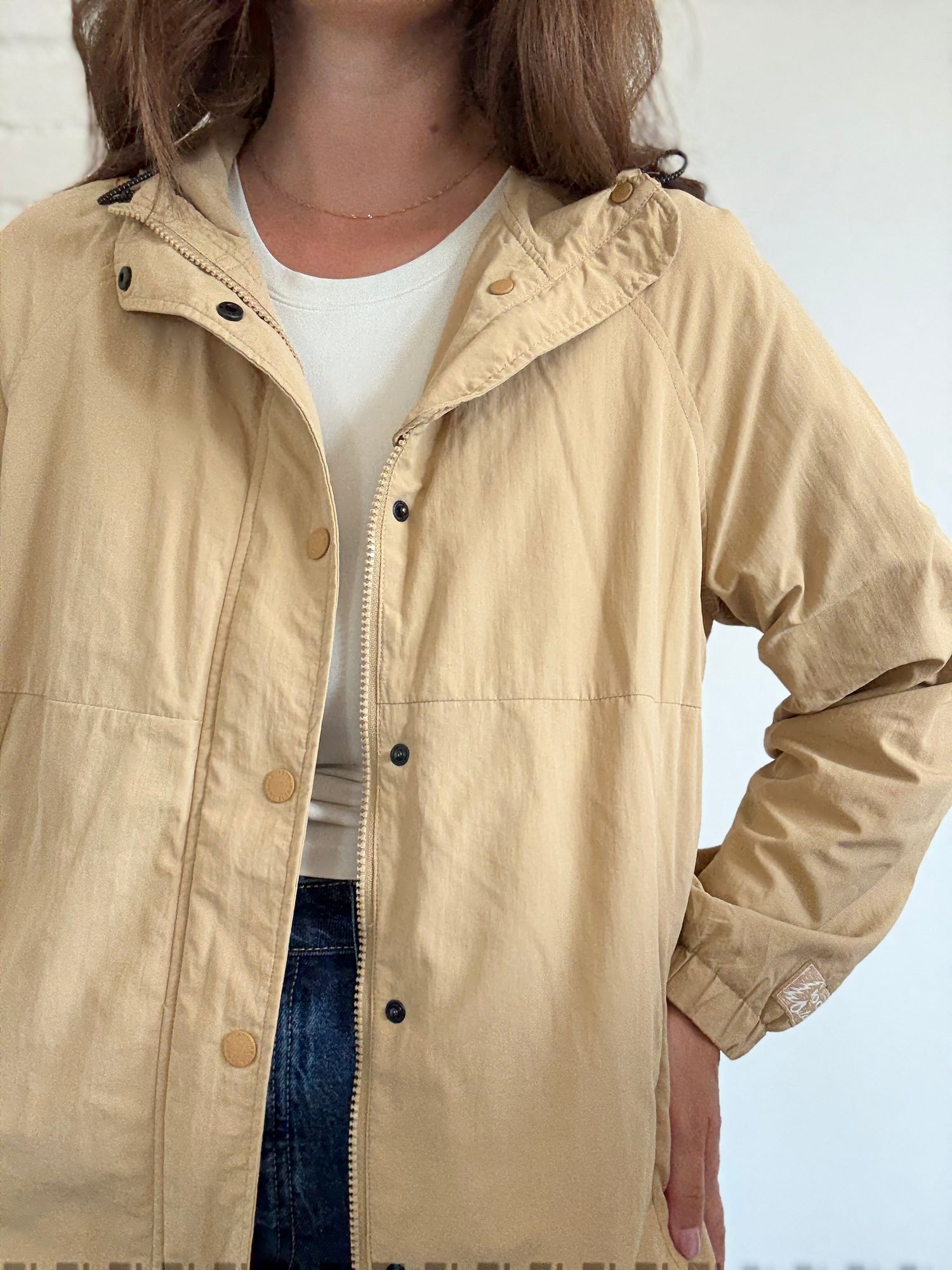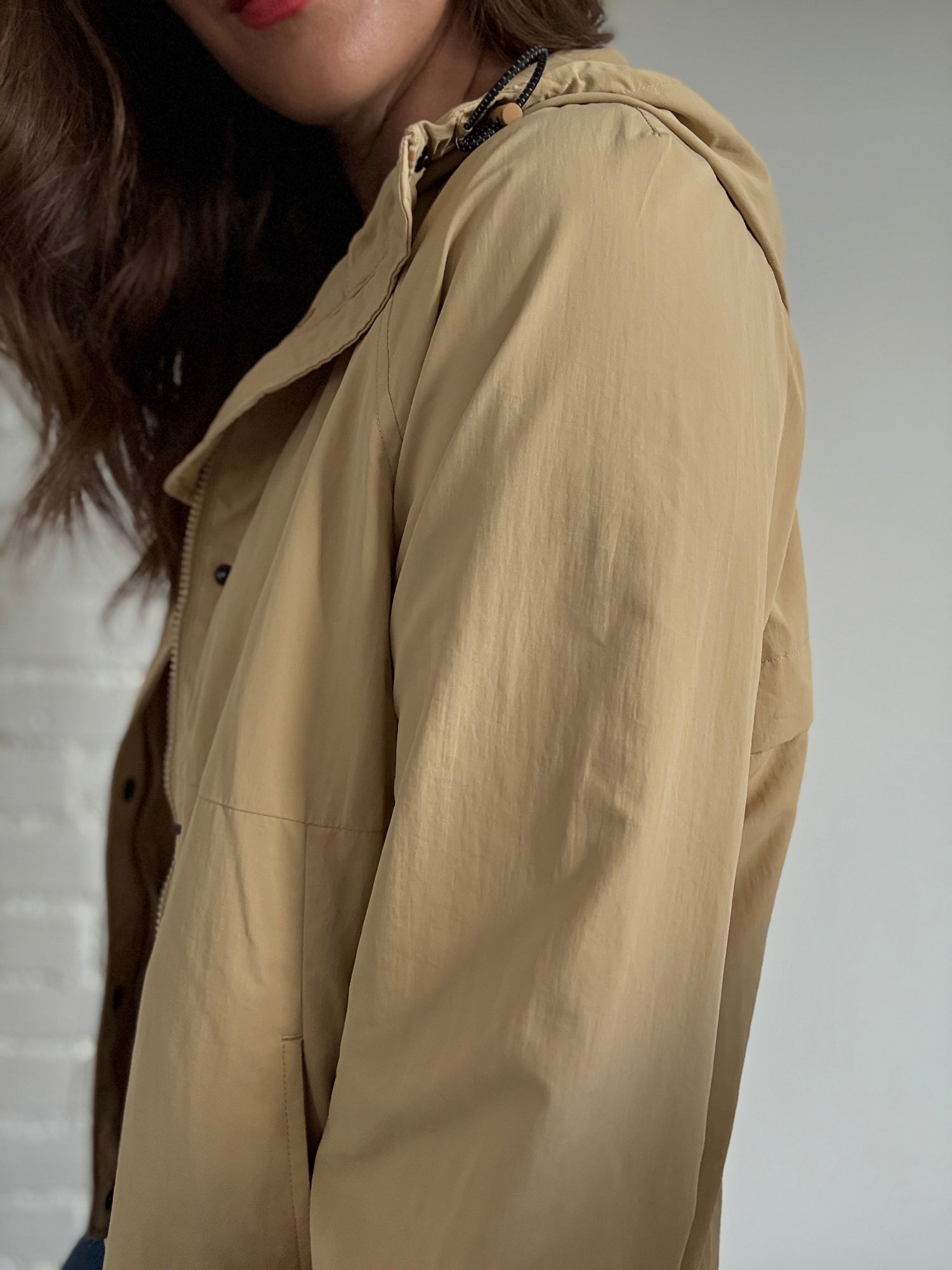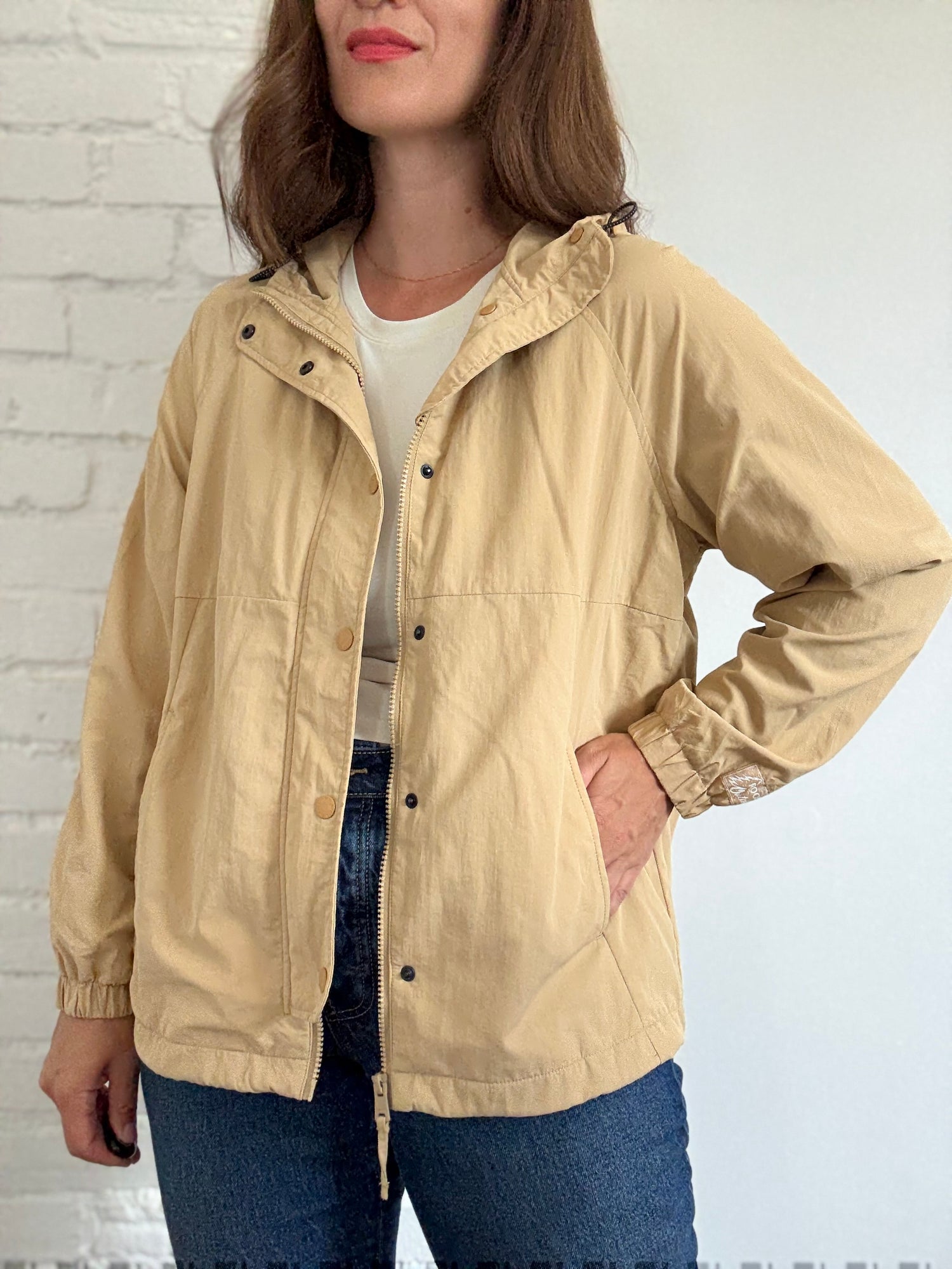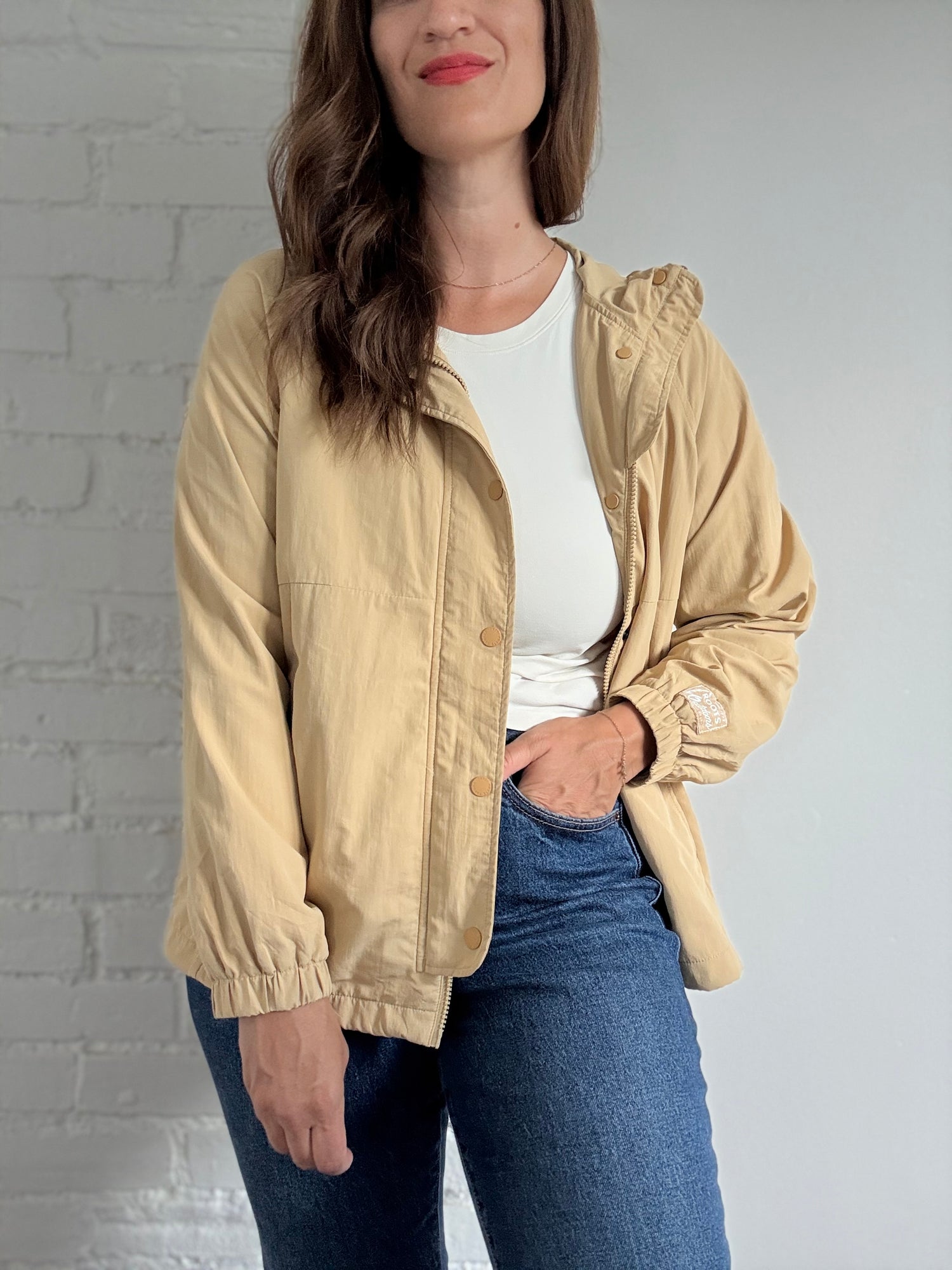 A high-quality outdoor nylon jacket, in a luxurious tan colour. This jackets is designed for both style and functionality, with features like water resistance, breathability, and convenient pockets.A zipper and snap-button closure infront, front pockets, hood with adjustable string and vent in the back. Interior has a mesh lining, adding to its breathability. Mint condition, like brand new. Retails for $148 CDN.
