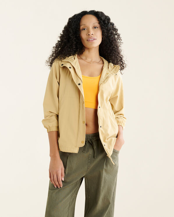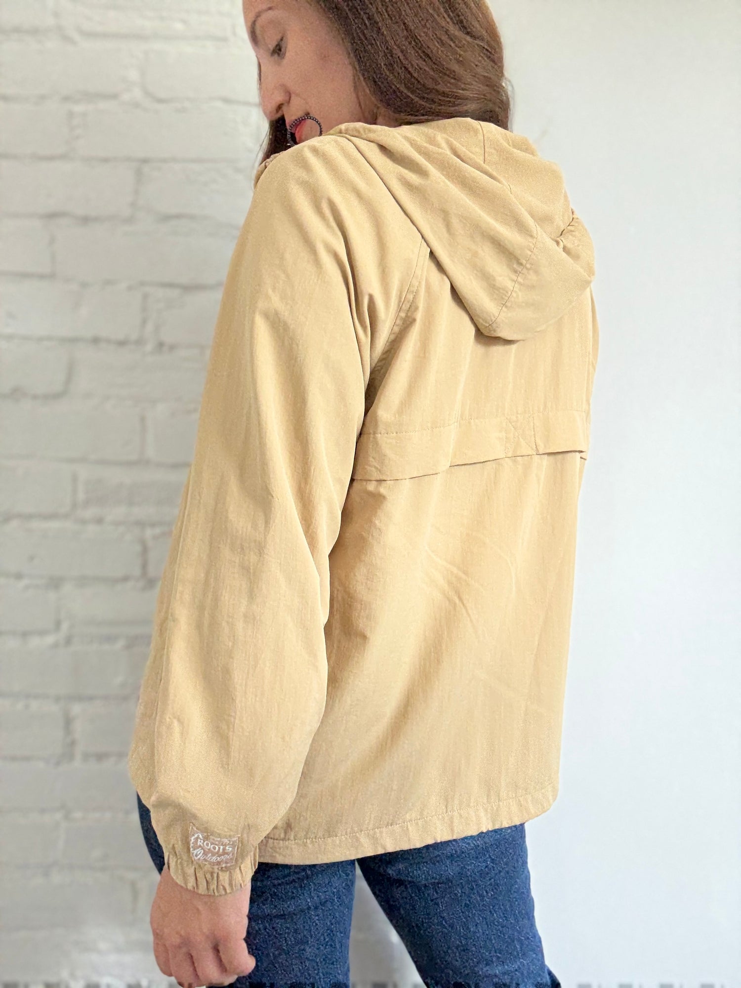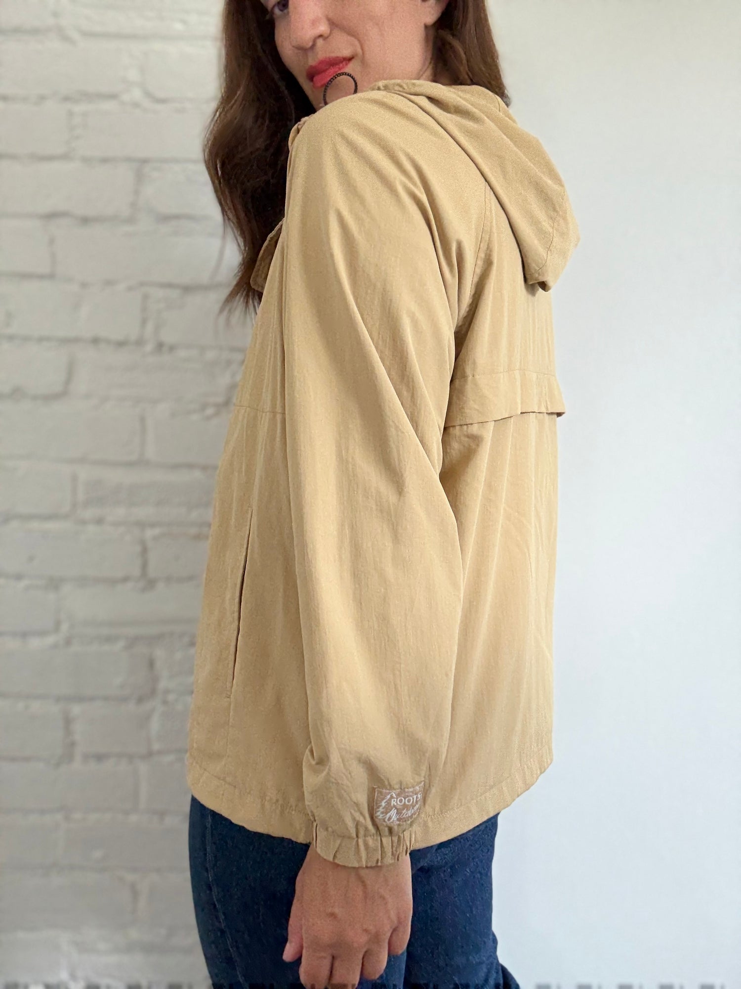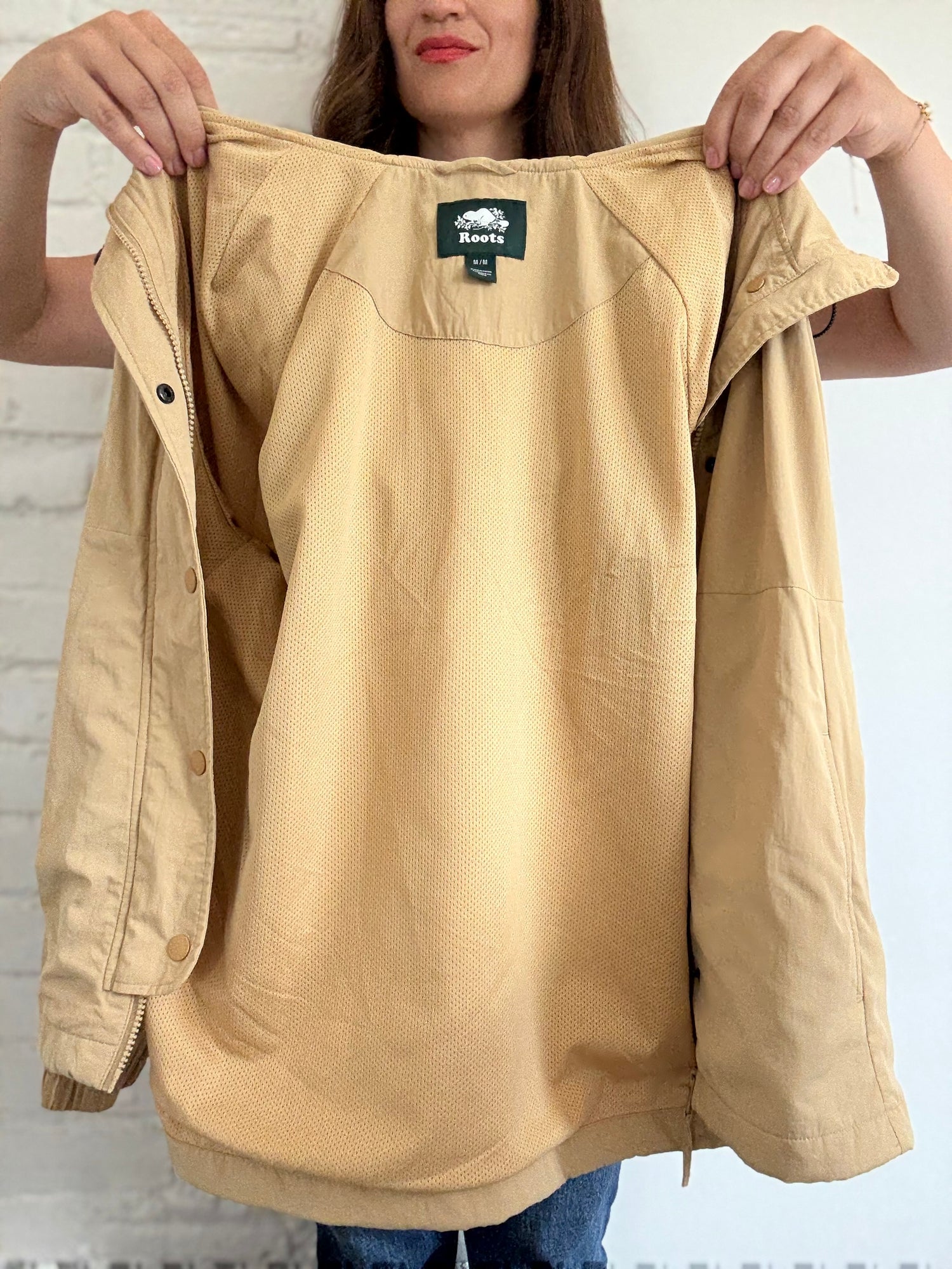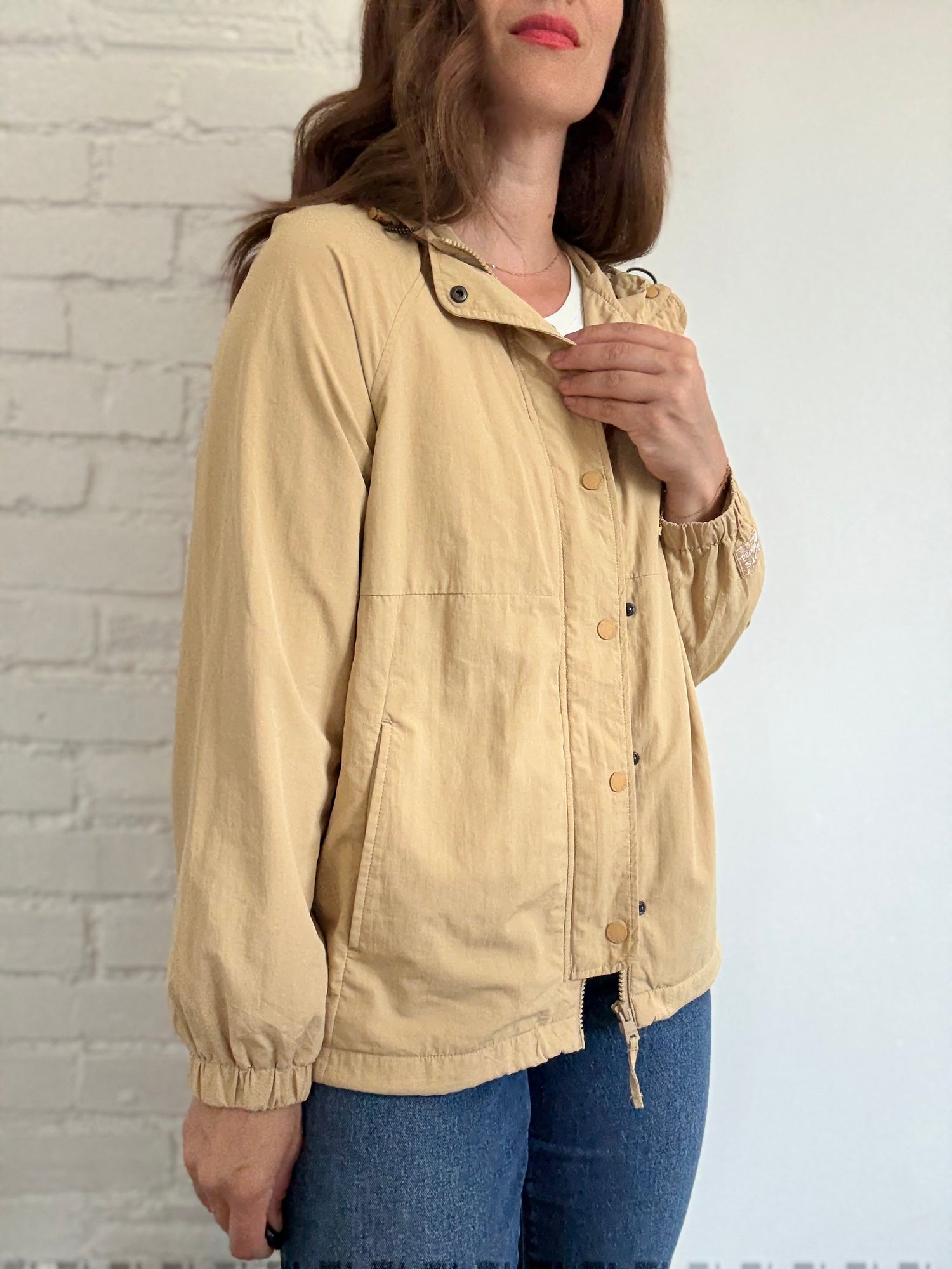 A high-quality outdoor nylon jacket, in a luxurious tan colour. This jackets is designed for both style and functionality, with features like water resistance, breathability, and convenient pockets.A zipper and snap-button closure infront, front pockets, hood with adjustable string and vent in the back. Interior has a mesh lining, adding to its breathability. Mint condition, like brand new. Retails for $148 CDN.
