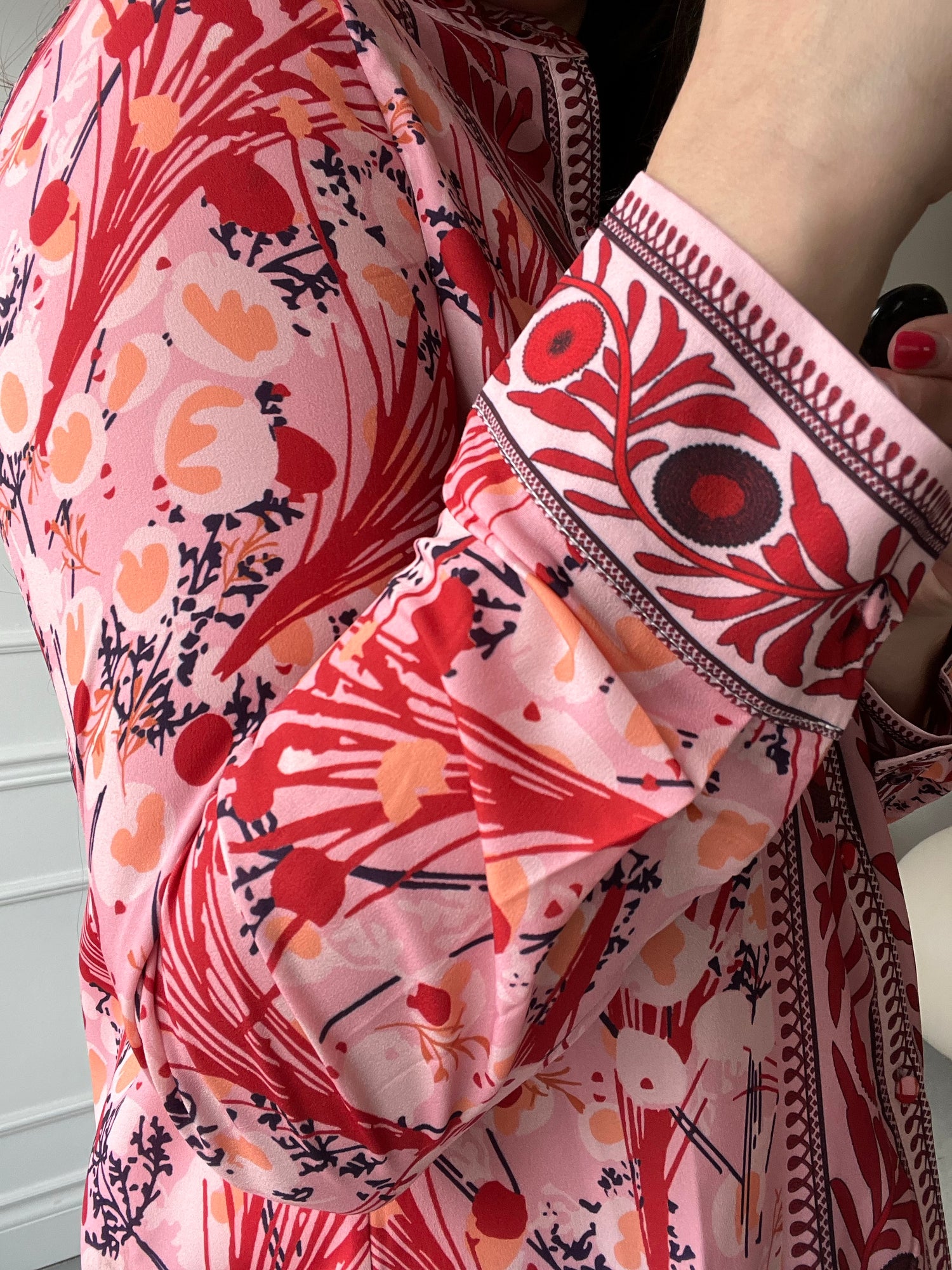 The graphic detail in this blouse is playful, loud and wonderful. Covered in red and pink abstracts, this collarless blouse is the perfect maximalist statement top. Very lightweight, polyester material with pink buttons and no collar. Step back into the office with a splash. No sizing tag on the inside, but fits like a M, or a smaller-fitting large.
