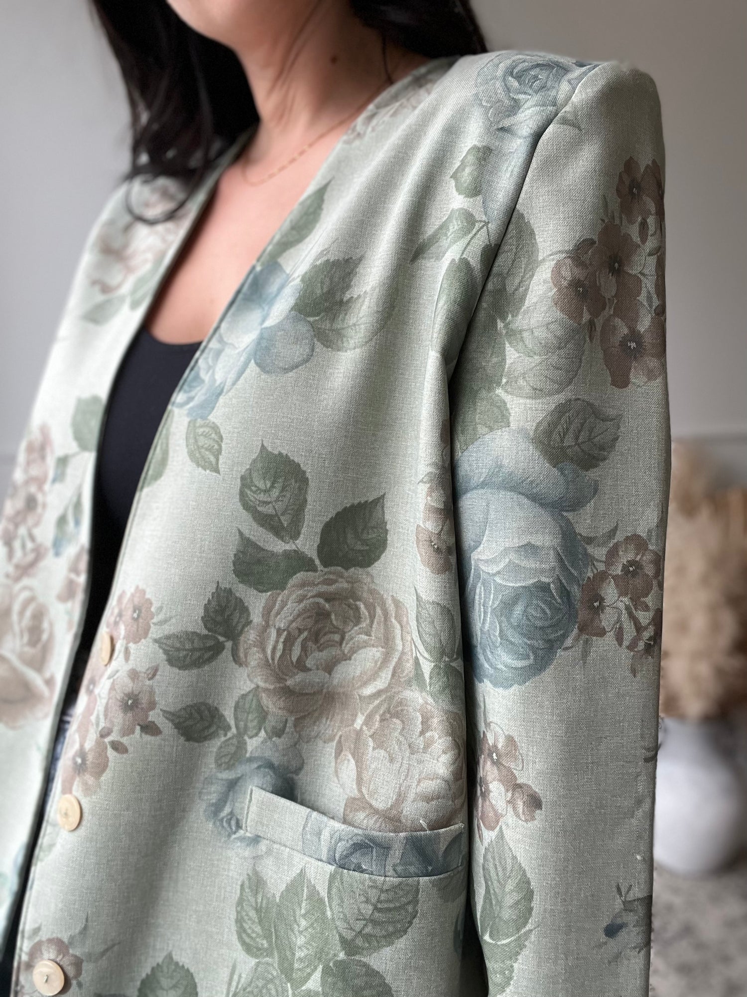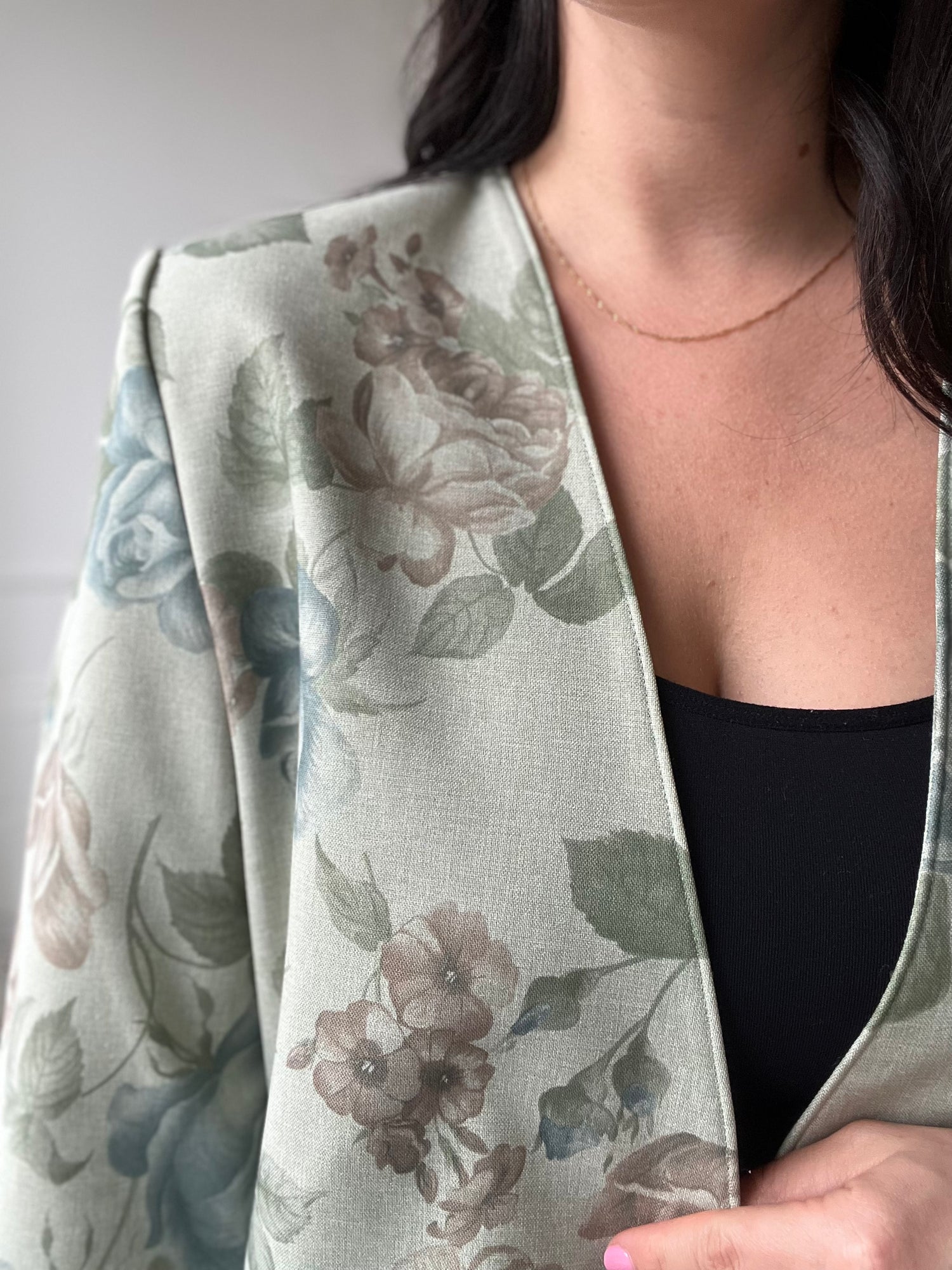 A gorgeous sage green blazer with large florals throughout. A pop of muted pink and navy blue, this vintage blazer is truly stunning. A great spring topper, this blazer can be worn as a light jacket. 3-beige marble buttons on front. Wear this beauty open or closed.