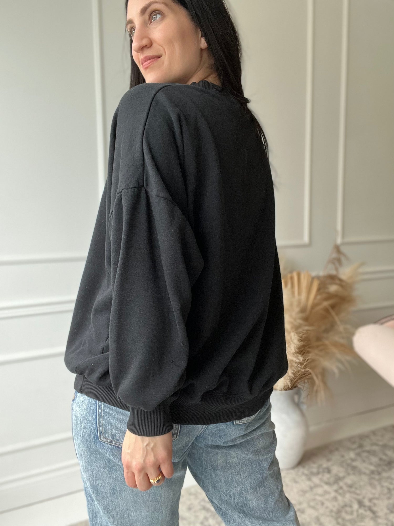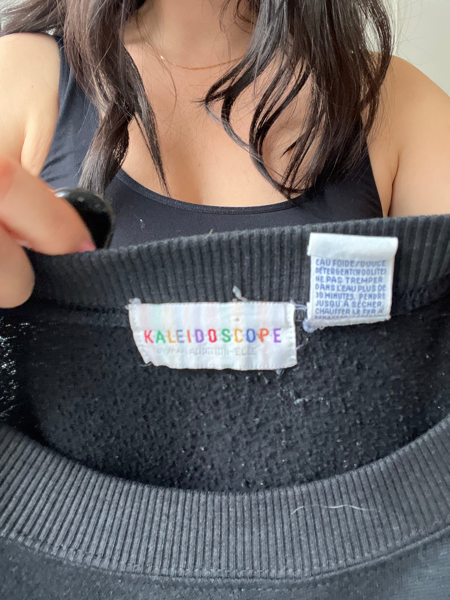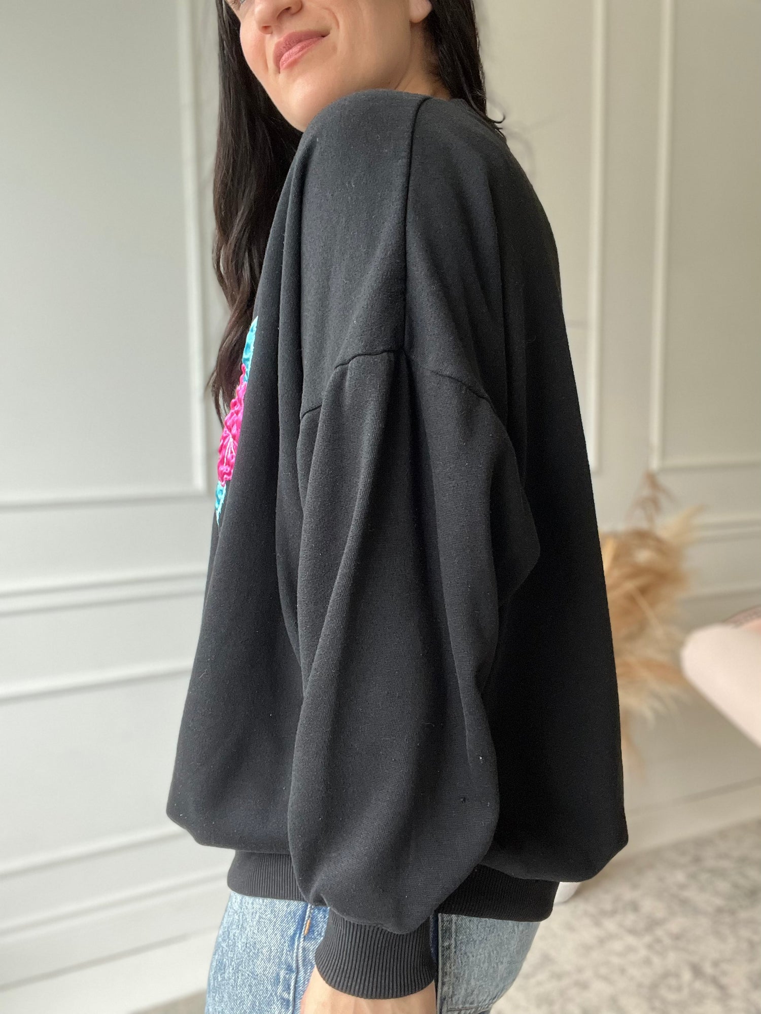 This sweater takes me back to the 80s. Its dark black crewneck, contrasted with a satin hot pin and turquoise floral design is playful and unique. Floral has hand-embroidered edging. A couple minor pulls on upper left shoulder which adds to its grungy vintage look. This is a size 3XL, but looks excellent oversized. Paired beautifully with leggings or bike shorts.