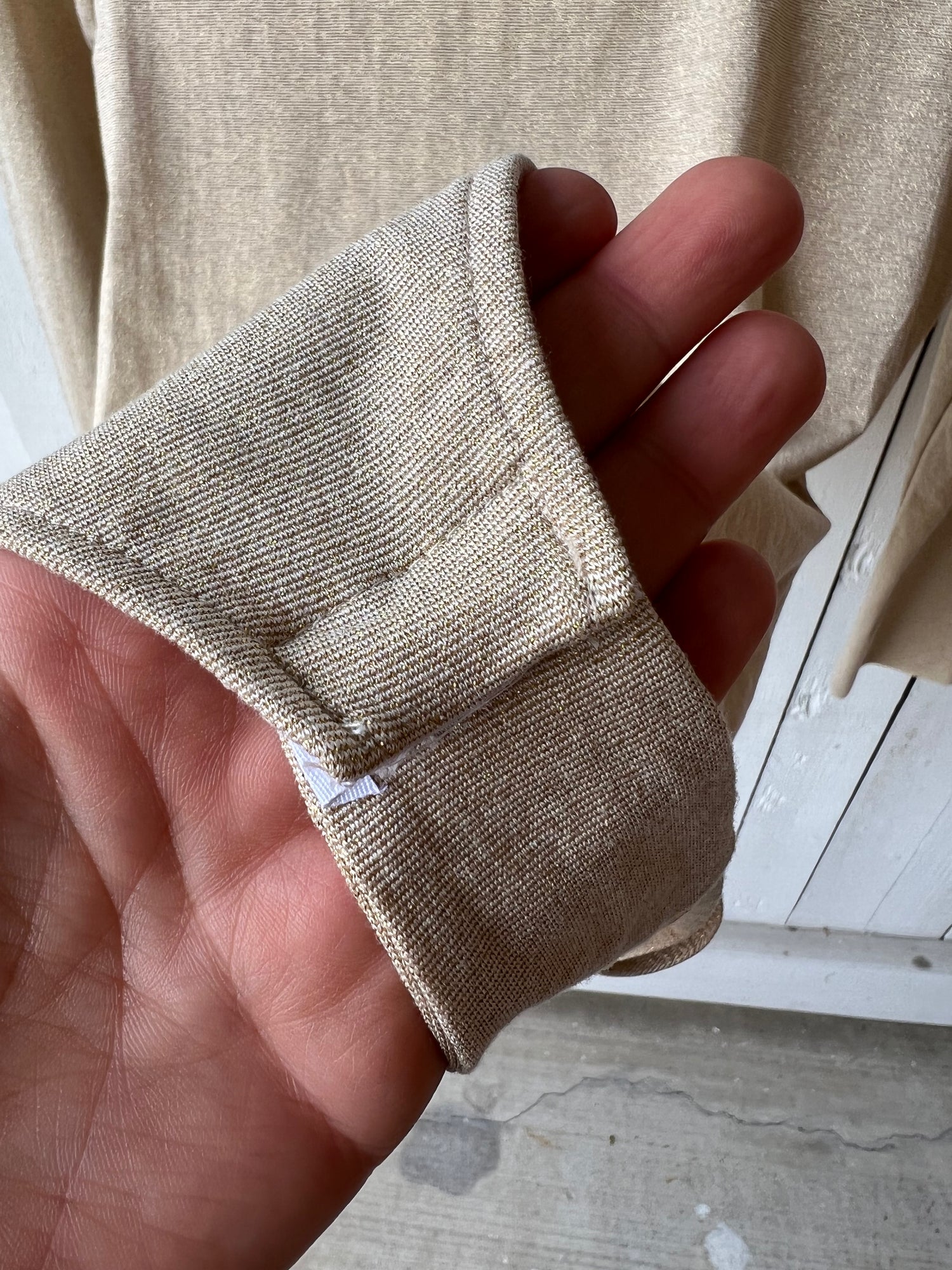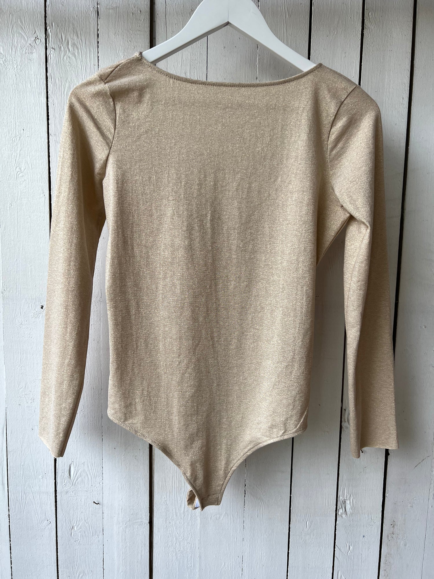 A brand-new-with-tags golden, muted shimmer long sleeve body suit. Scoop back, and snap button closure down south.