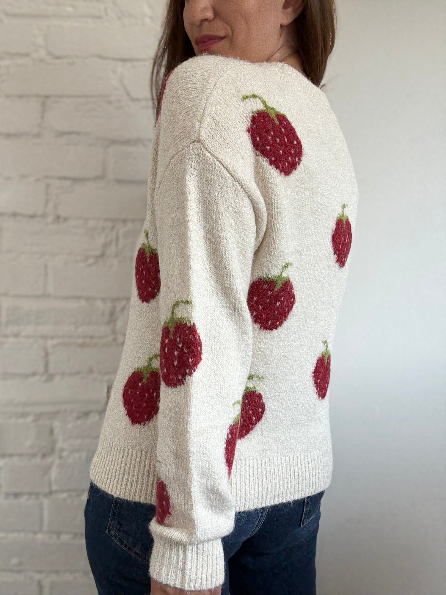 Sometimes its hard to transition into fall, so we're bringing the fruit with us. A cozy soft sweater with strawberries all over, in this stretchy ivory knit.