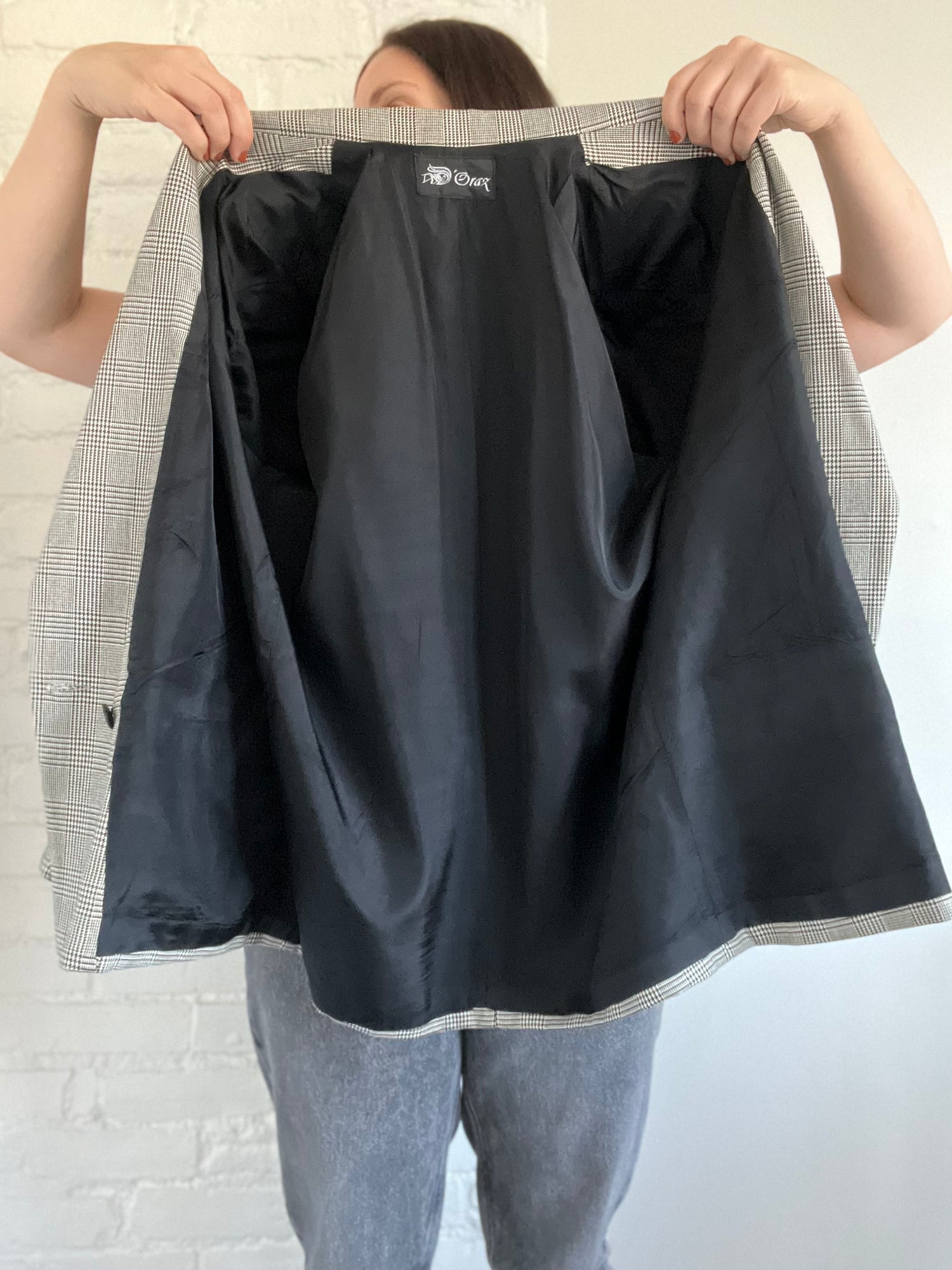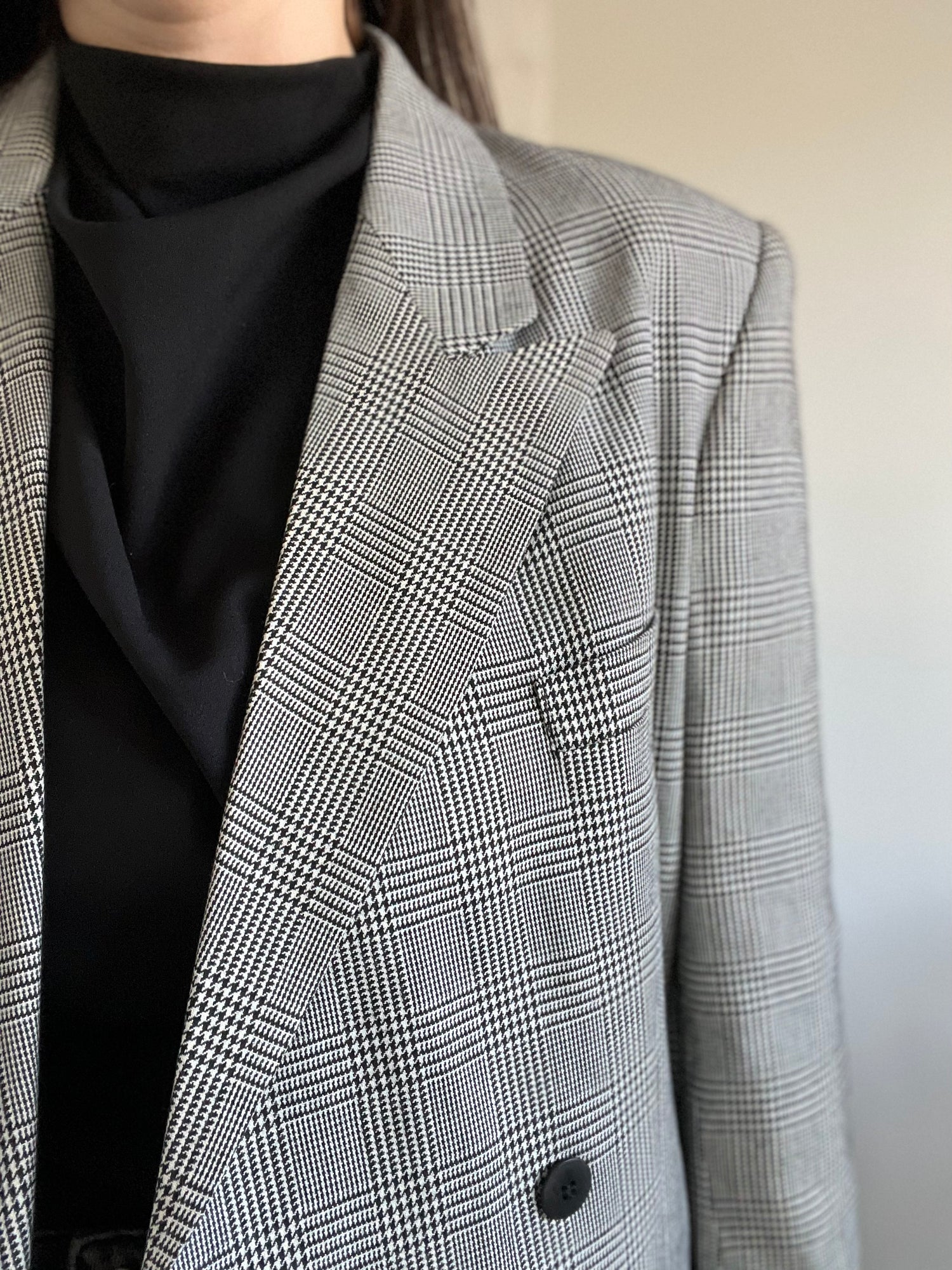 She is all business. A gorgeous black and white houndstooth blazer with a relaxed fit, and double-breasted. A detailed duo-shaped collar that falls flat, and lined on the inside.