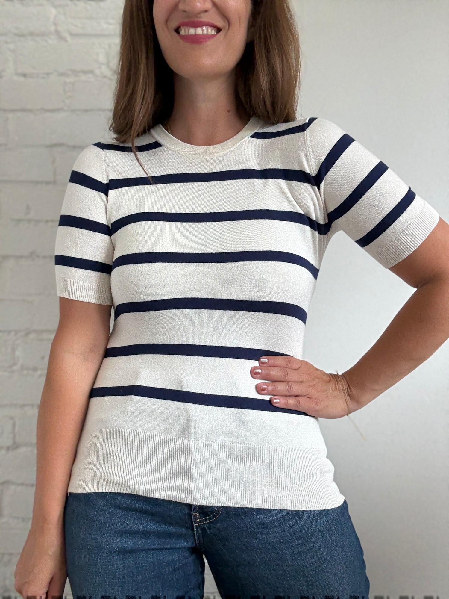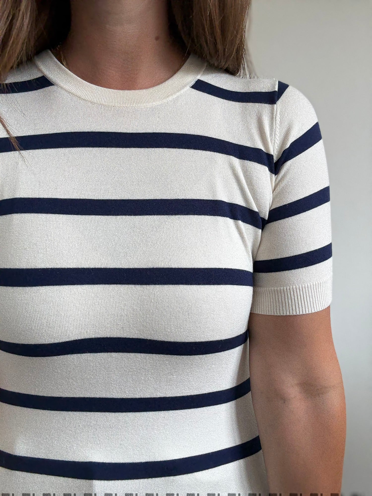 An everyday luxury piece to add to your closet staples. Ivory with black horizontal lines, and a very high-quality fabric. Very stretchy with a relaxed, silky fit. Mint condition.