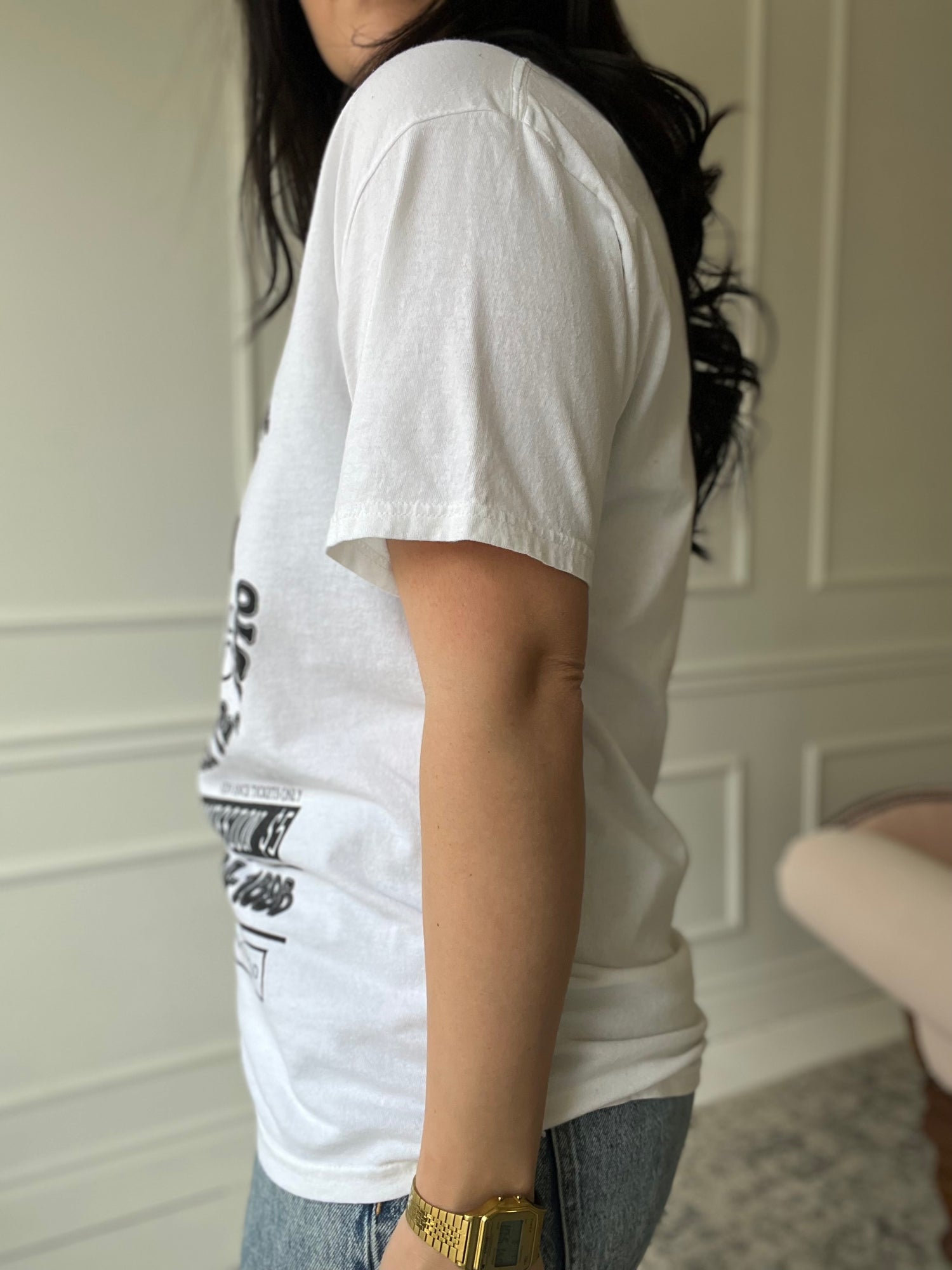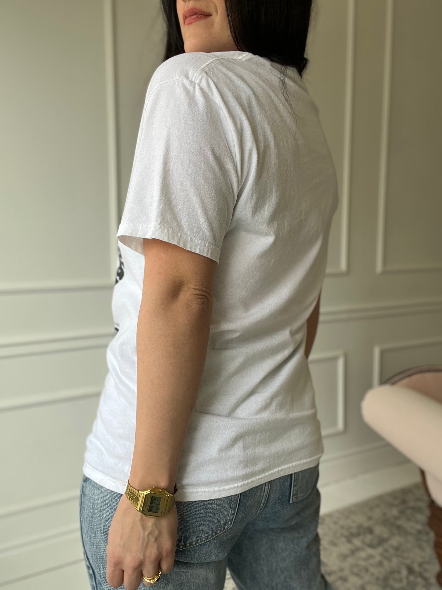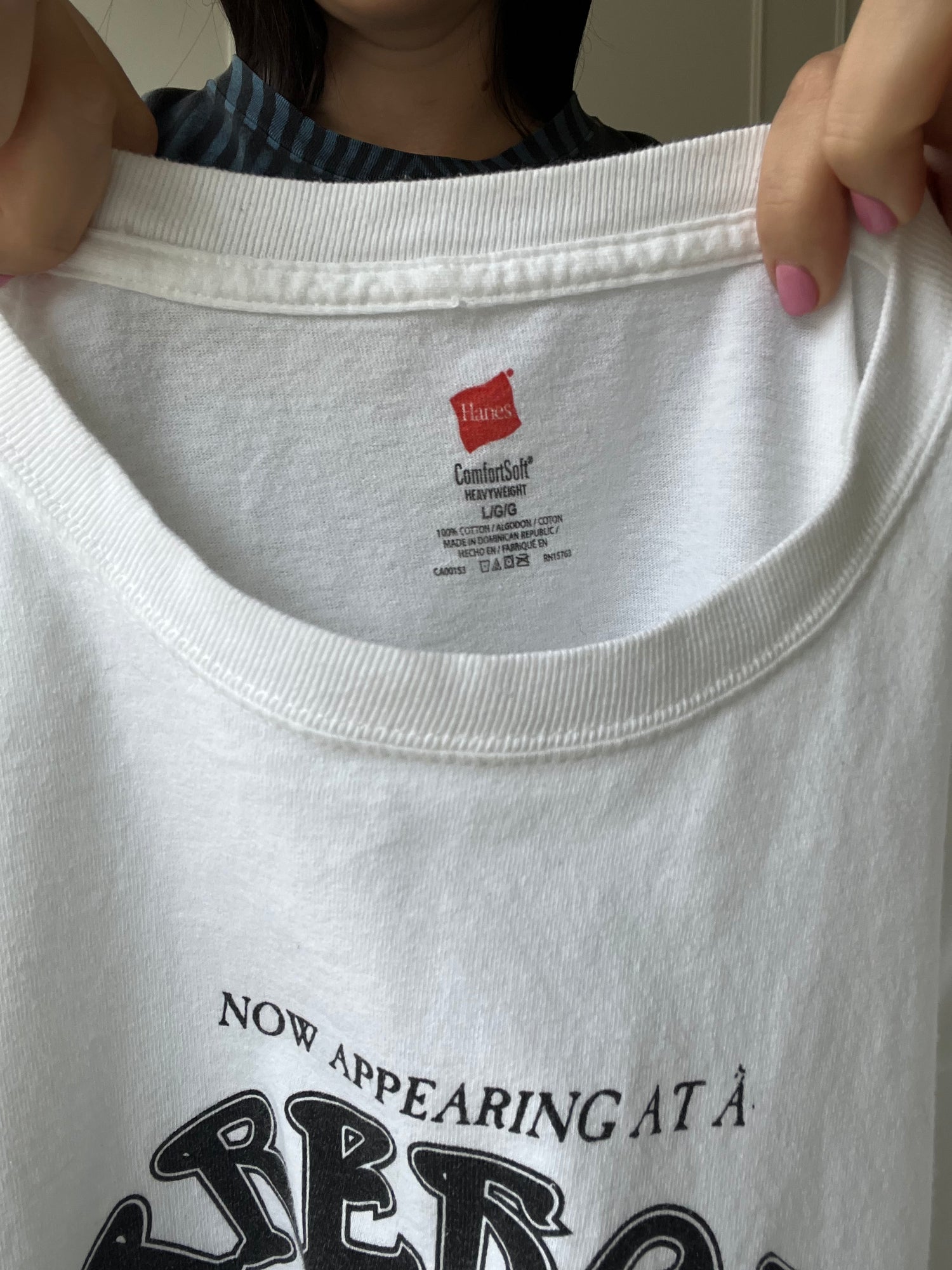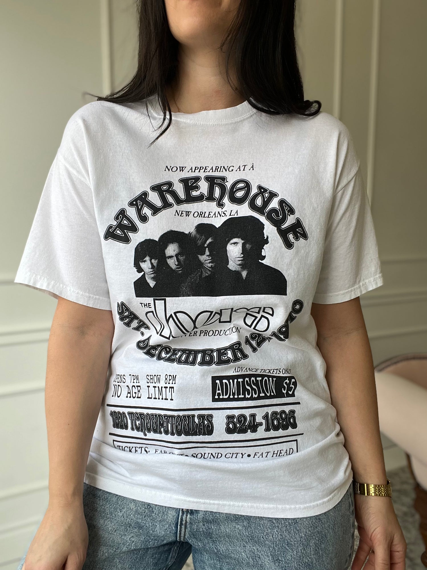 What a rare band tee. The Doors appearing at the Warehouse on December 12th, 1970. It's a flawless, white and black tee with a gorgeous graphic print. I don't believe this shirt is true vintage, but it was likely printed 10+ years ago based on the Hanes tag. It's a comfort, heavyweight cotton.