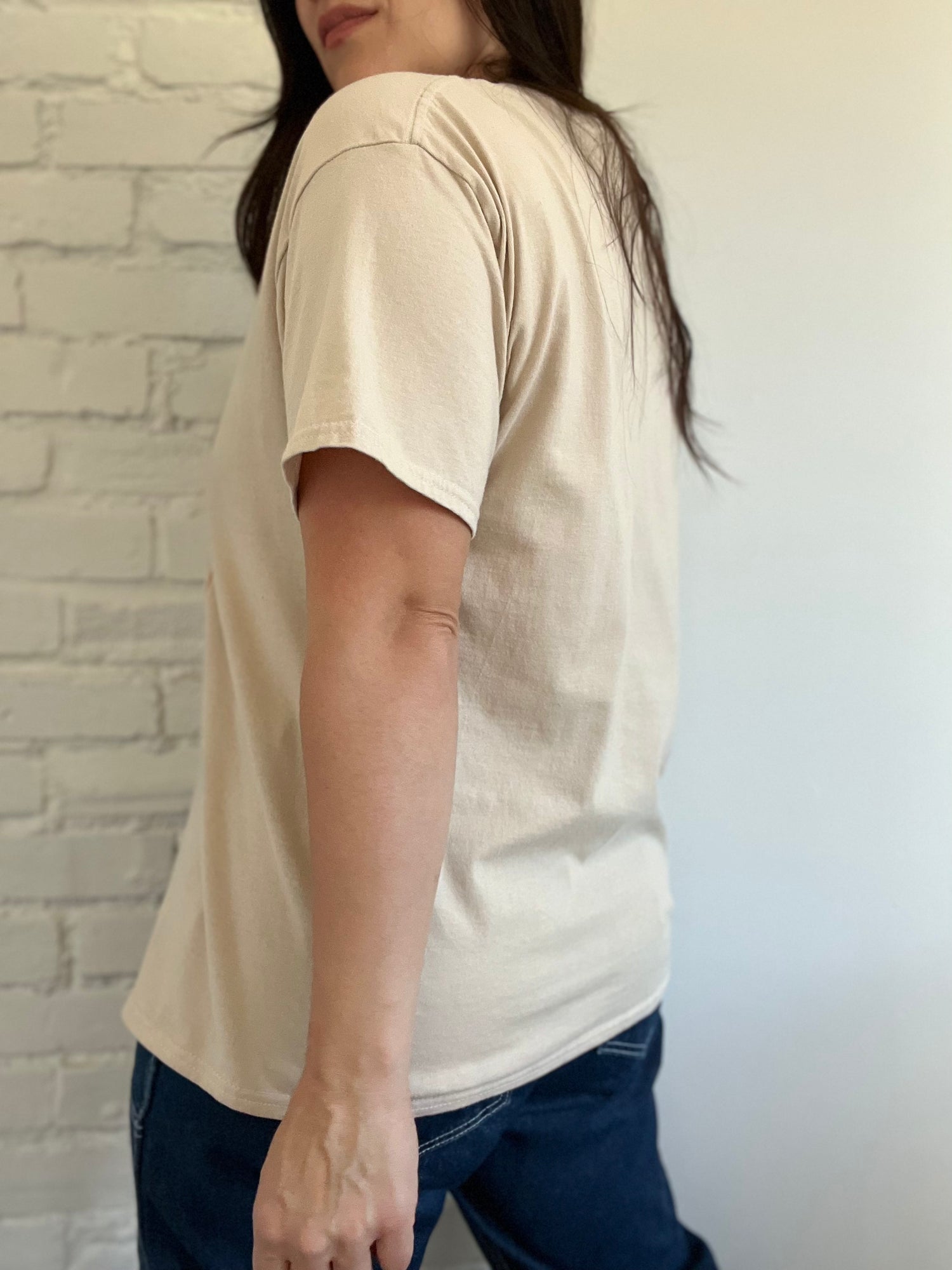 A rare The Smiths, "The Queen is Dead" US Tour 86' t-shirt. A creamy beige all over with dark royal blue and orange graphics. Perhaps more iconic now that ever before, this shirt shows Morrissey's unhappiness with the British monarchy. Fits like a small mens L.