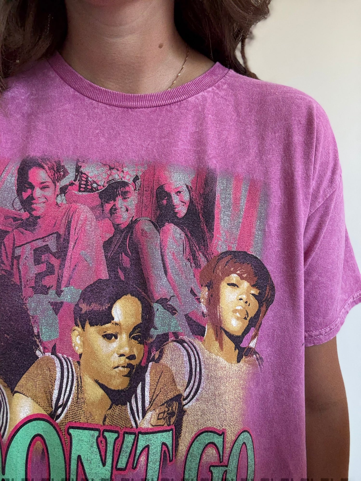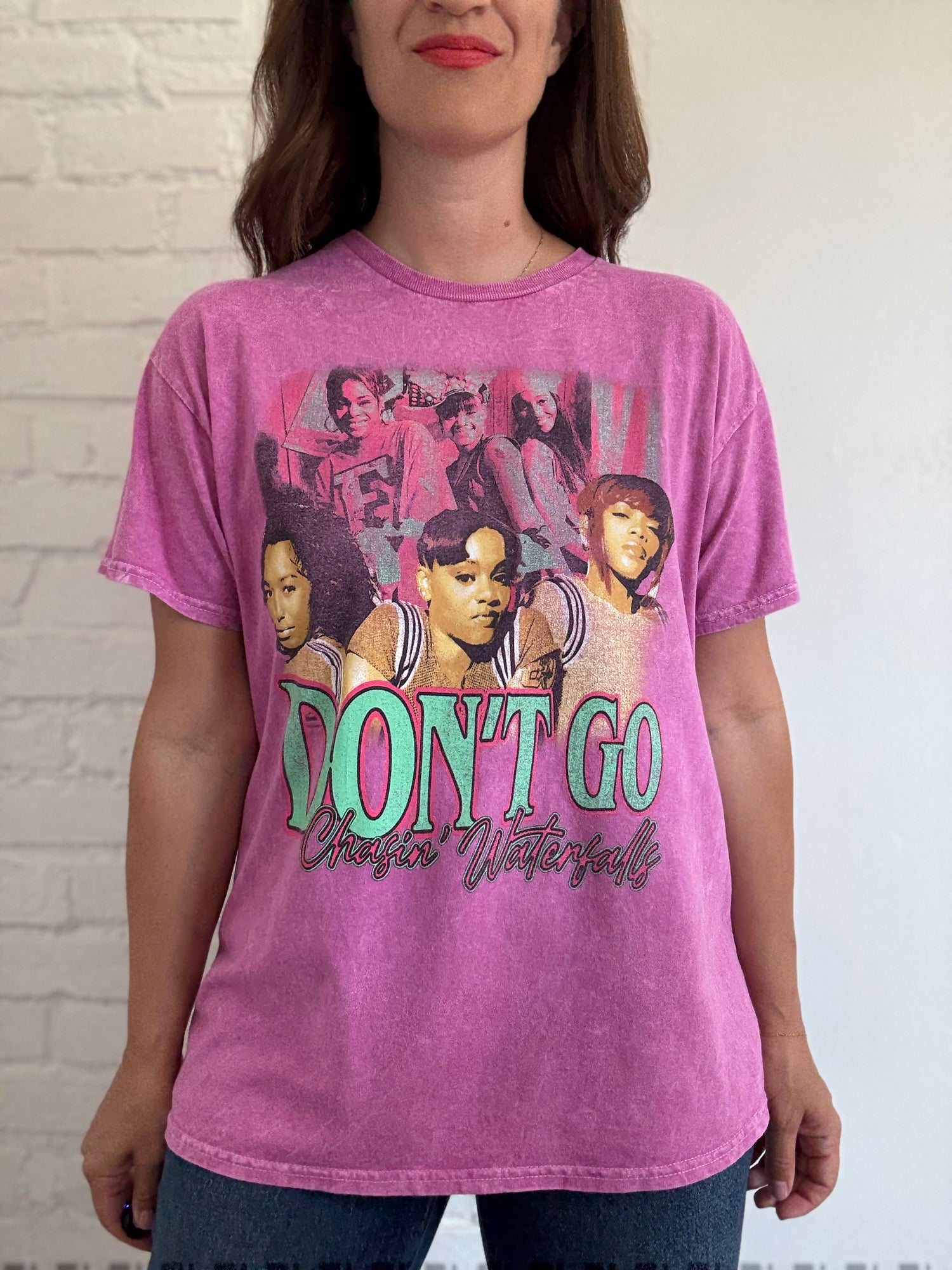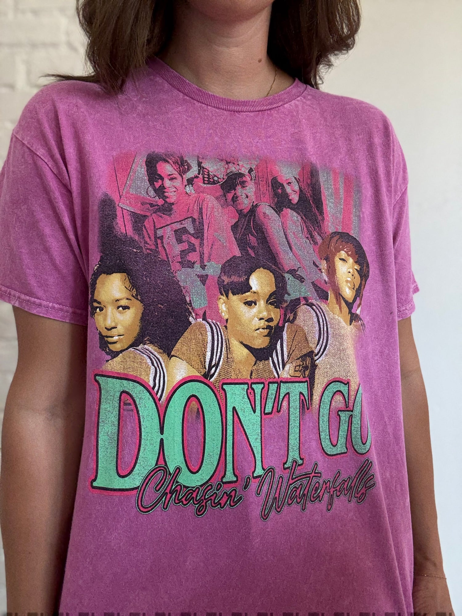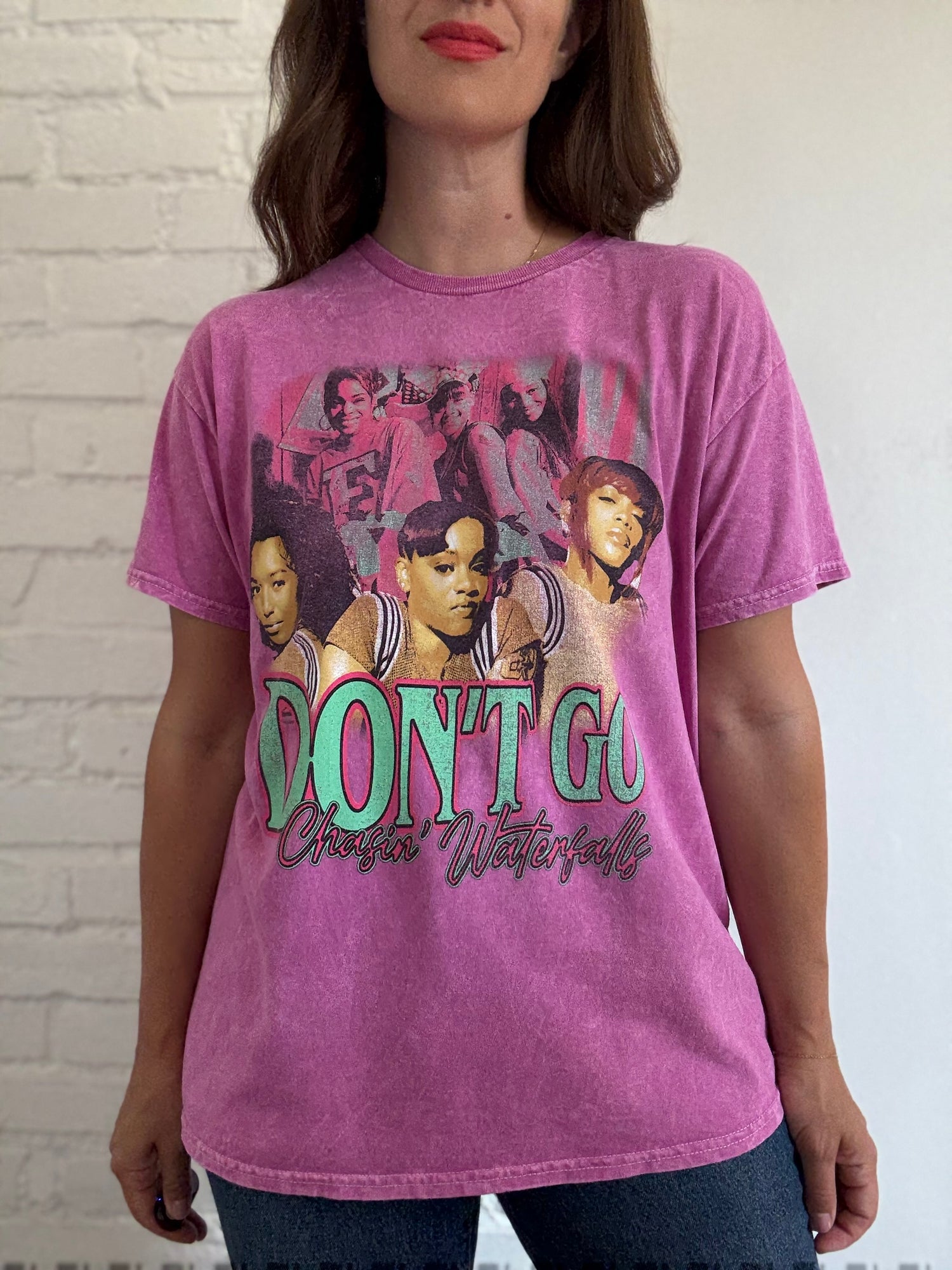 A pink tie-dye t-shirt with our favourite girl group - TLC. "Don't Go Chasing Waterfalls" printed on the front, under a collage of nostalgic photos. This shirt is a worn-in cotton, and in wonderful condition.