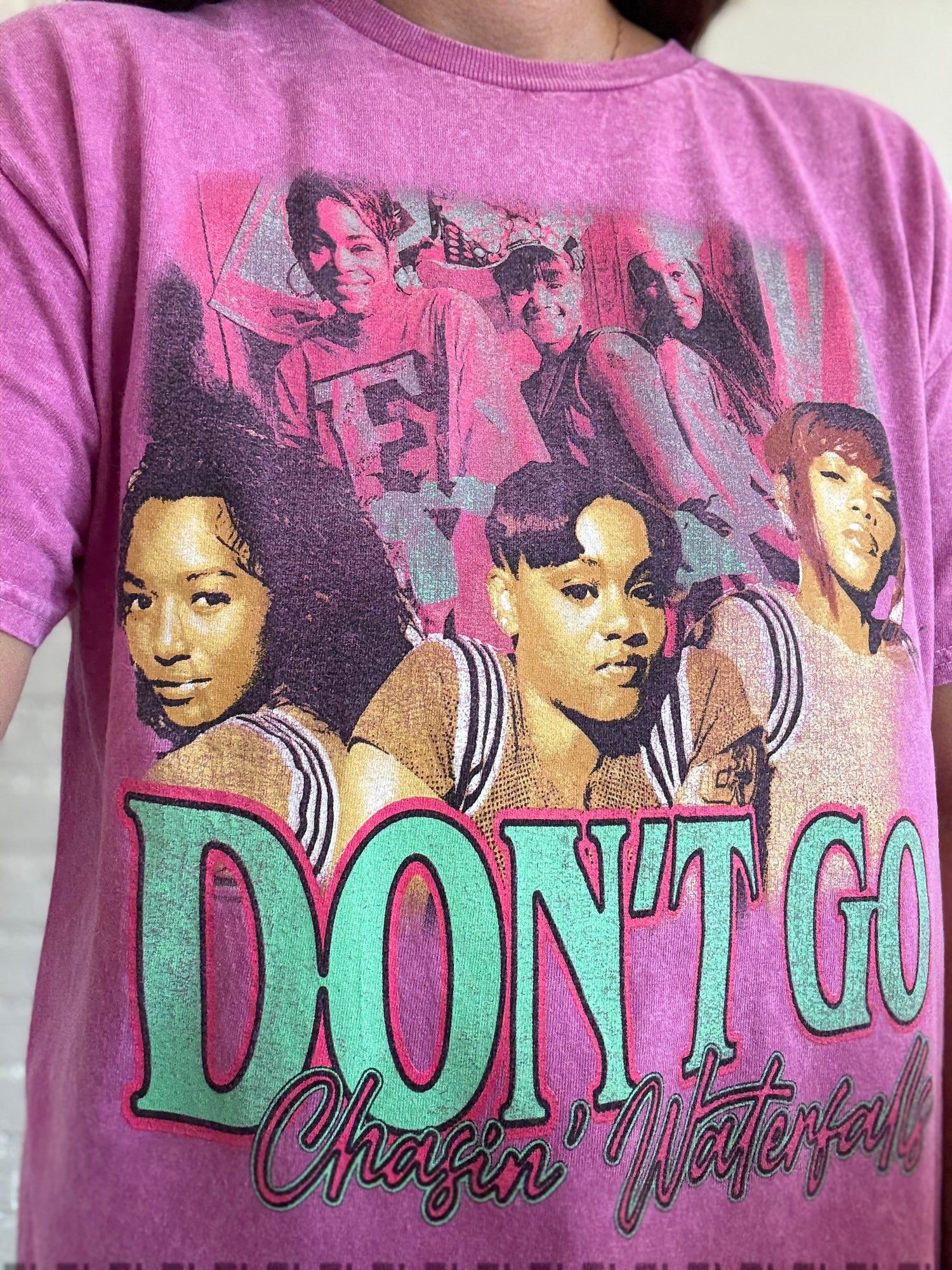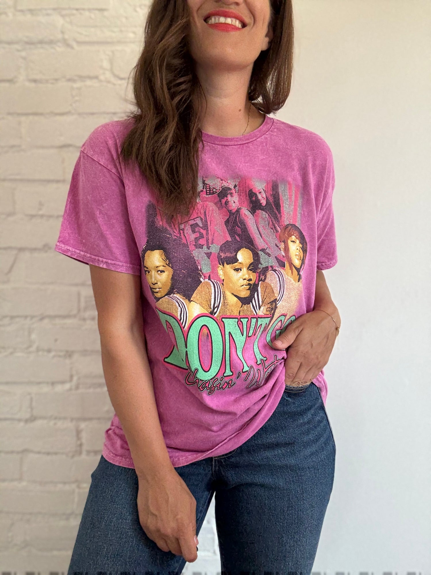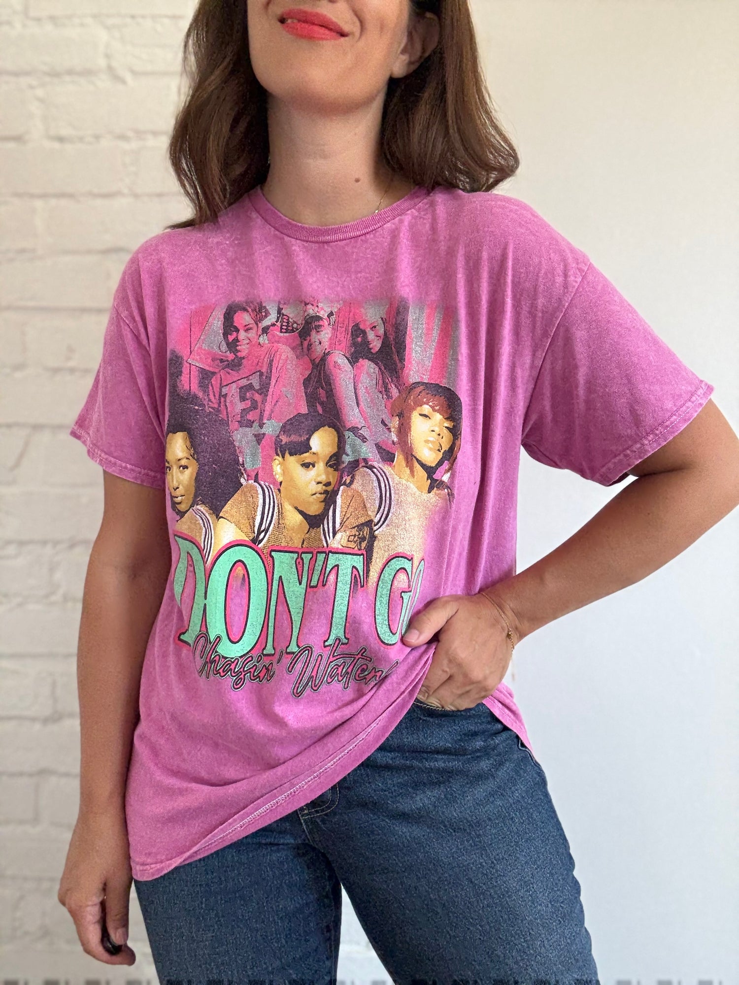 A pink tie-dye t-shirt with our favourite girl group - TLC. "Don't Go Chasing Waterfalls" printed on the front, under a collage of nostalgic photos. This shirt is a worn-in cotton, and in wonderful condition.