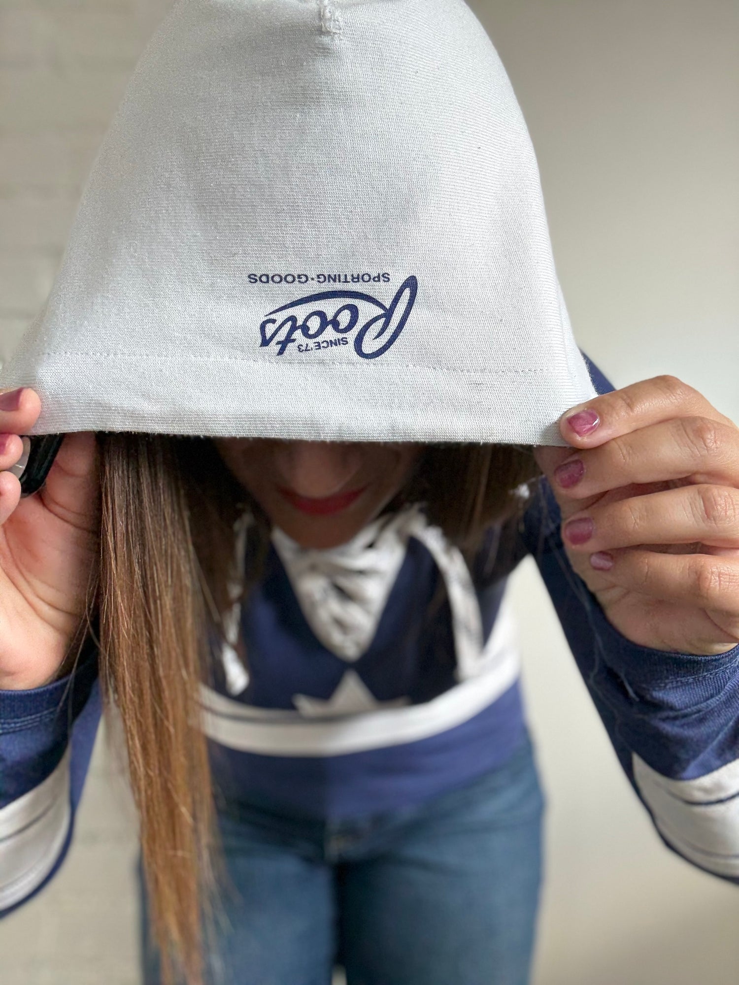 From a vintage collection, a Toronto Maple Leafs x Roots collaboration jersey sweater takes the stage. Shown like a true vintage jersey, this long sleeve sweater knit has high quality and details all over. An embossed stitch across the front canvas maple leaf, and a v-neck rope tie. Hooded on the back, with Roots Sporting Goods in the old logo written across the back.