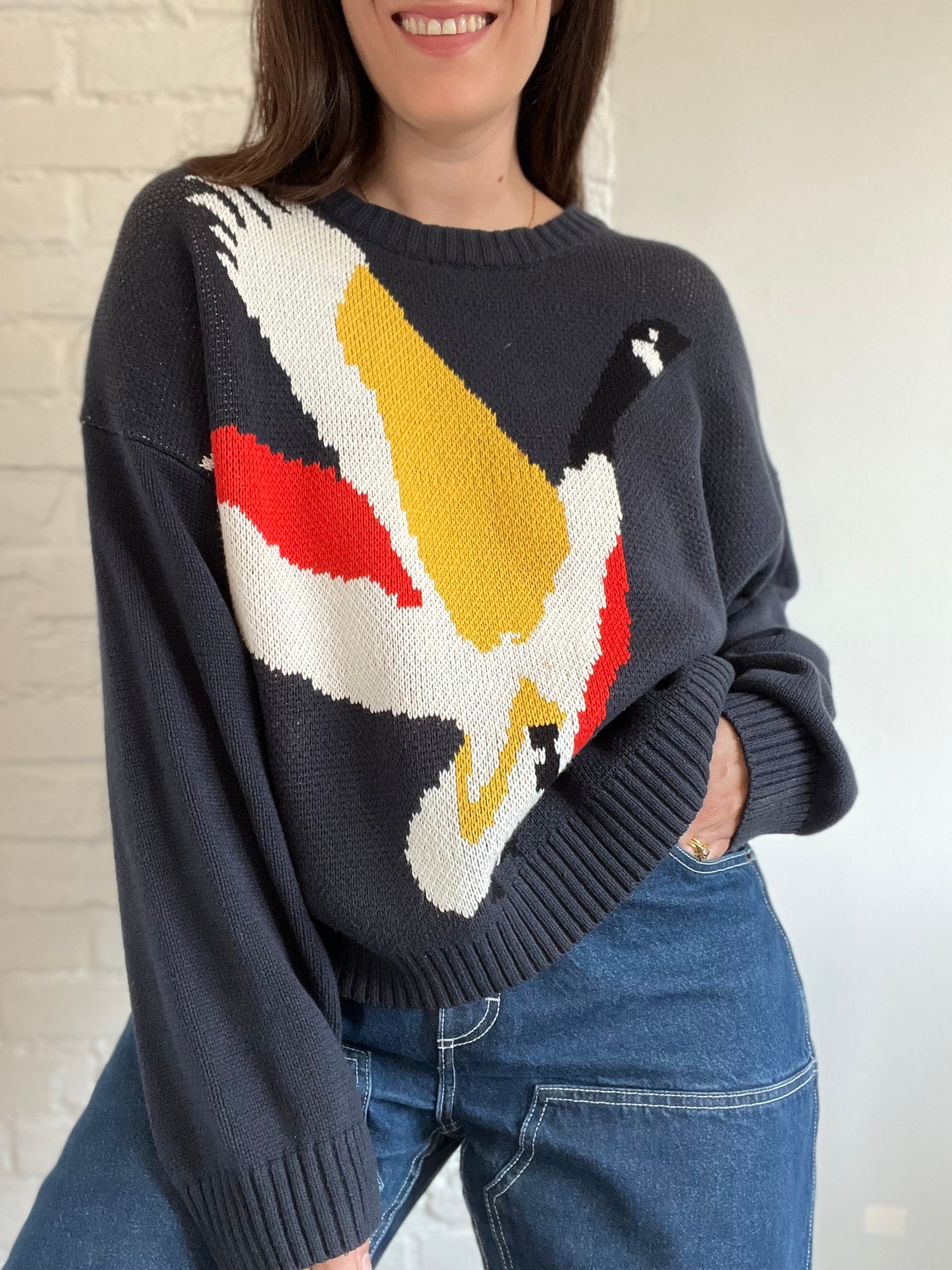 An oversized flying goose sweater - the perfect ode to your love for birds, or Thanksgiving style. Navy blue with a large front graphic covering the span of the sweater. Relaxed fit, dropped shoulders, and the perfect cozy for Fall and beyond. Mint condition.