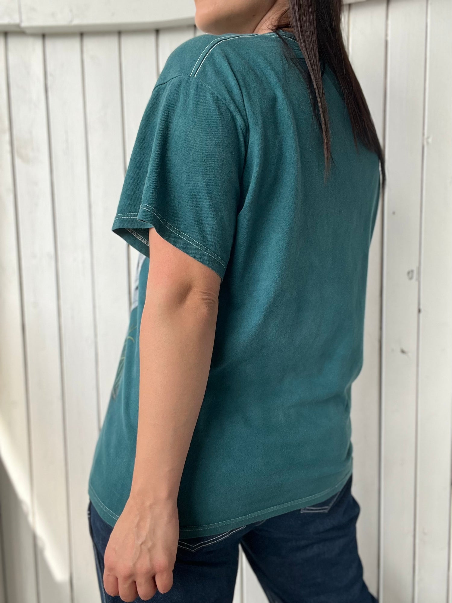 A fierce, white tiger vintage t-shirt against a striking dark turquoise backdrop. This tiger has piercing green eyes. Relaxed, lightweight fit in a vintage cotton, White stitching along rim and shoulders. Rawr.