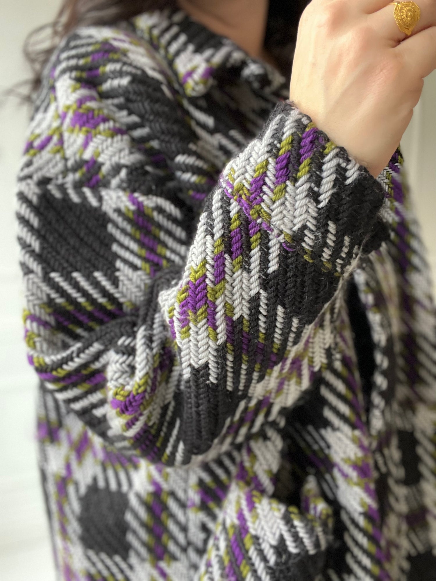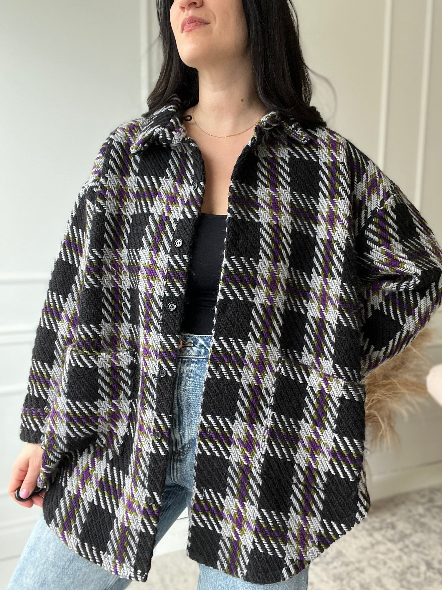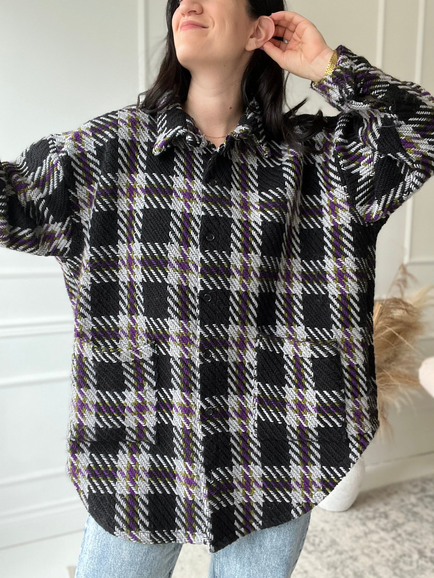 A high quality, boxy, plaid tweed fall shacket in black, purple, green and grey. This gorgeous jacket hangs off the body in a striking way, with a higher hemline in the front. The tweed is full of volume, and rich in texture. Two large front pockets to hold your goodies.