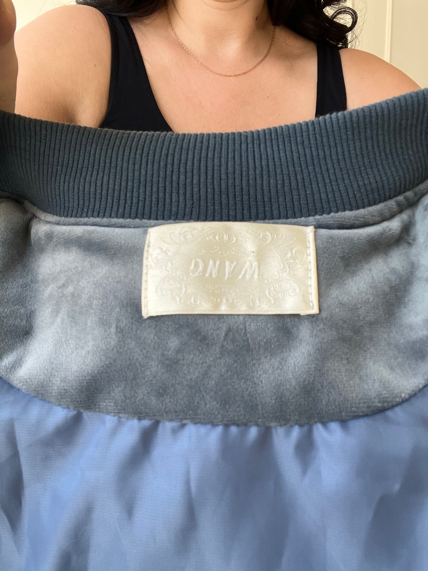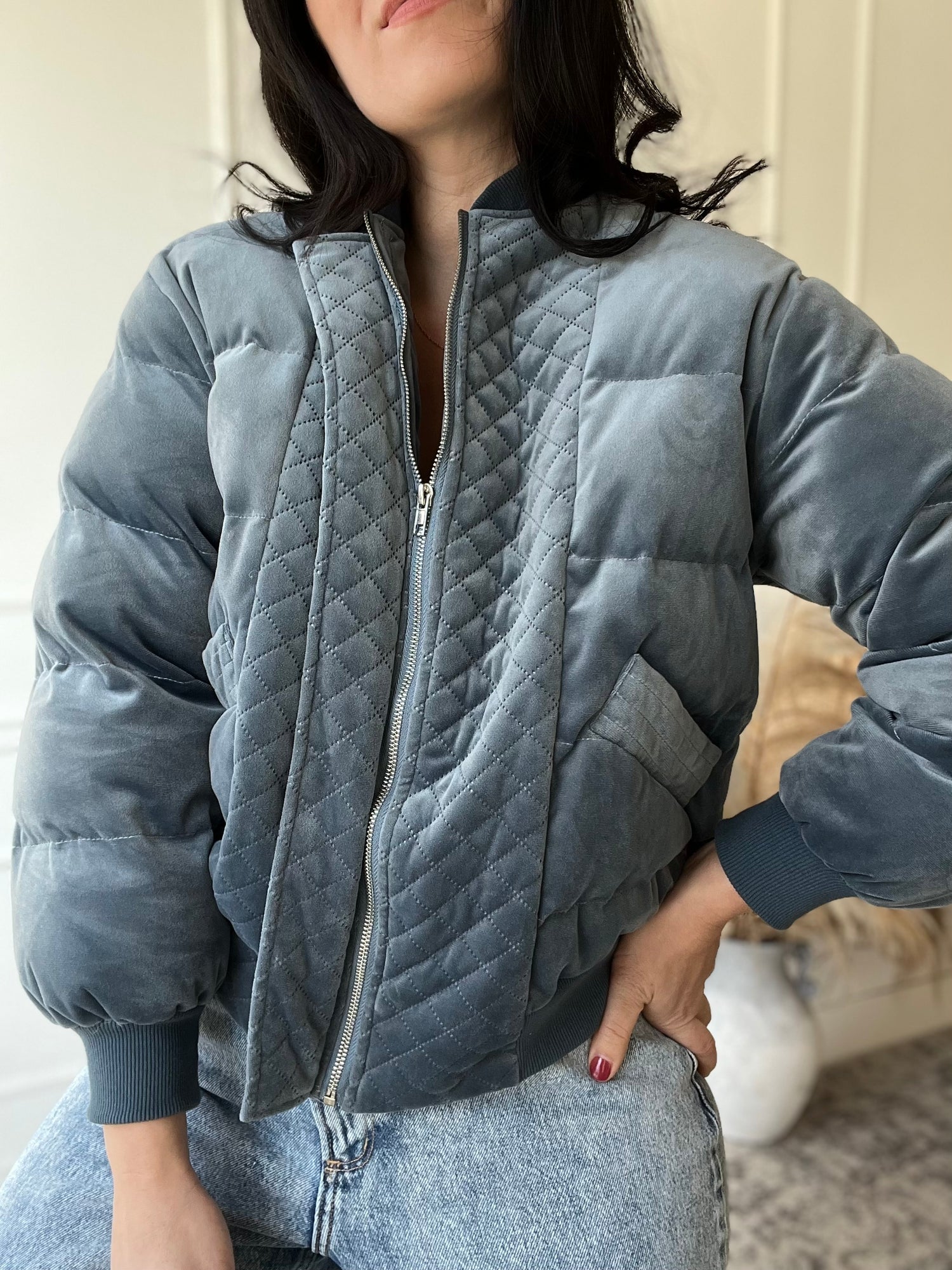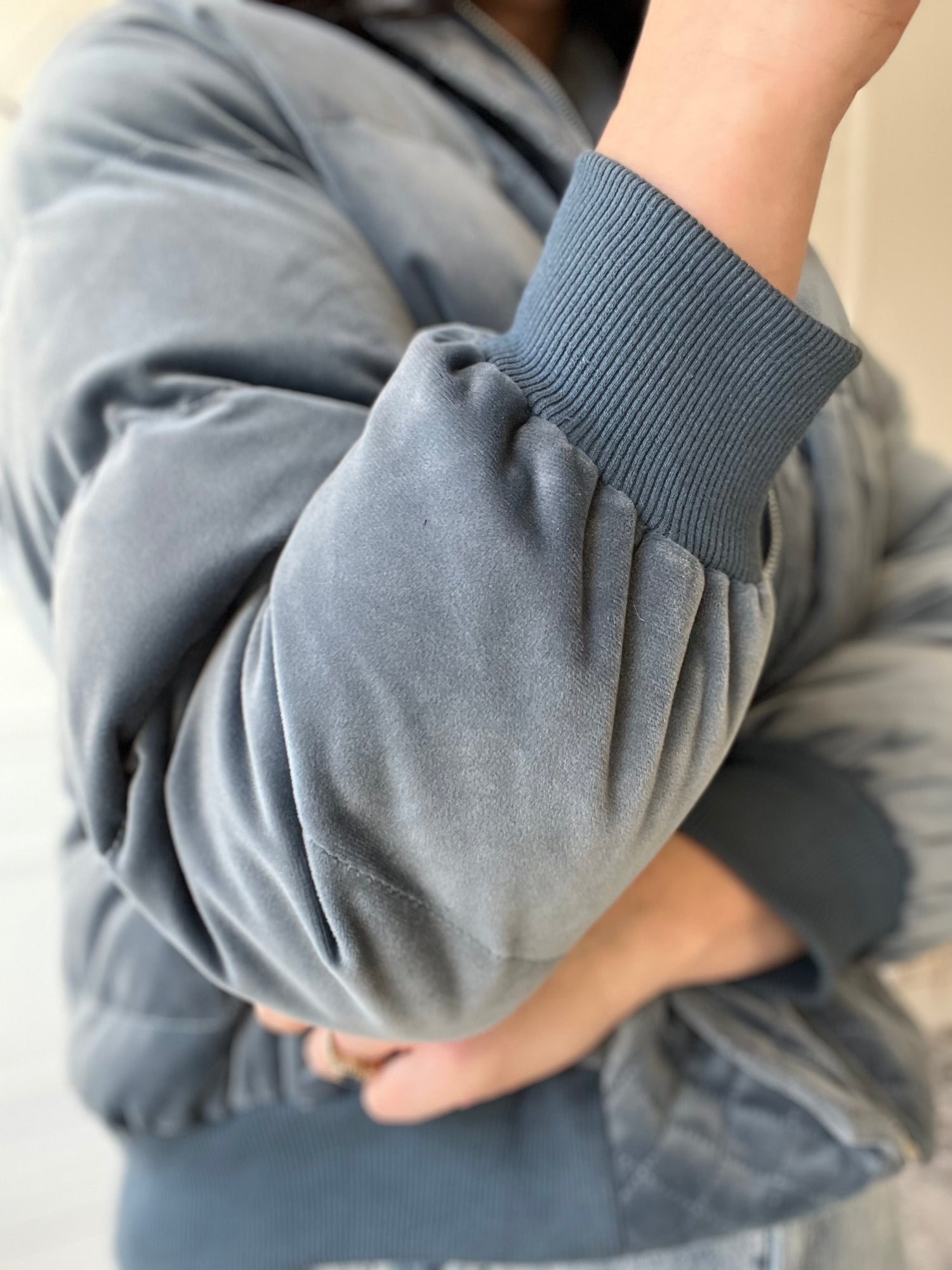 A pewter blue puffer jacket with quilted detailing. Hits at the waist. This jacket is a medium-weight and collarless, making it the perfect transition jacket for Spring. Ribbed cuffs and hem. Lined inside, and two oversized pockets to hold your go-to essentials. Fits like a medium, or a smaller large.