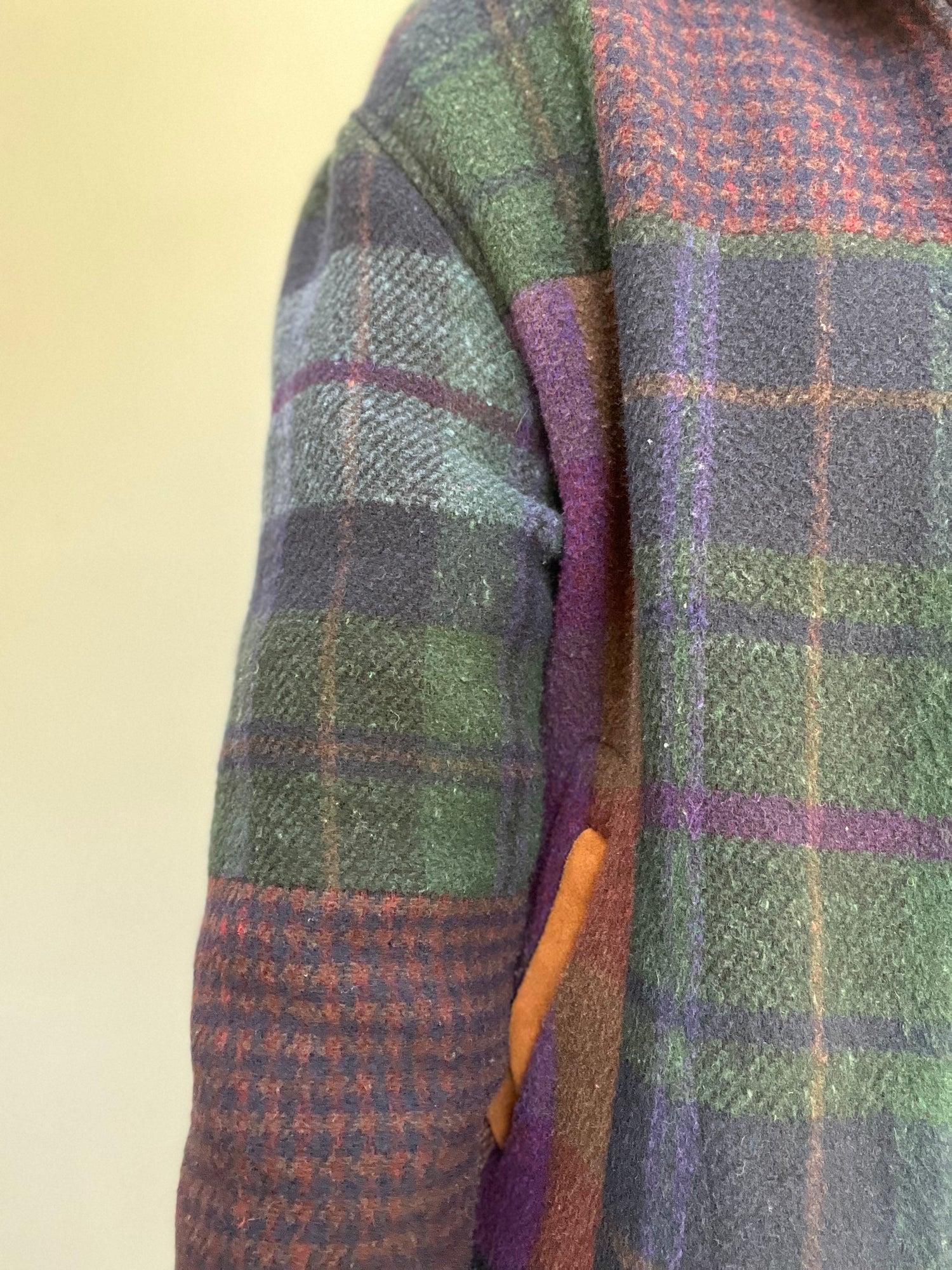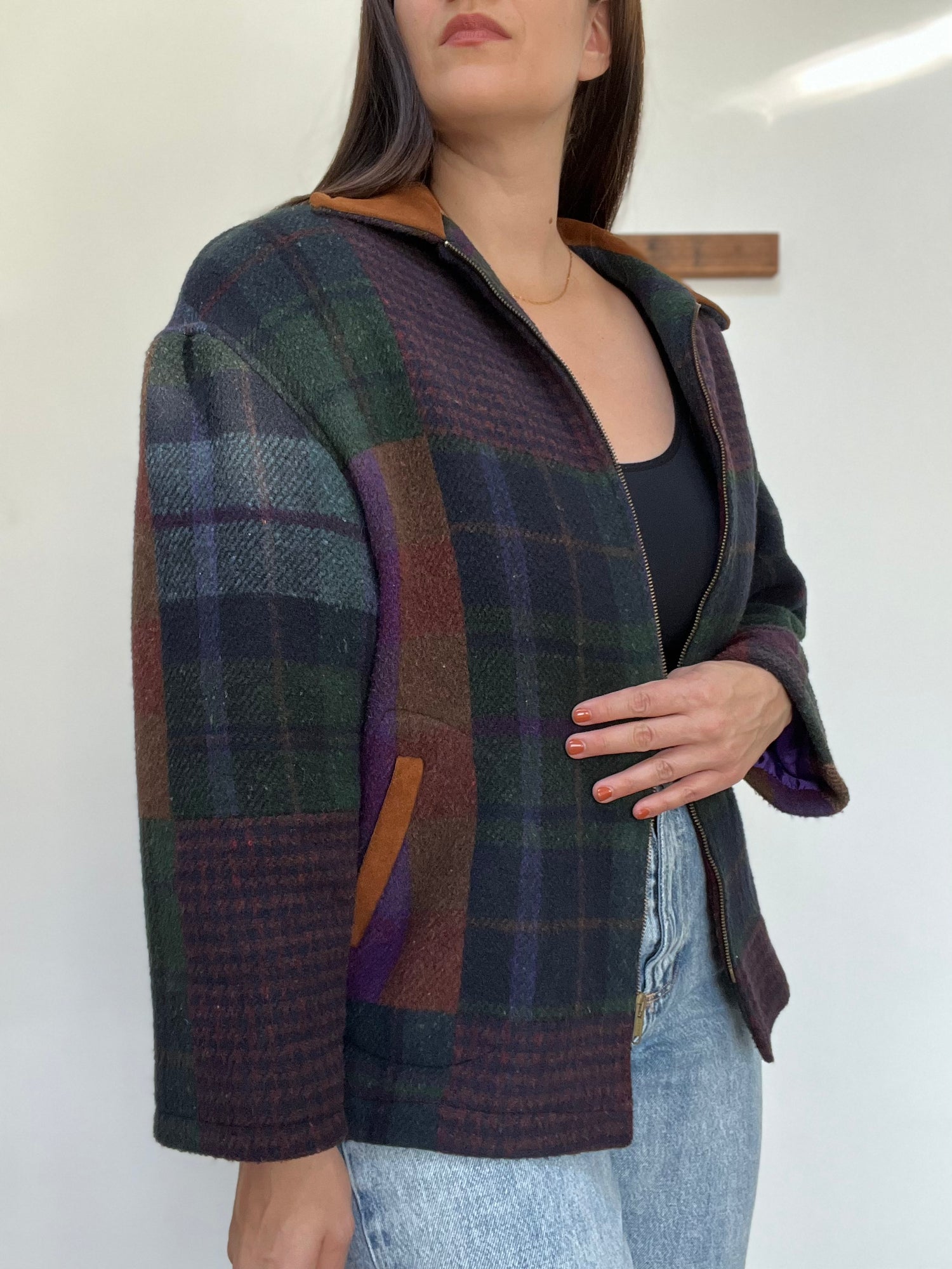A gorgeous wool barn chore jacket with rich, fall colours. Hunter green, plum purple, navy blue caramel browns and pops of juicy maroon - this jacket is an absolute plaid stunner. Oversized sleeves and dropped shoulders, a boxy fit and completely lined. The collar, the pockets and the back buckles are 100% suede leather and really pop with their bright, brown sugar colour. This will be a forever jacket.