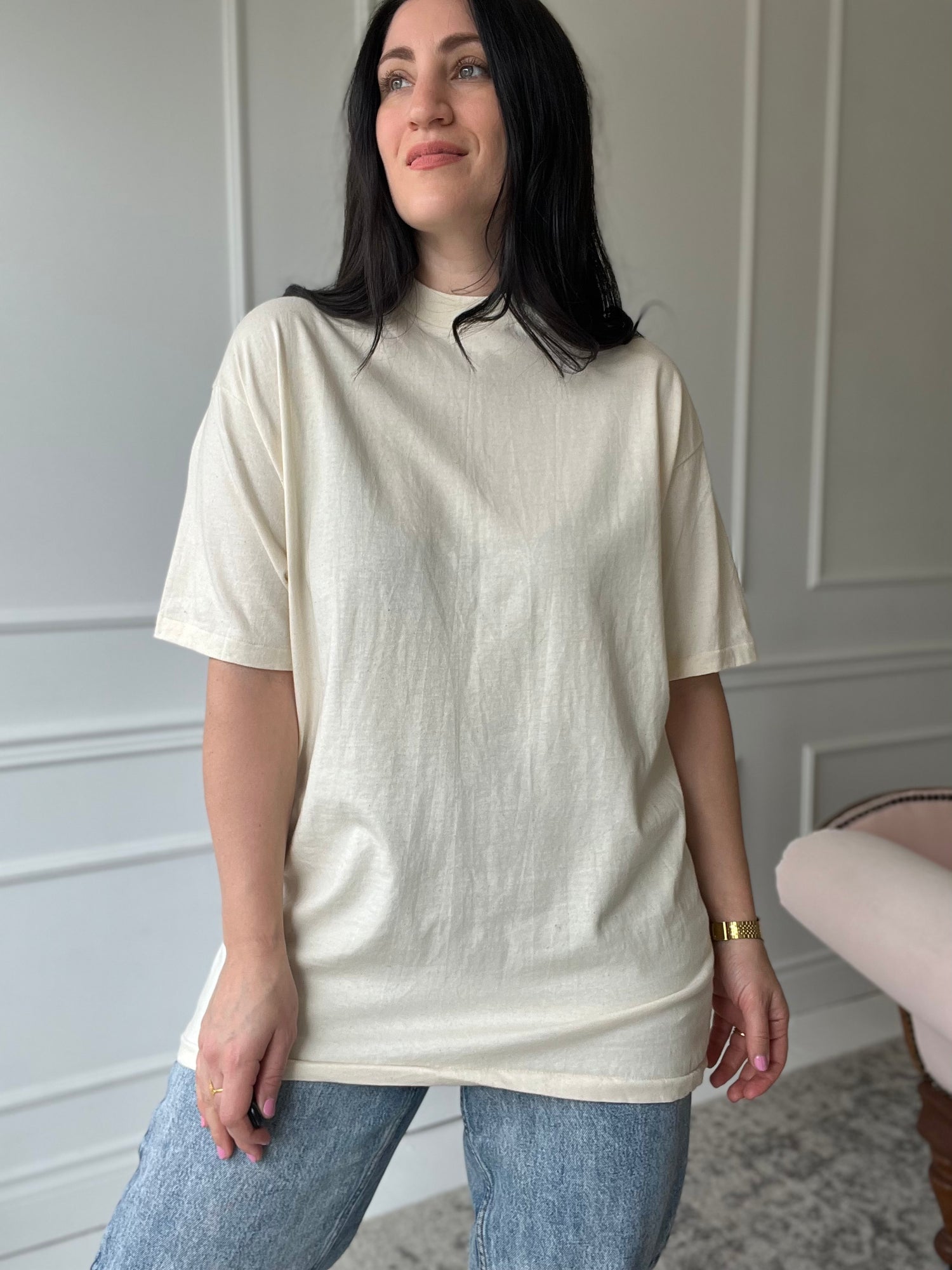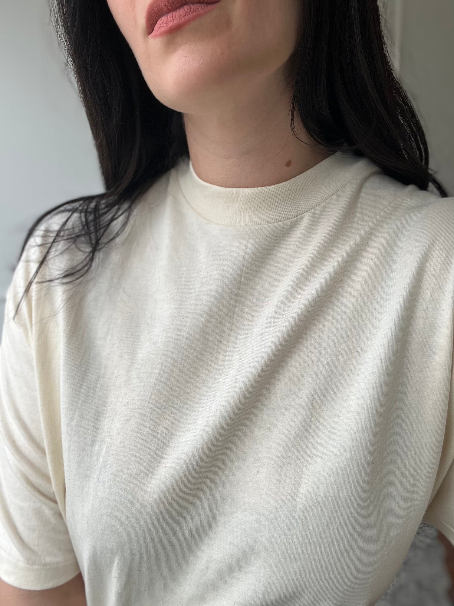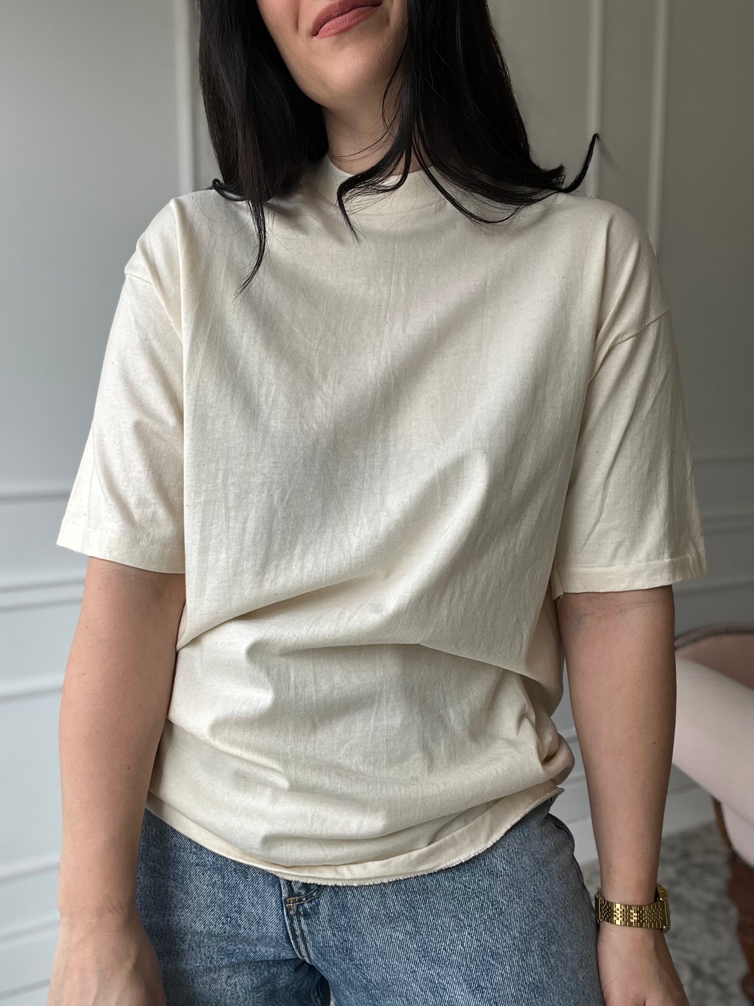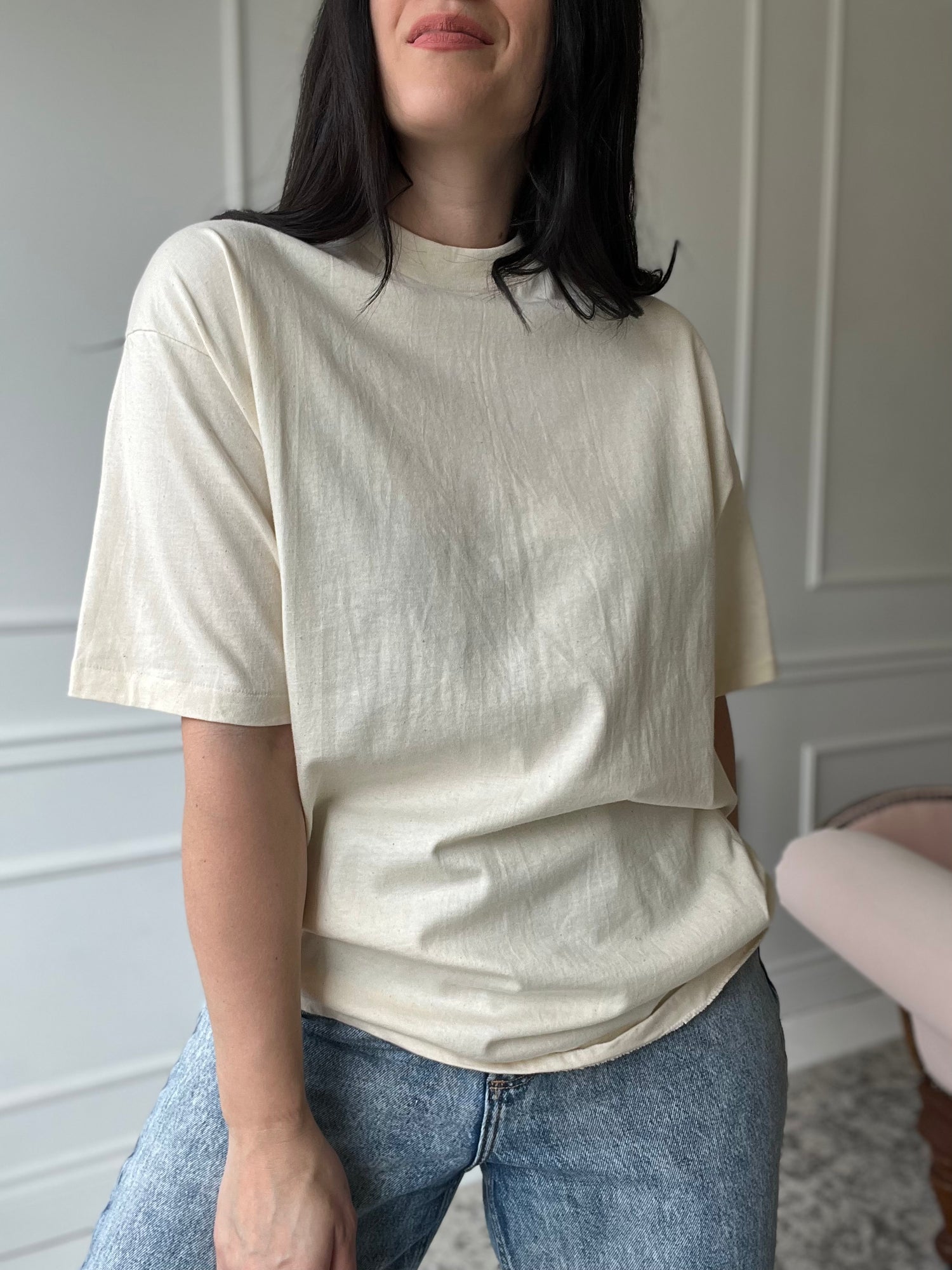 Have you ever owned a 100% Hanes, cotton Beefy T t-shirt? It's the softest, most perfect vintage relaxed material out there. (They just don't make them like this anymore, kids!). But seriously, this t-shirt is a brand new, perfect every-day go-to t-shirt that I promise will carry you for years to come. (You know ... that favourite tee you always want to wear ... this is it). A gorgeous beige with slight oatmeal speckle throughout.