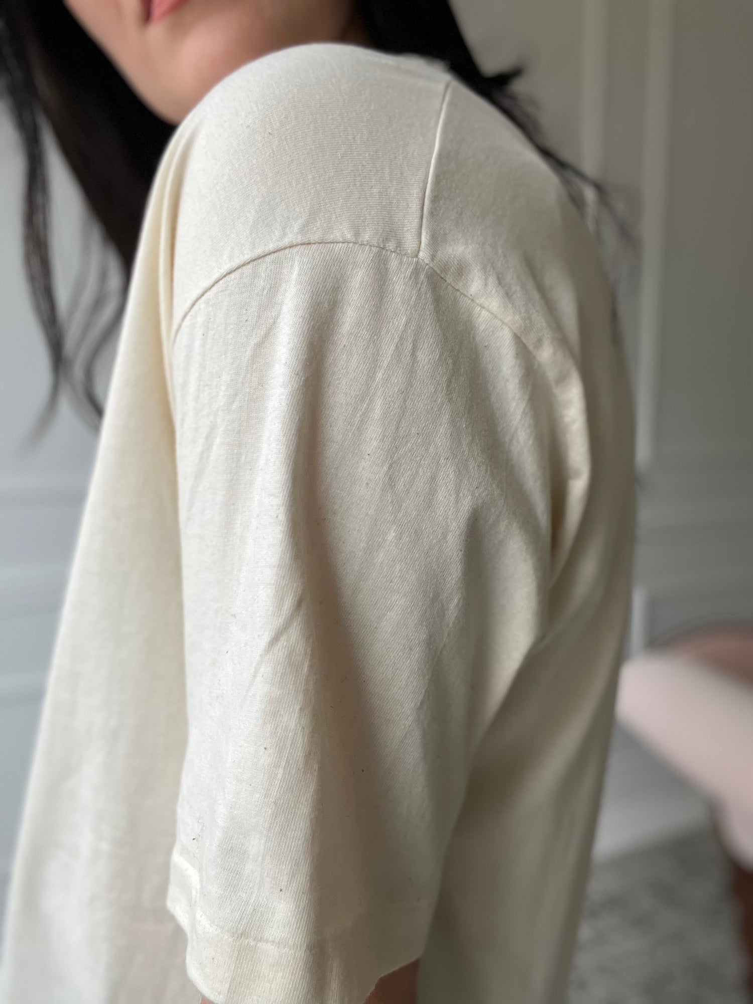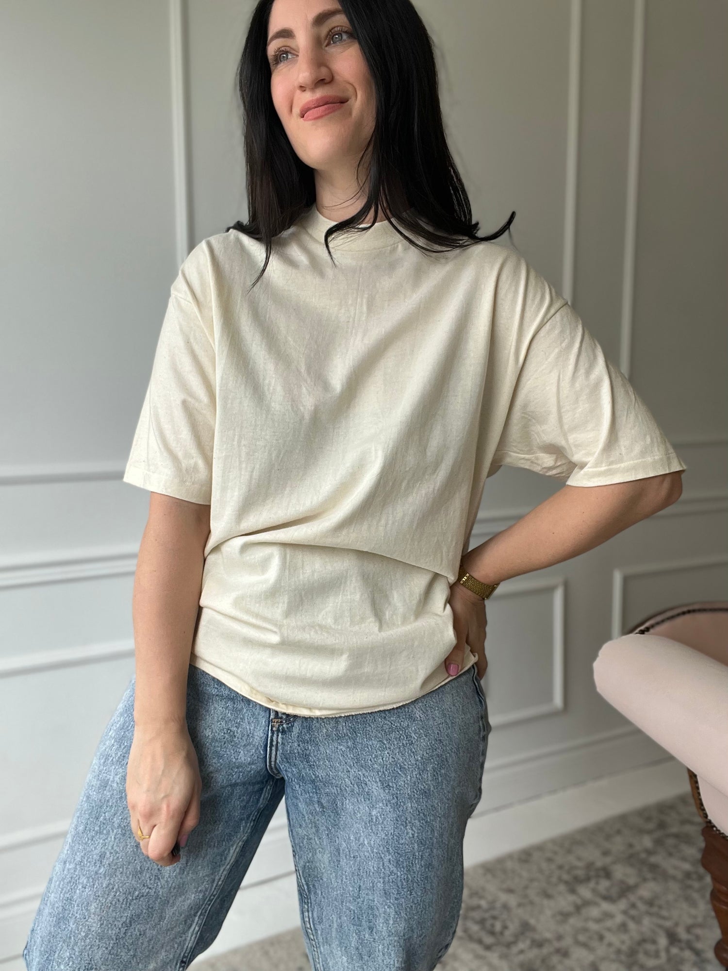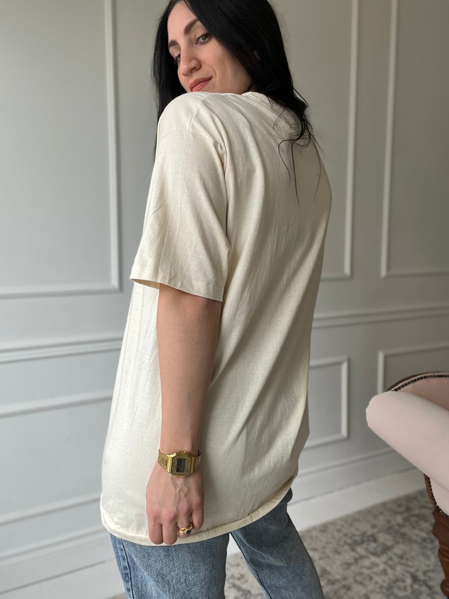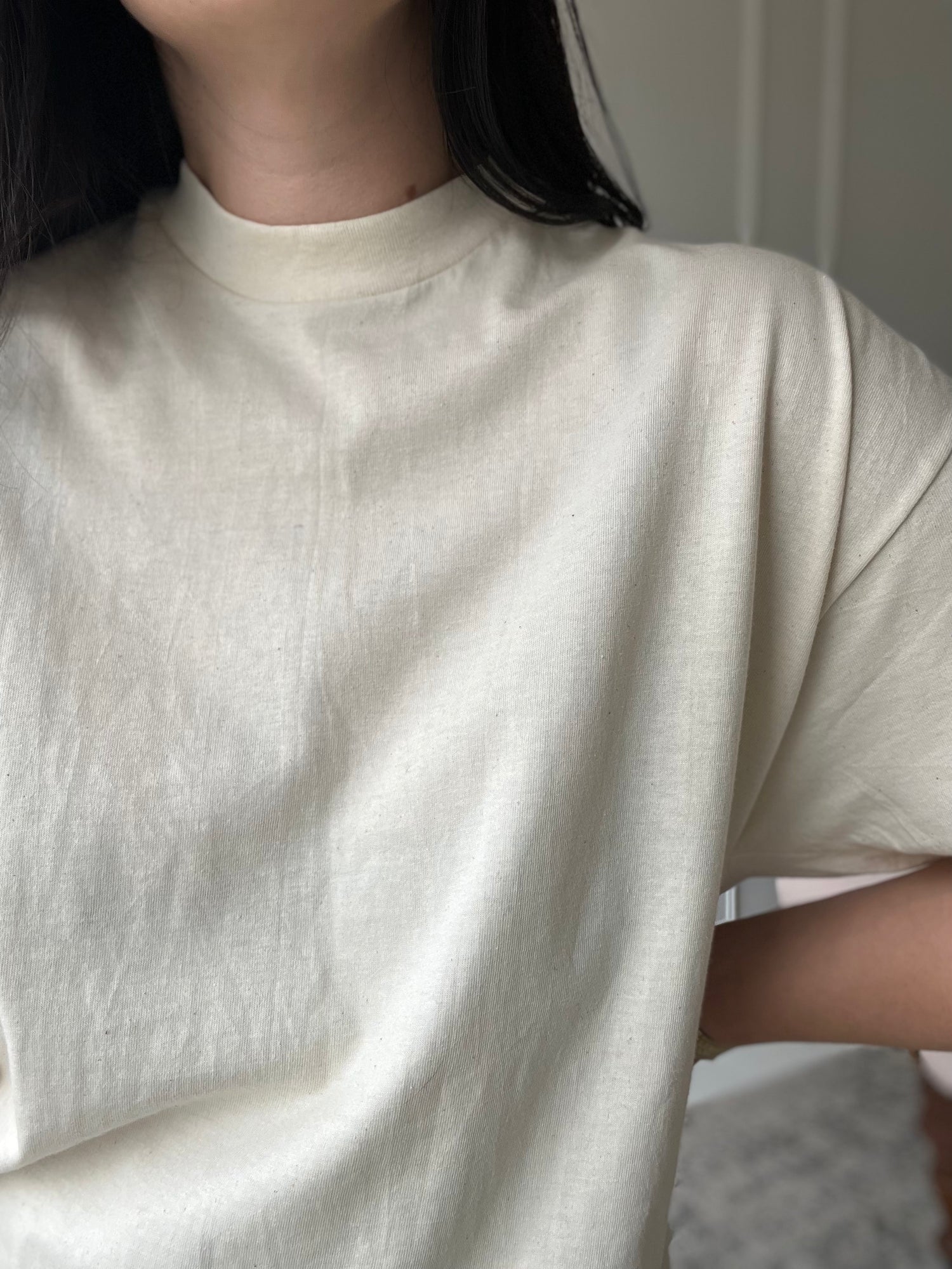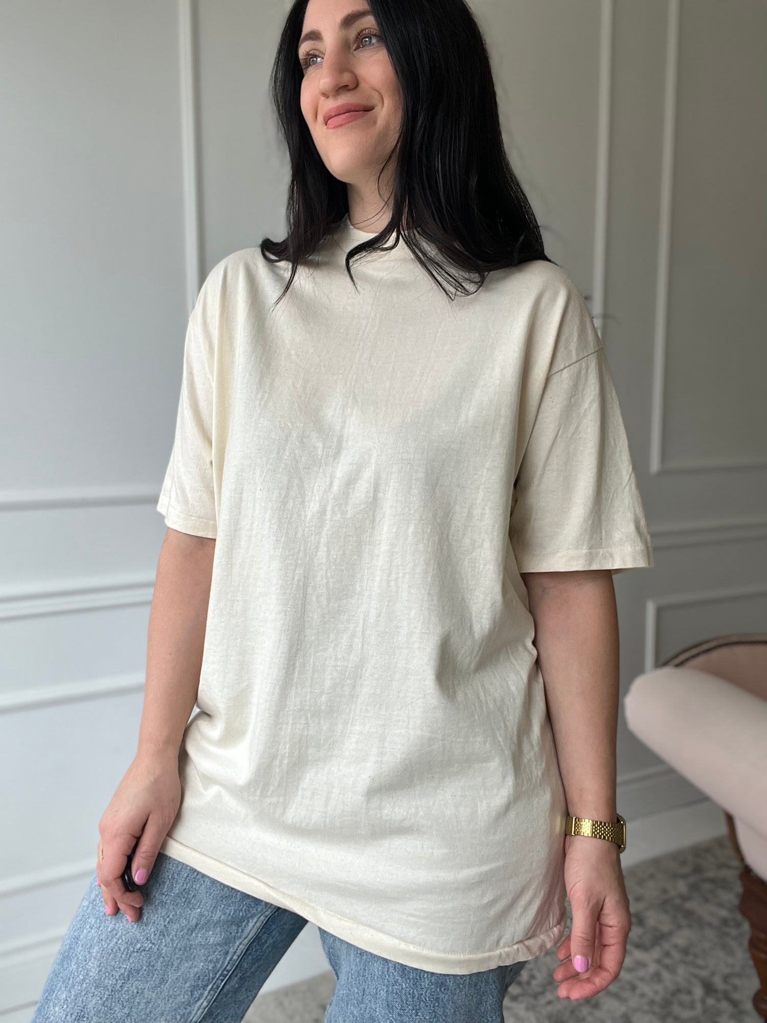 Have you ever owned a 100% Hanes, cotton Beefy T t-shirt? It's the softest, most perfect vintage relaxed material out there. (They just don't make them like this anymore, kids!). But seriously, this t-shirt is a brand new, perfect every-day go-to t-shirt that I promise will carry you for years to come. (You know ... that favourite tee you always want to wear ... this is it). A gorgeous beige with slight oatmeal speckle throughout.