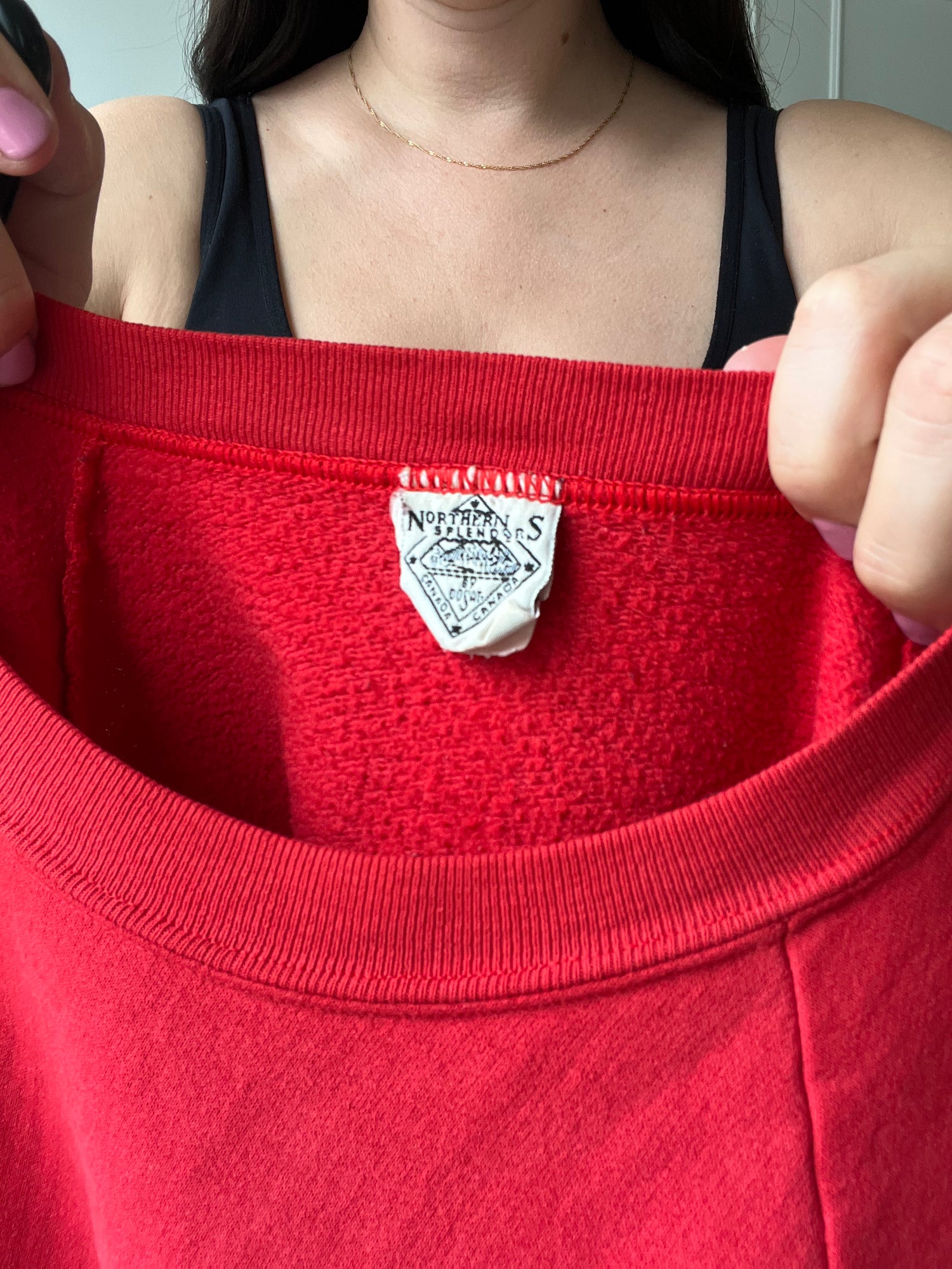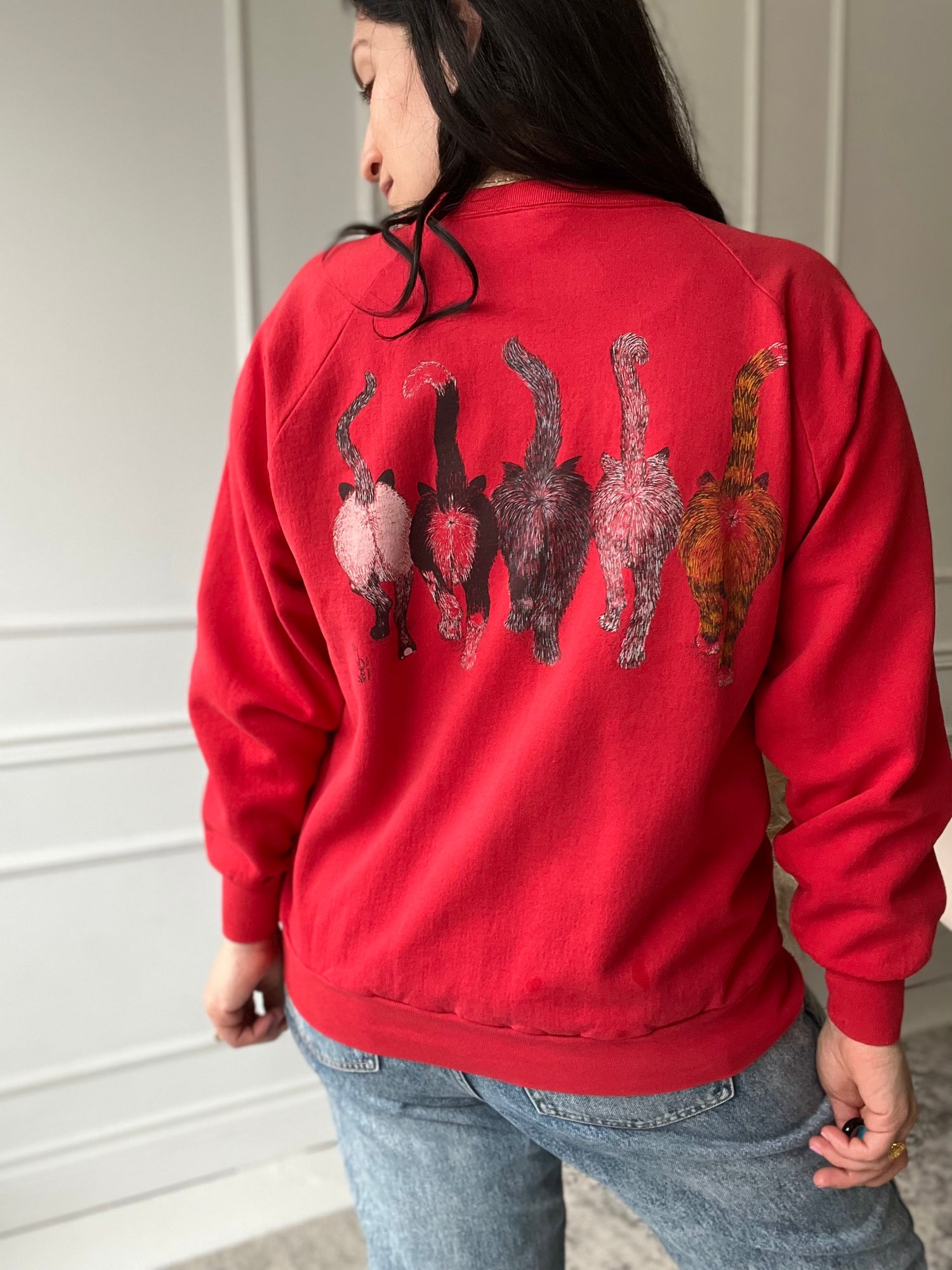 Meow! The cat pack is coming. A bright cherry red crewneck sweater with 5 cats on the front, and back. In perfect condition. This sweater is tagged a small, but fits oversized like a medium, or even a small large depending on desired fit. PS - this beauty is made in Canada.